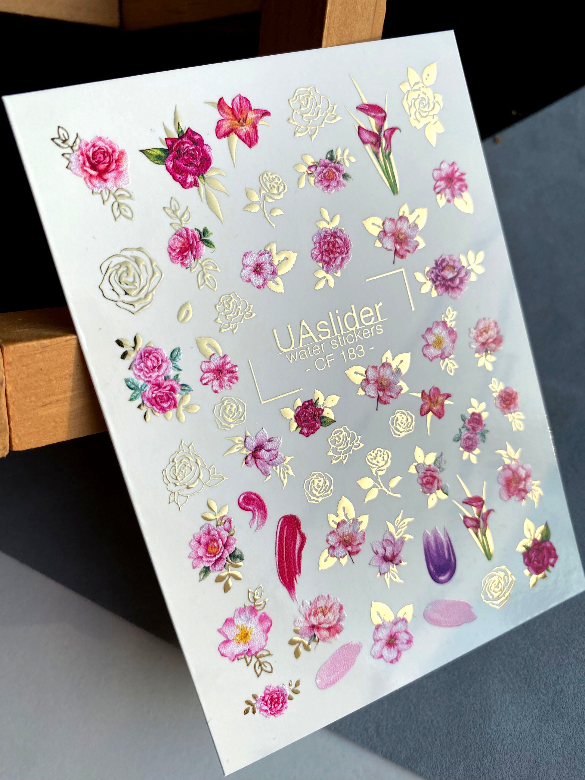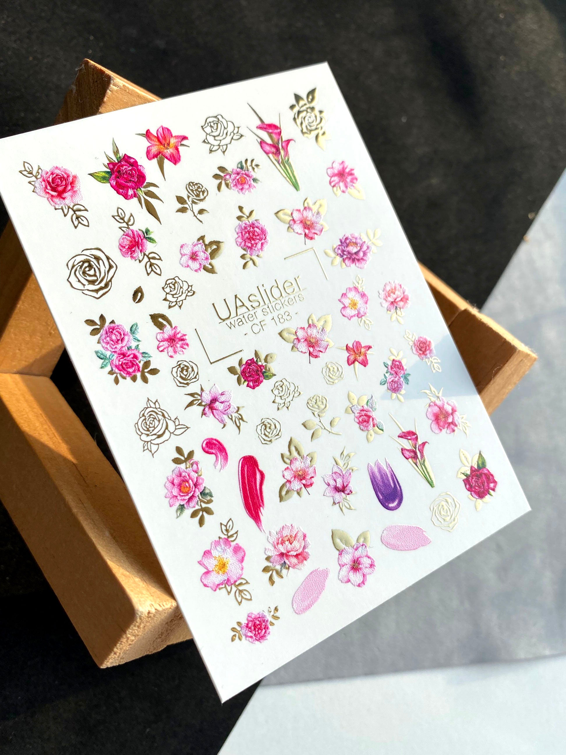 ملصق مائي للأظافر CF-183 | ملصقات مائية للأظافر | زهور وردية وحمراء مع تفاصيل ذهبية
