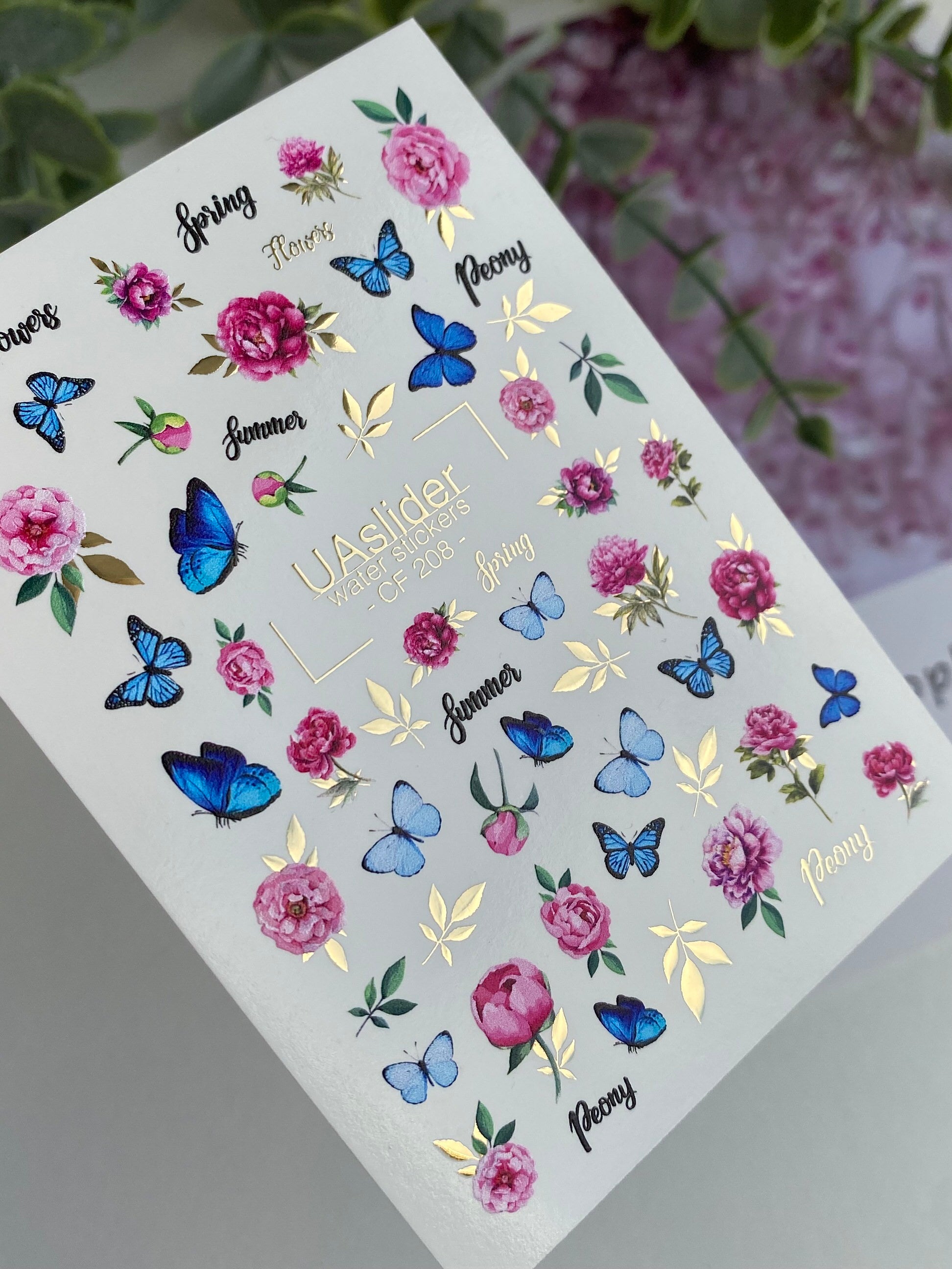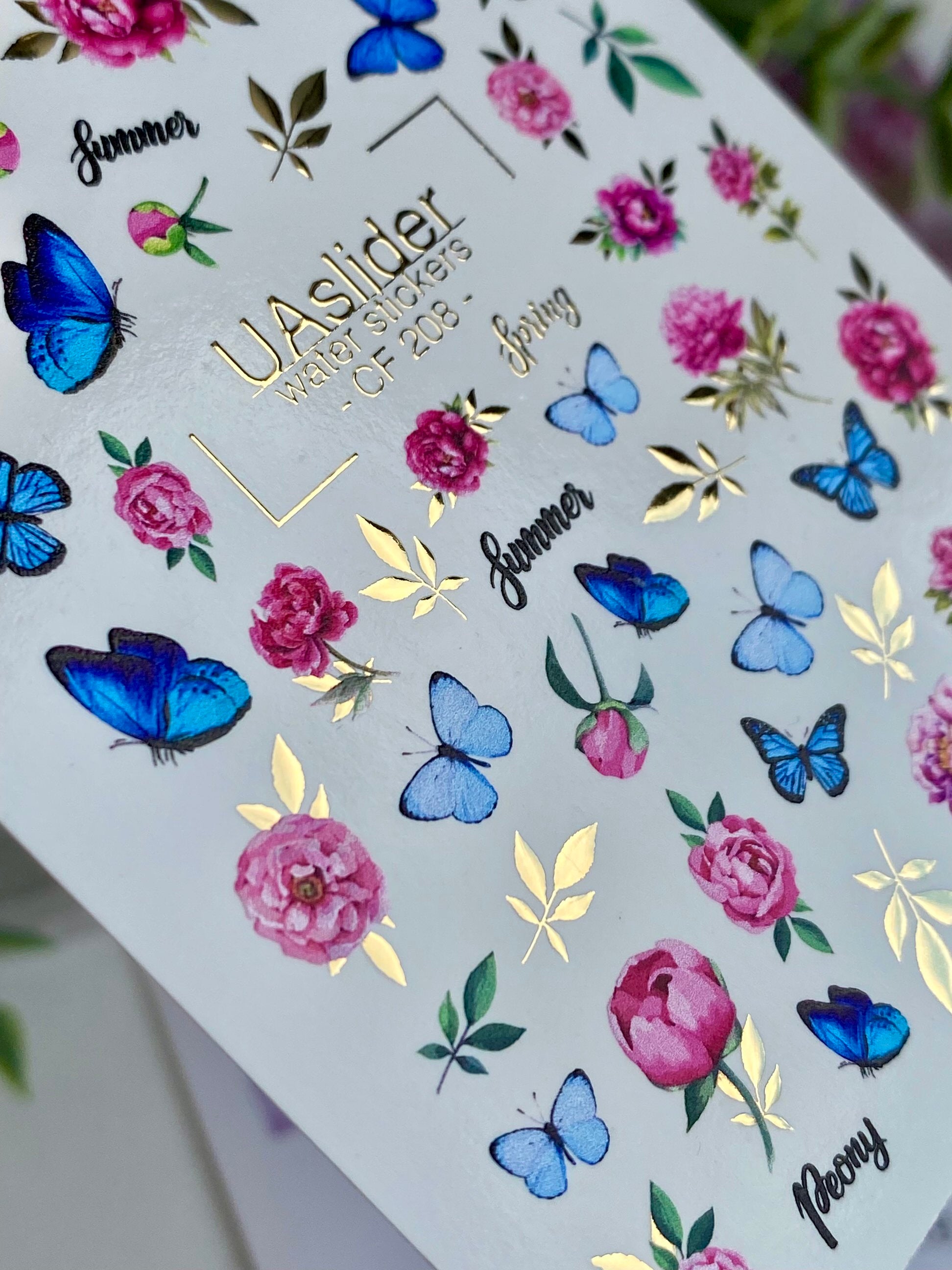 ملصق مائي للأظافر CF-208 | ملصقات مائية للأظافر | أزهار الفاونيا والفراشات الزرقاء مع ورق ذهبي