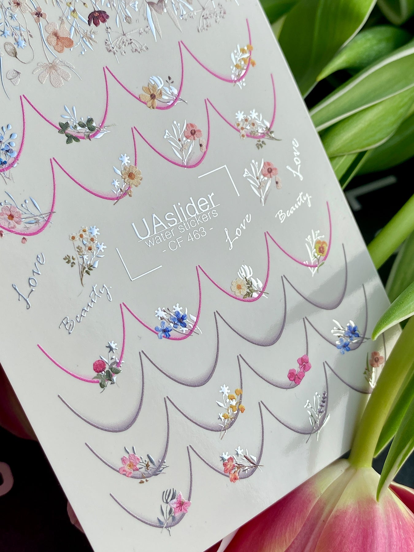 ملصق أظافر مائي CF-463 | ملصقات أظافر فرنسية منزلقة مائية | أطراف فرنسية مزهرة بأزهار برية بألوان الباستيل