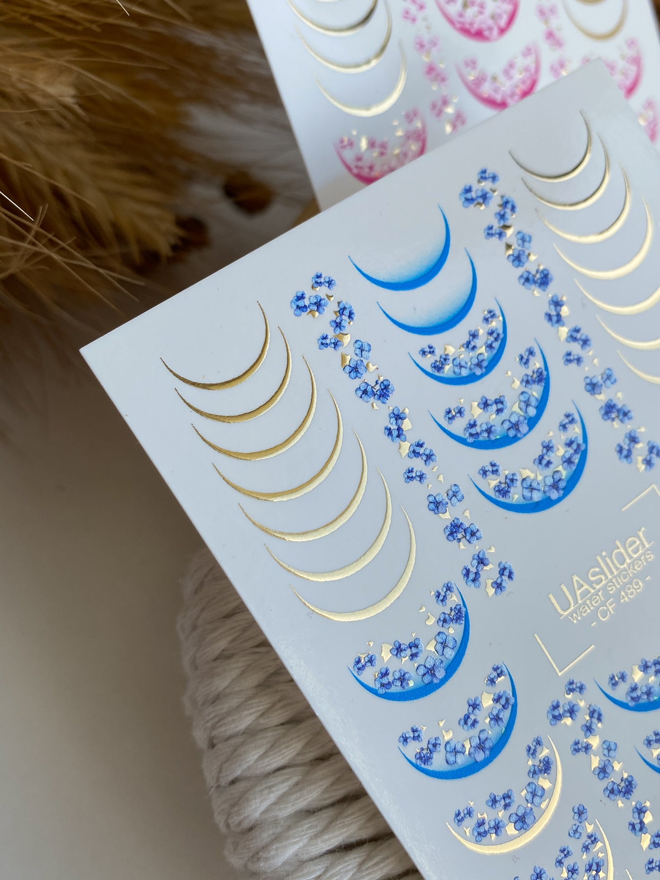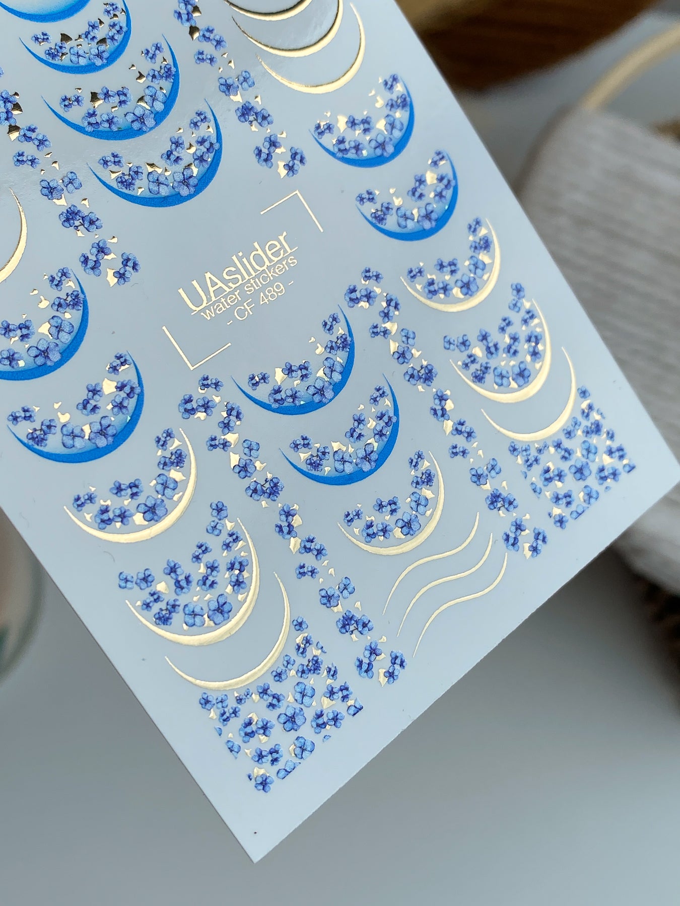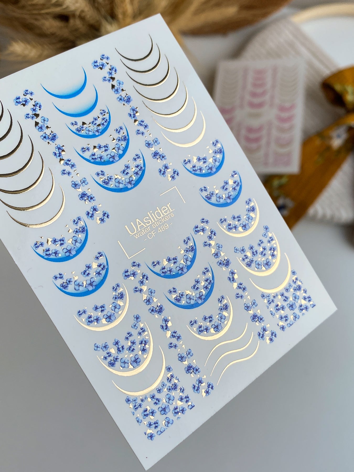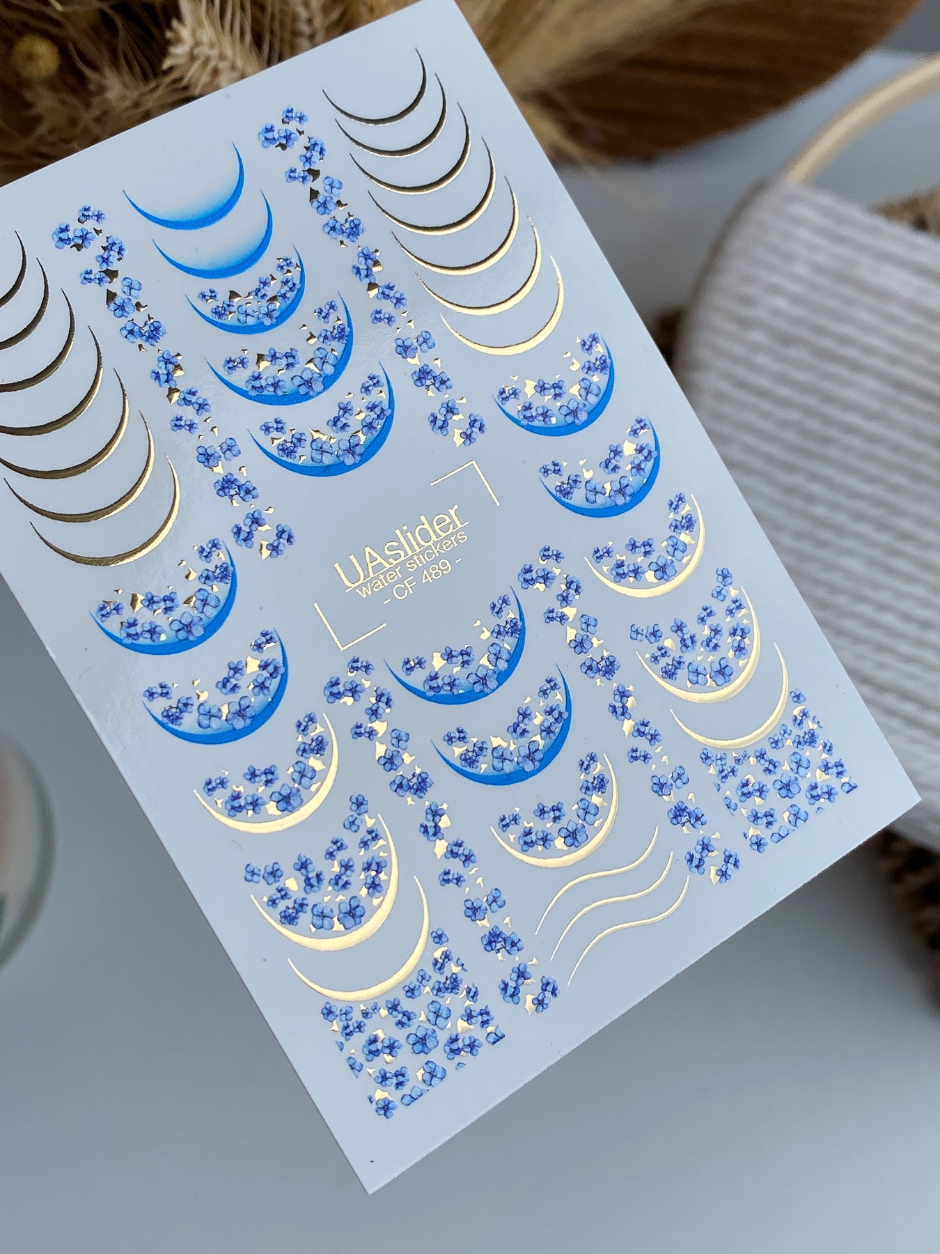 ملصق ماء للأظافر CF-489 | ملصقات ماء للأظافر زرقاء بنمط "لا تنسني" مع لمسات ذهبية | تصميم فرنسي زهريCF_489