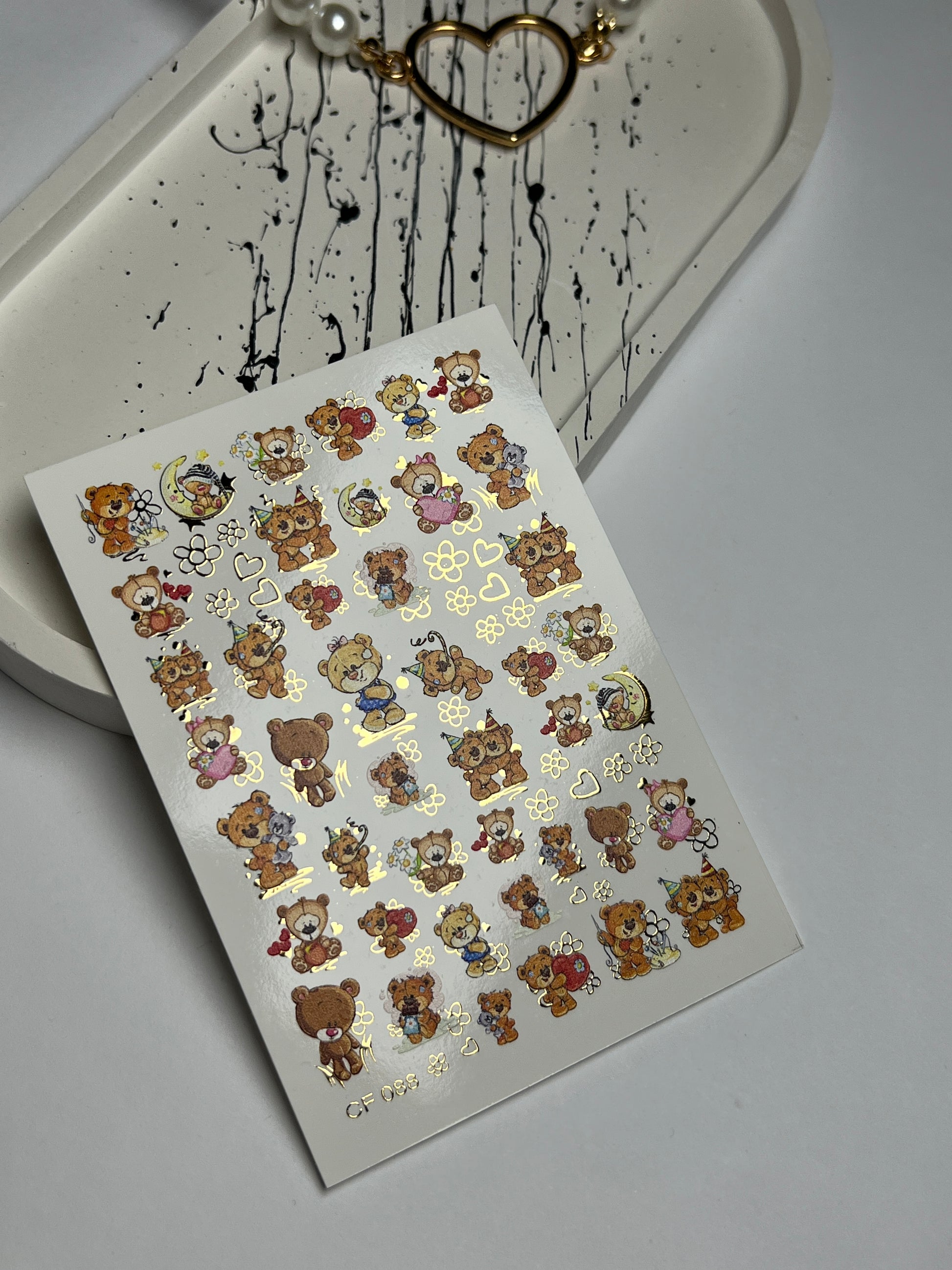 Roztomilé vodolepky na nehty s motivem medvídků, které obsahují hravé vzory: medvídky s dárky, spící medvídky na měsíci, narozeninové čepice, srdíčka, květiny a roztomilé drobnosti. Jasně barevné se zlatými fóliovými akcenty, ideální pro vytvoření sladkého a veselého nail artu na Valentýna, narozeniny nebo každodenní zábavné vzhledy.