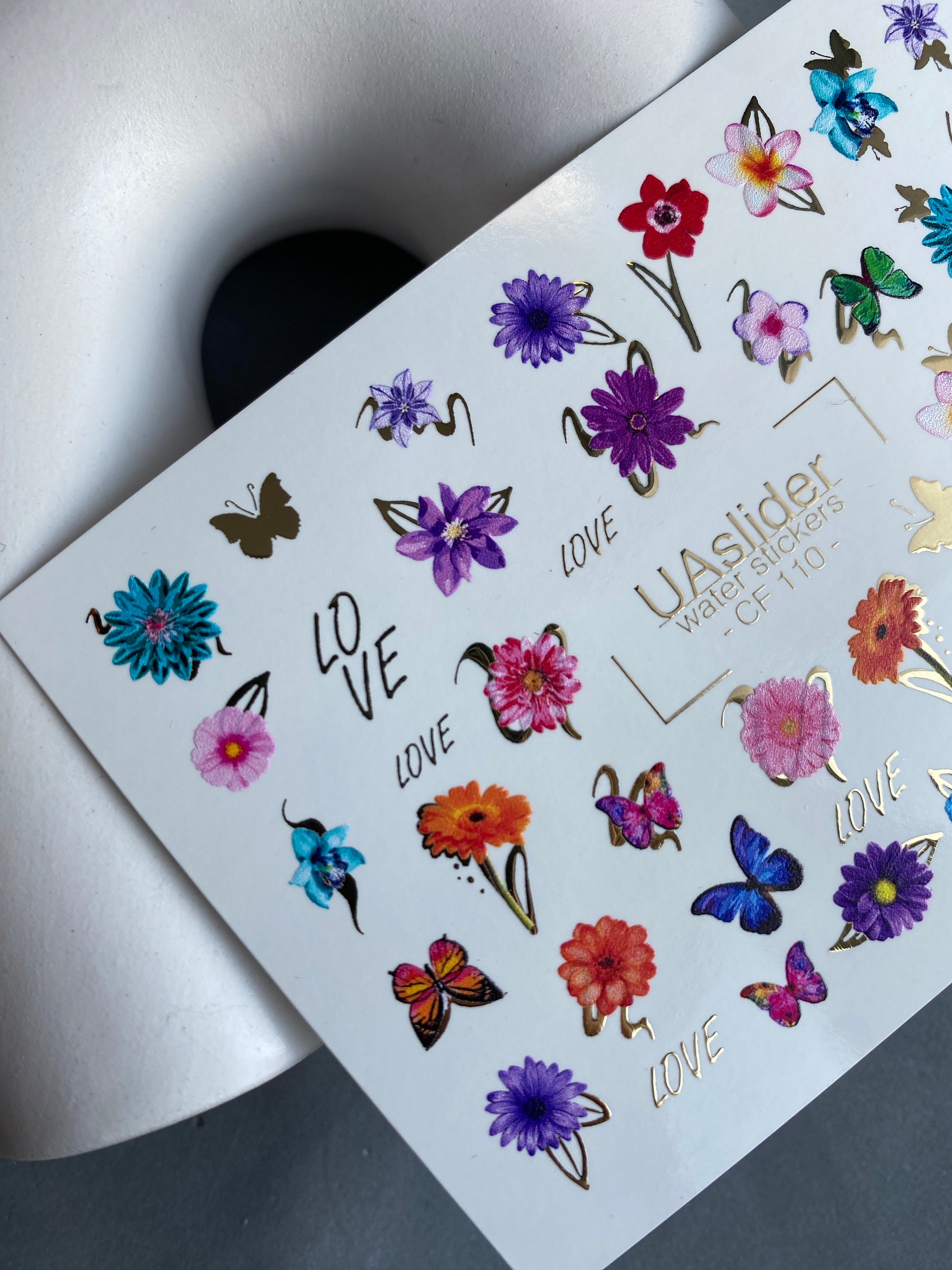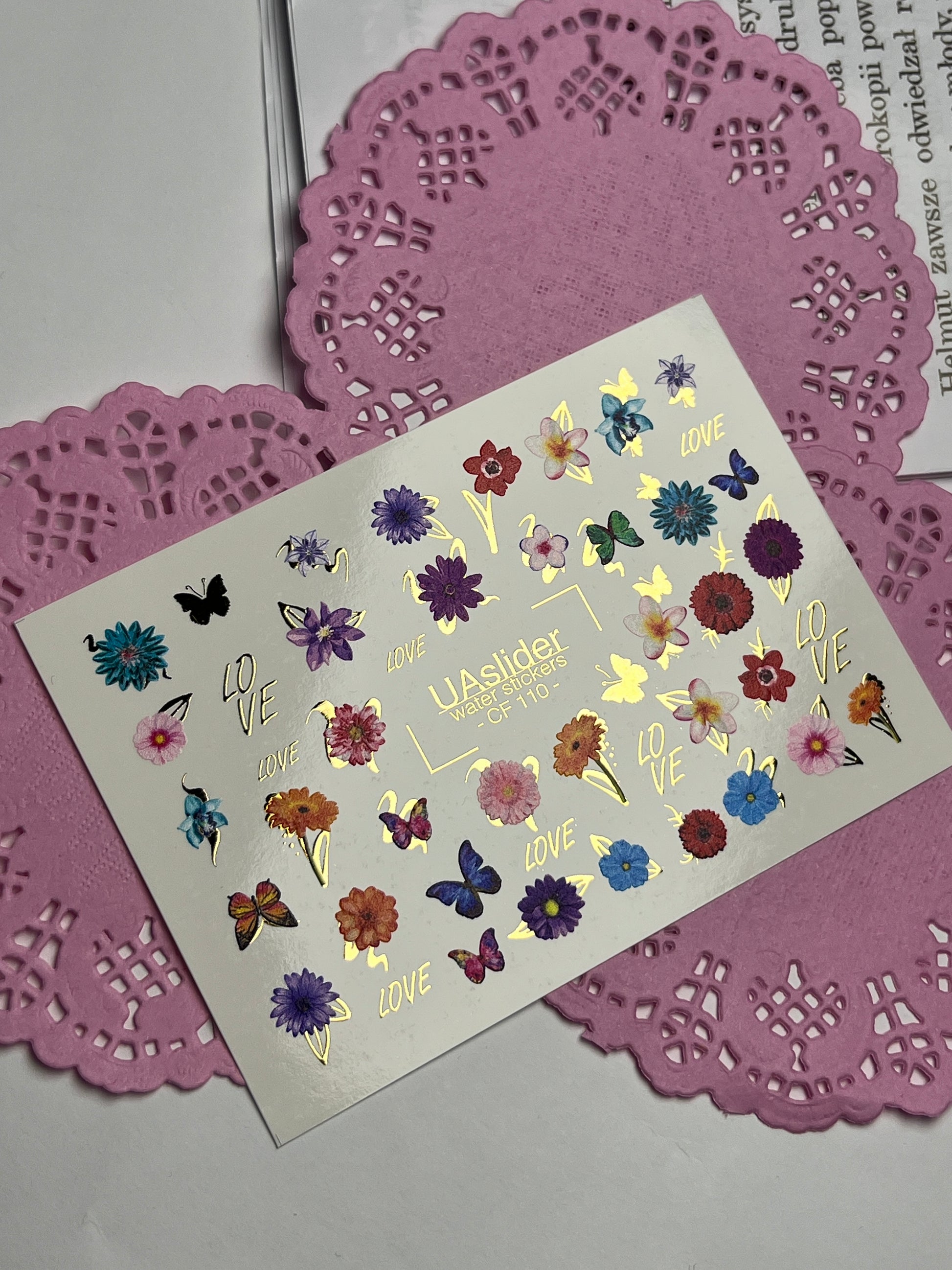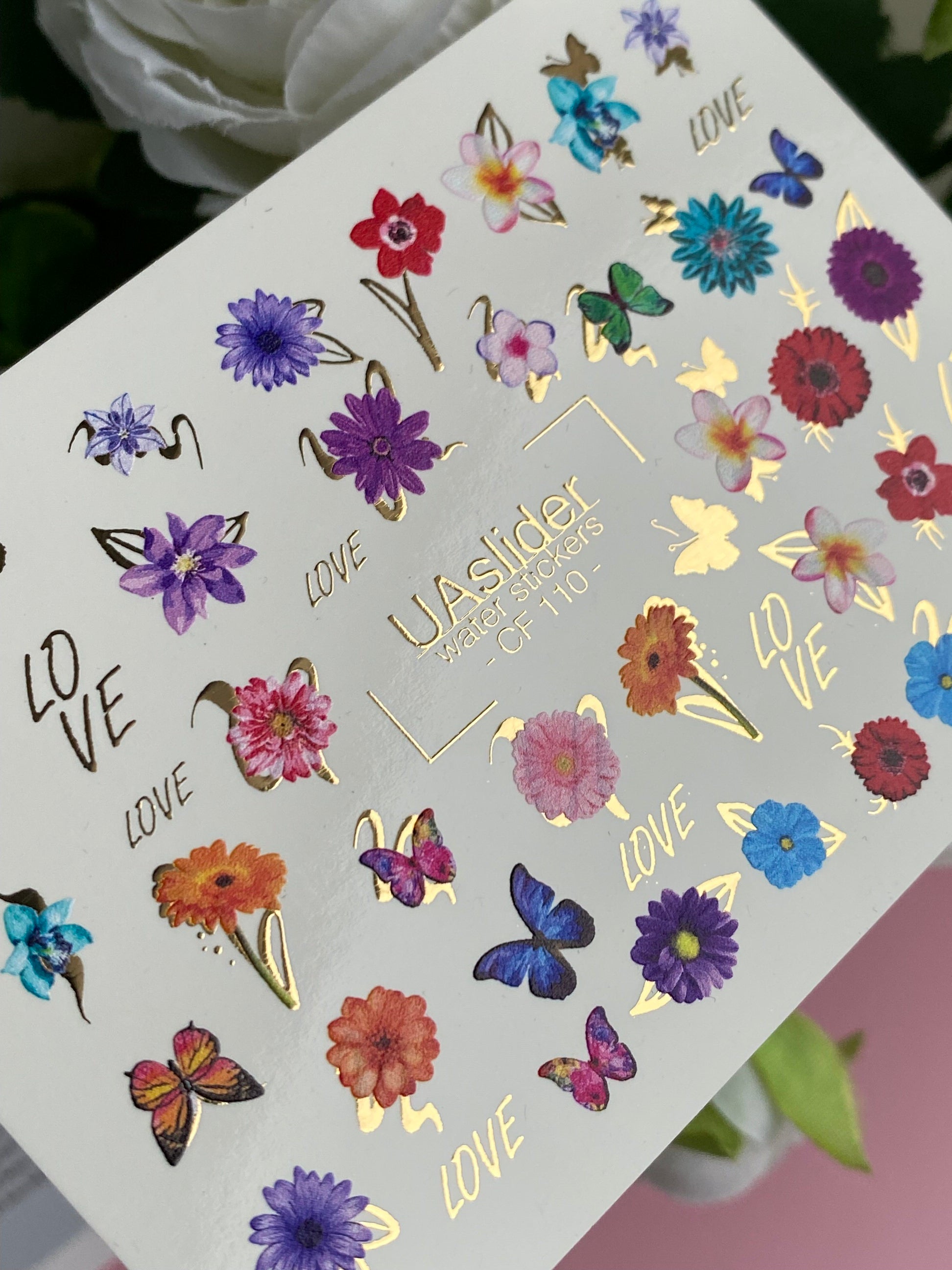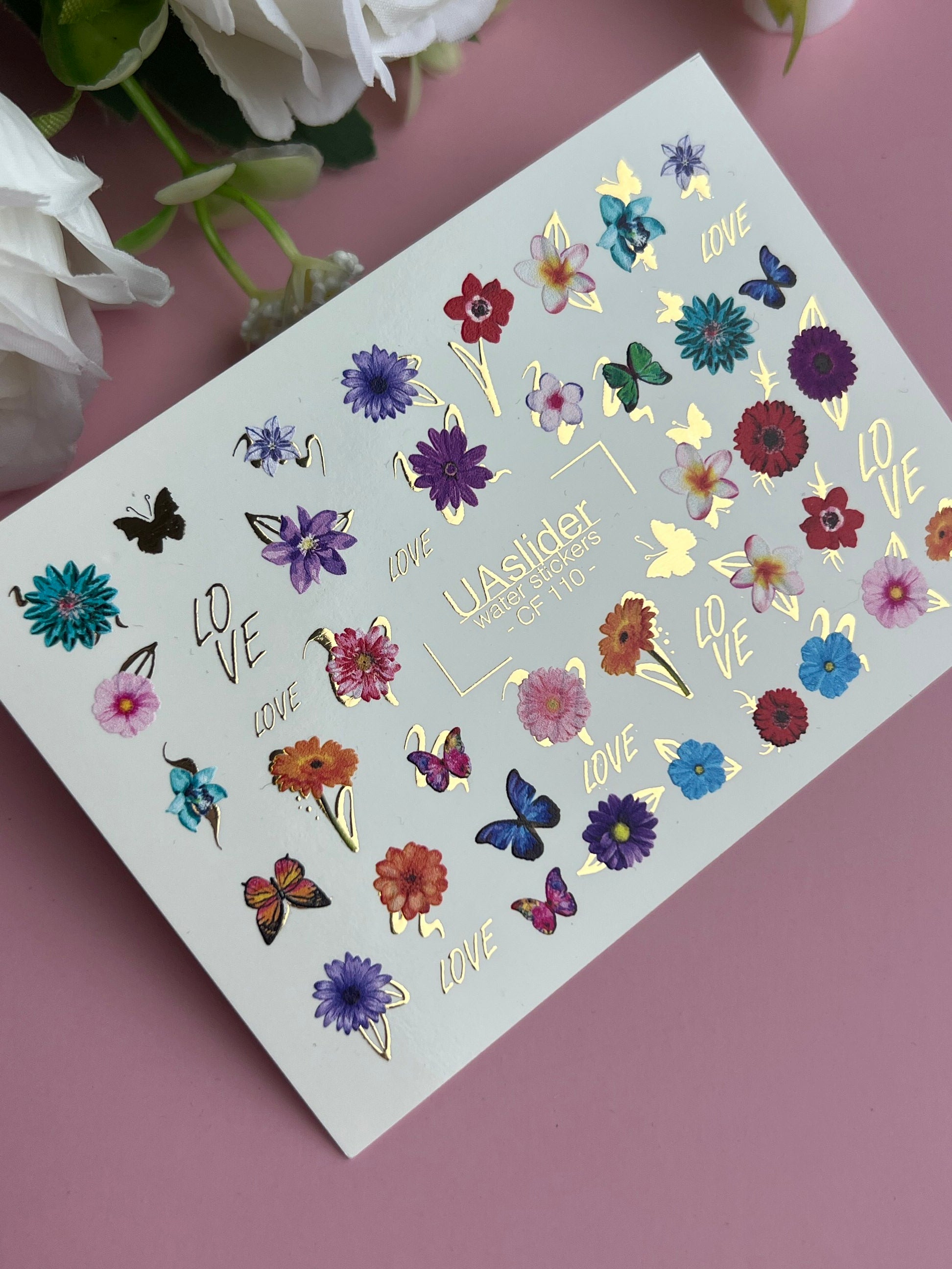 Nálepka na nehty CF-110 | Květinové vodní nálepky na nehty | Barevné květiny, motýli a nápis láskyCF_110