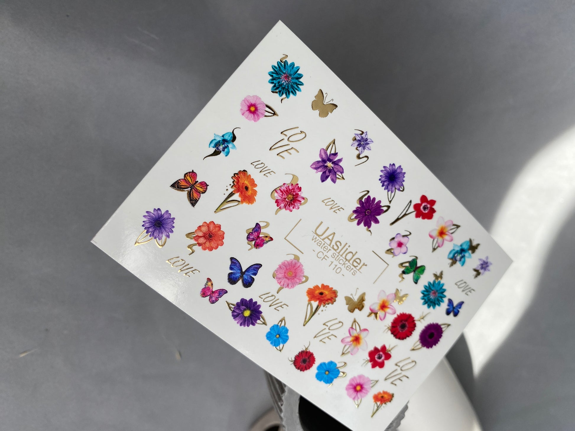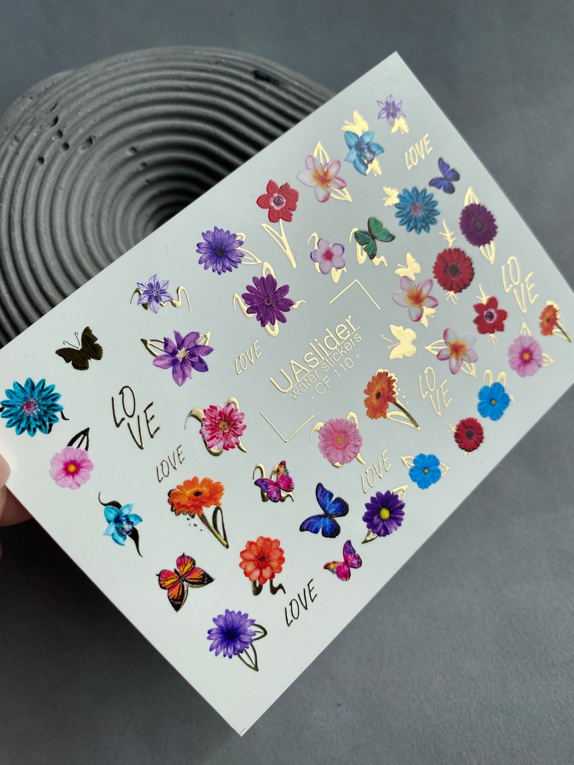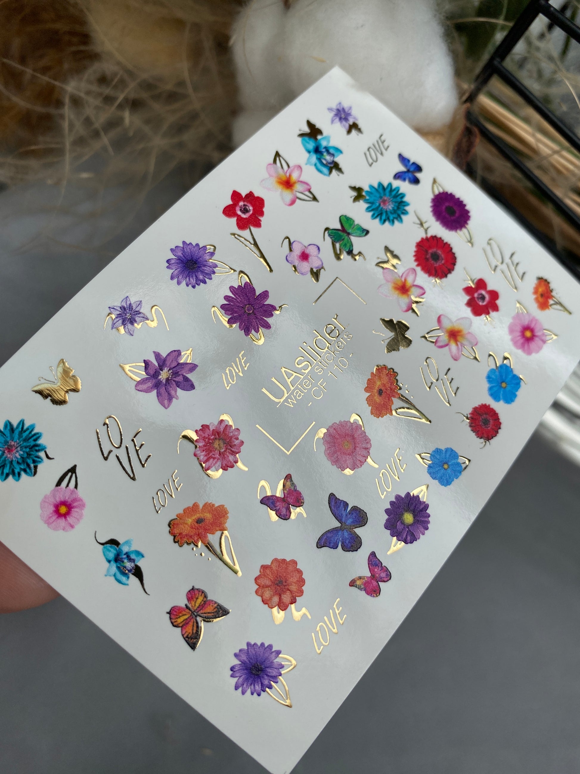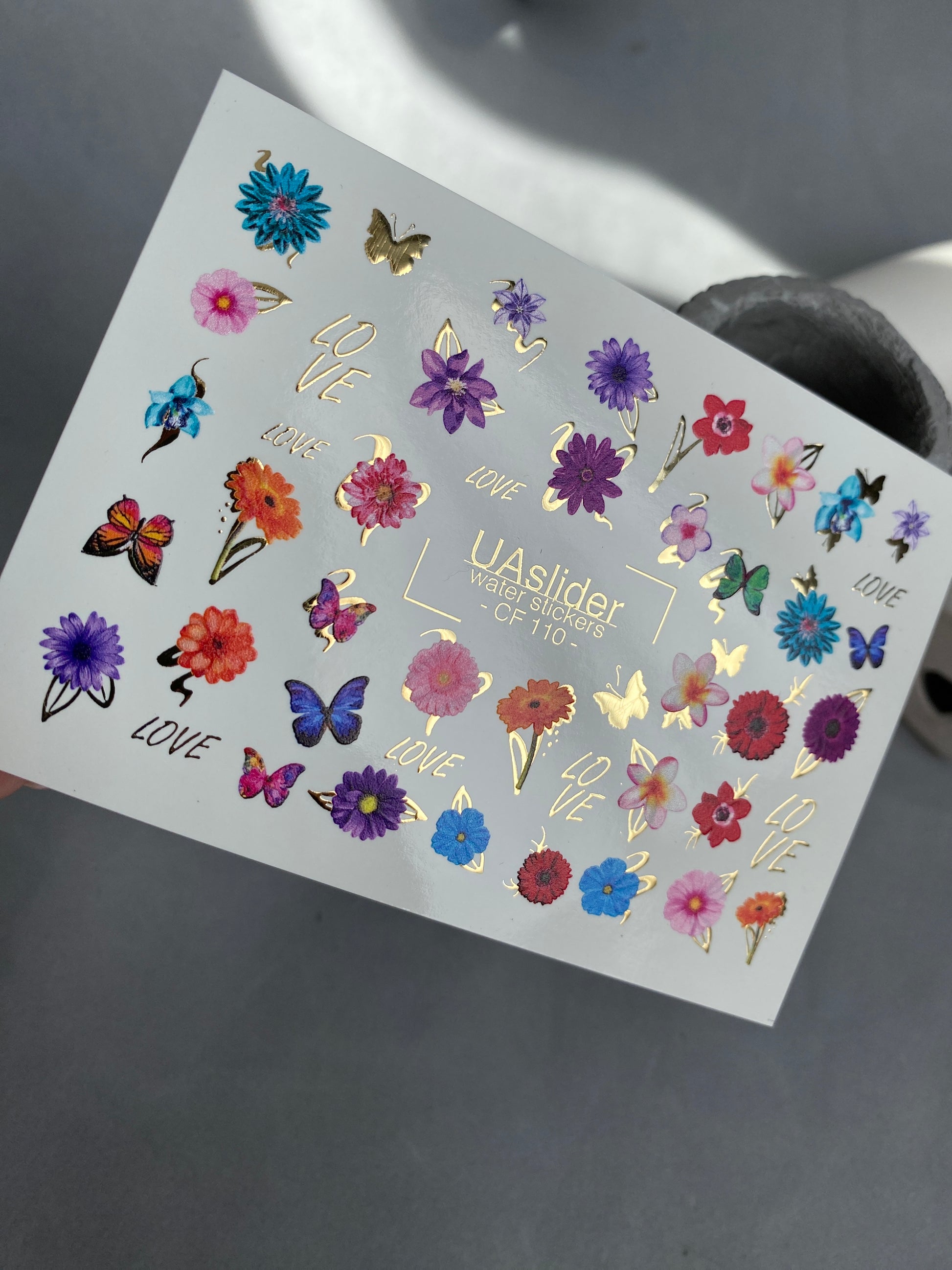 Nálepka na nehty CF-110 | Květinové vodní nálepky na nehty | Barevné květiny, motýli a nápis láskyCF_110