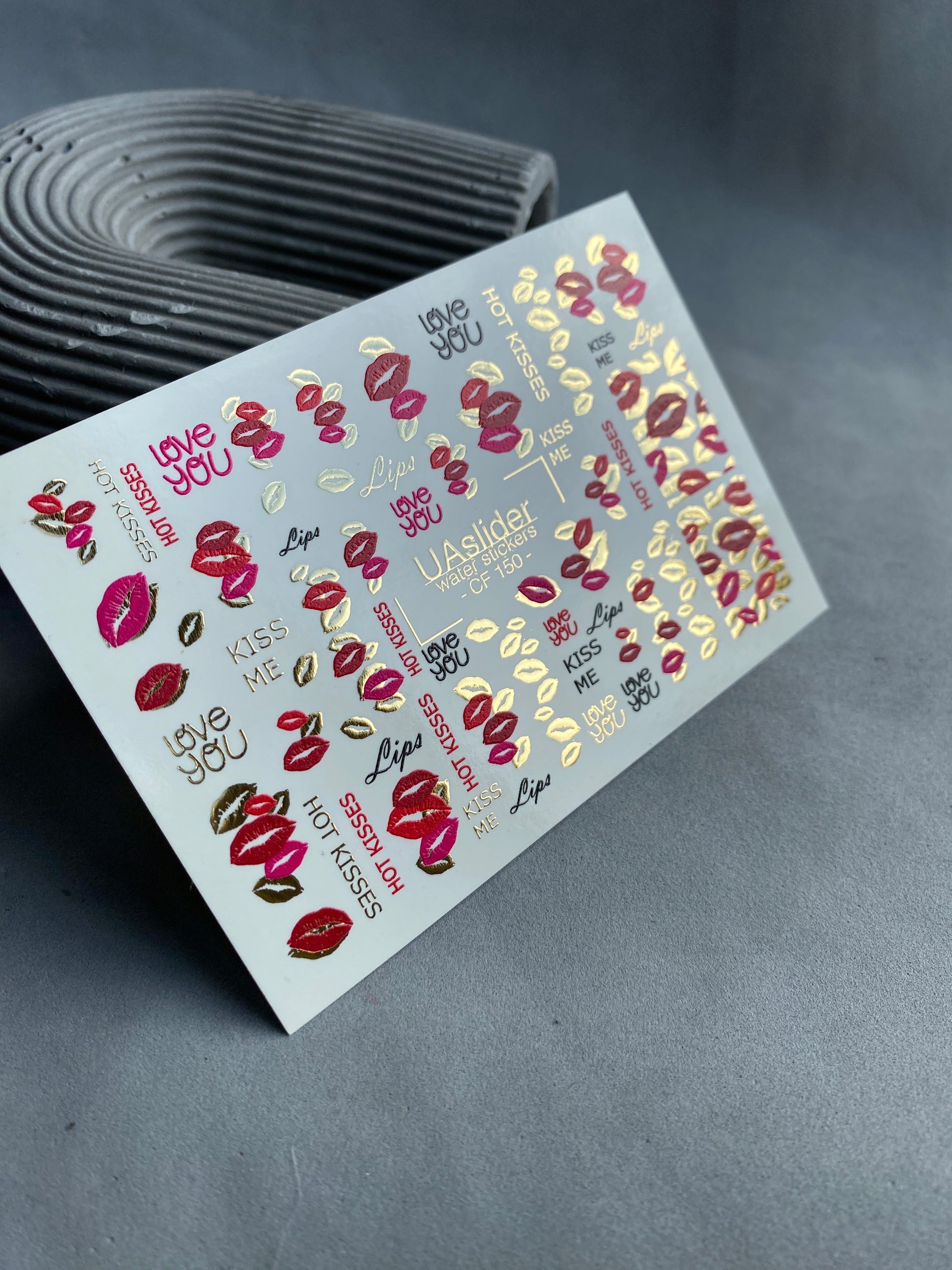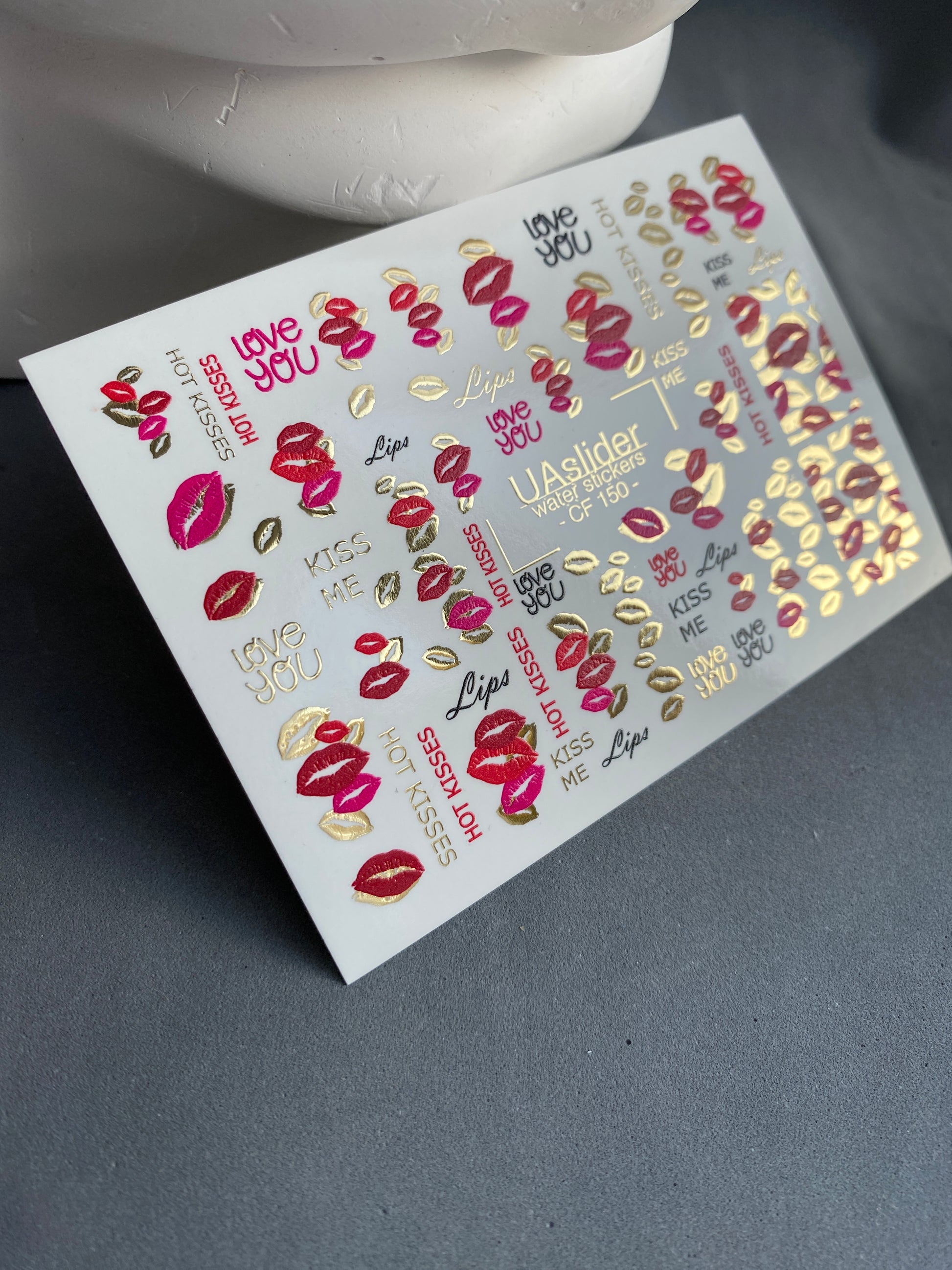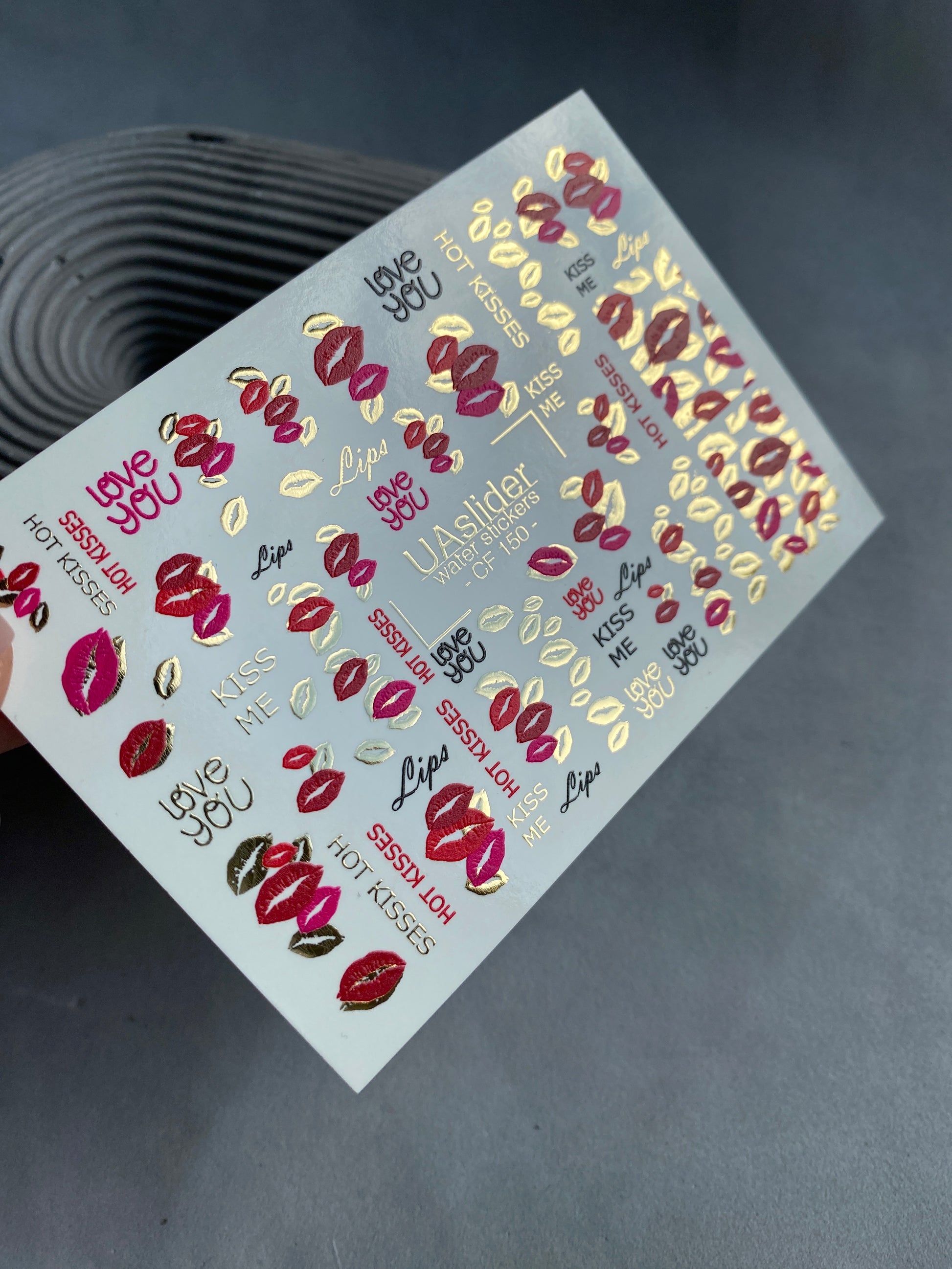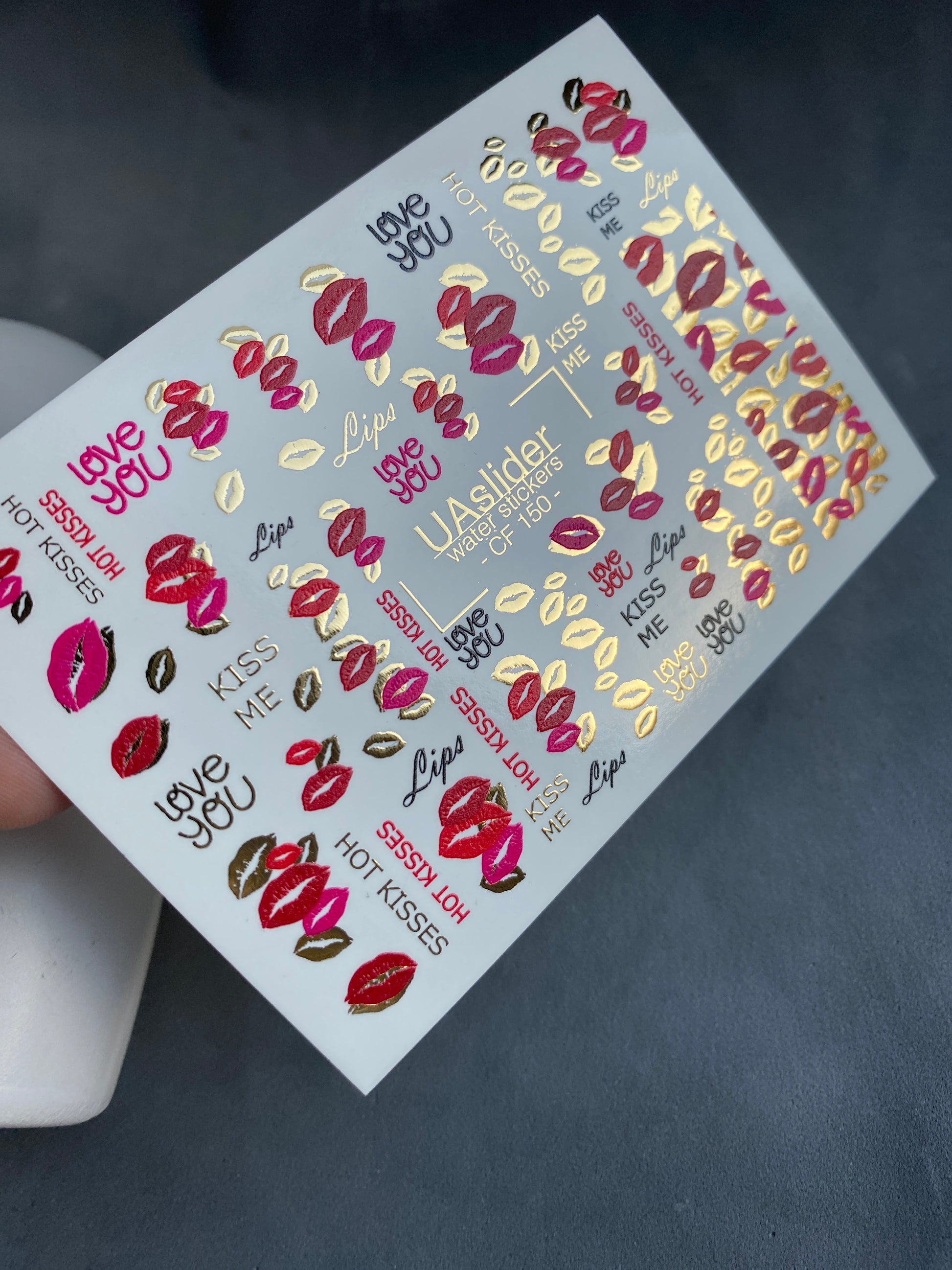 Nálepka na nehty CF-150 | Kiss Print vodní obtisky na nehty | Červené rty, milostné citáty a zlatá fólie