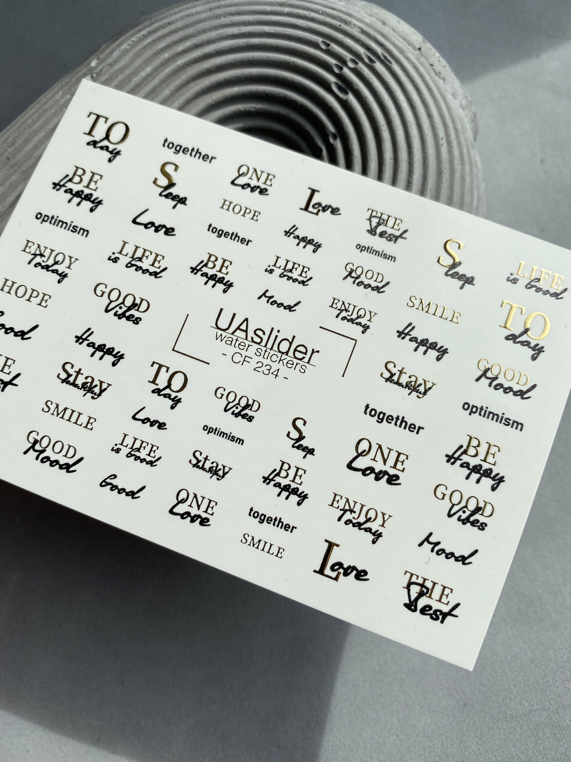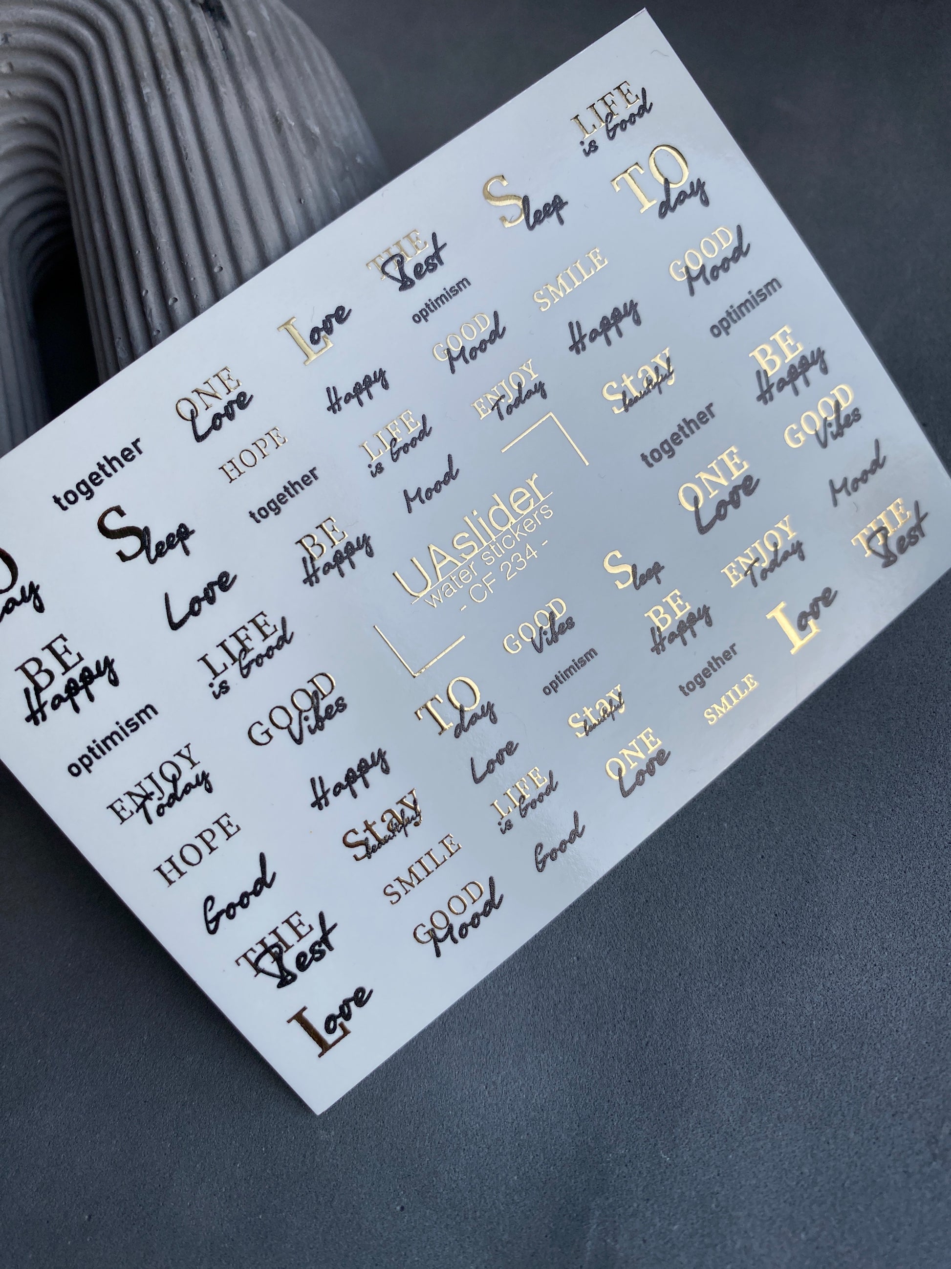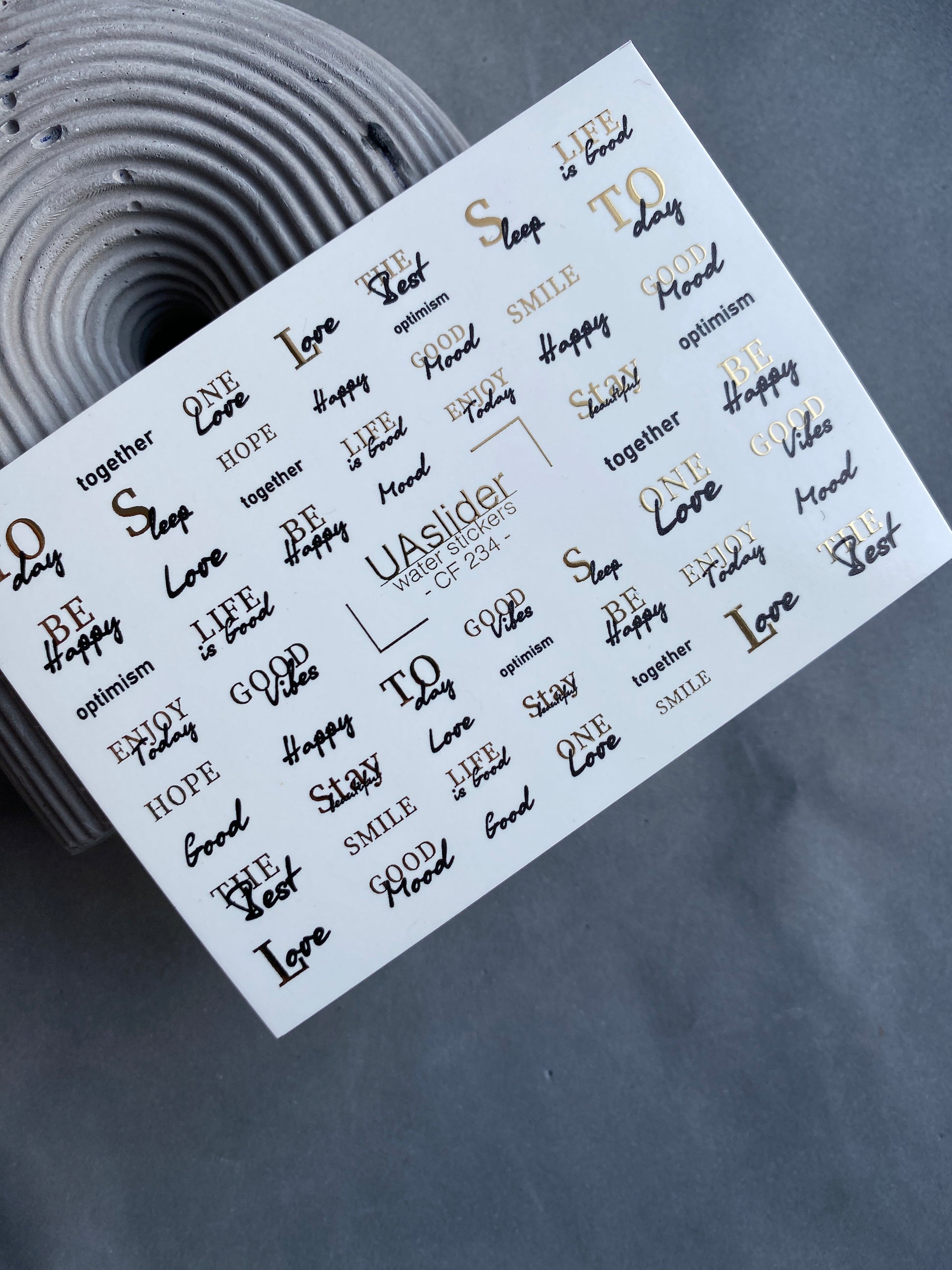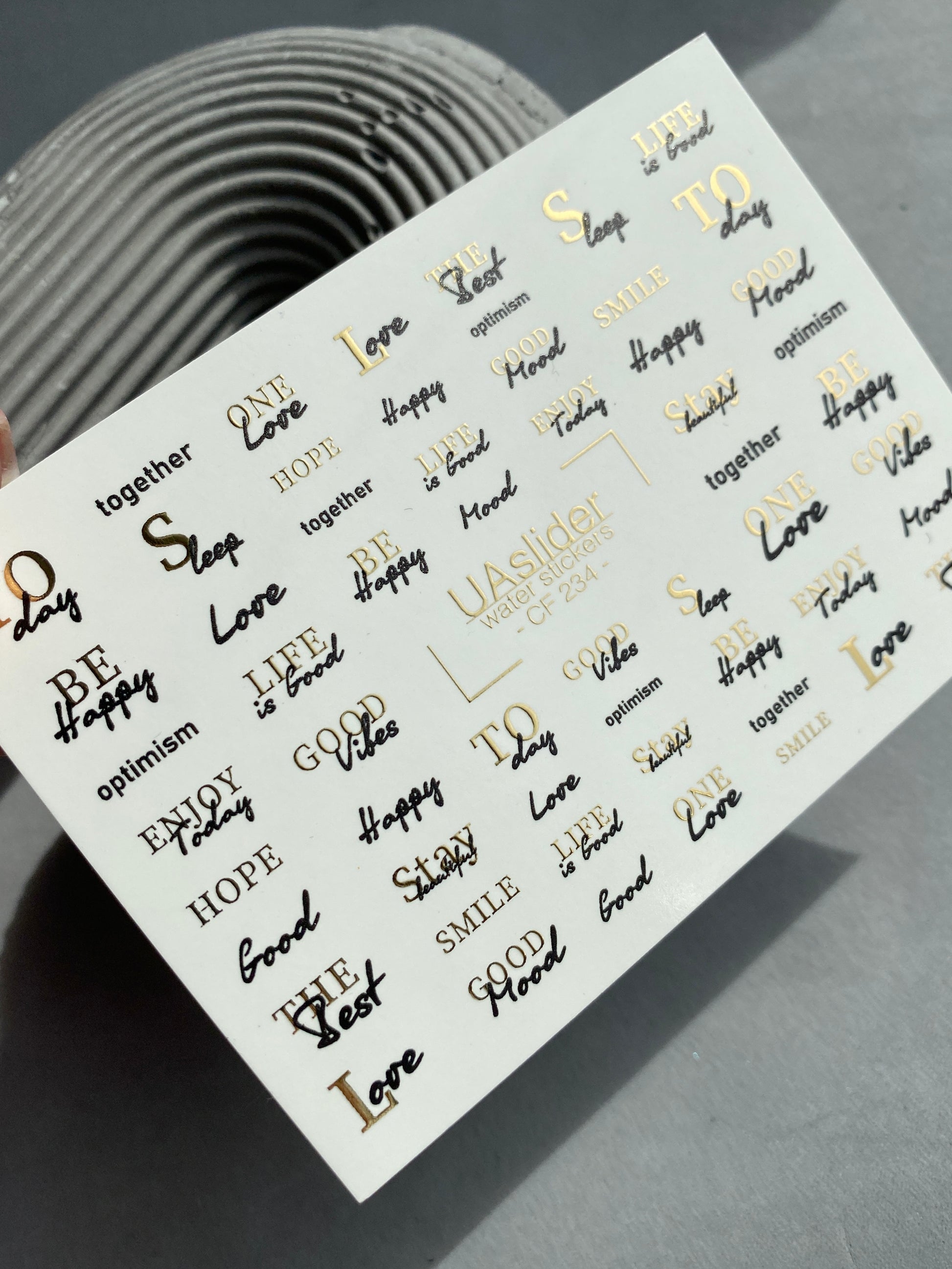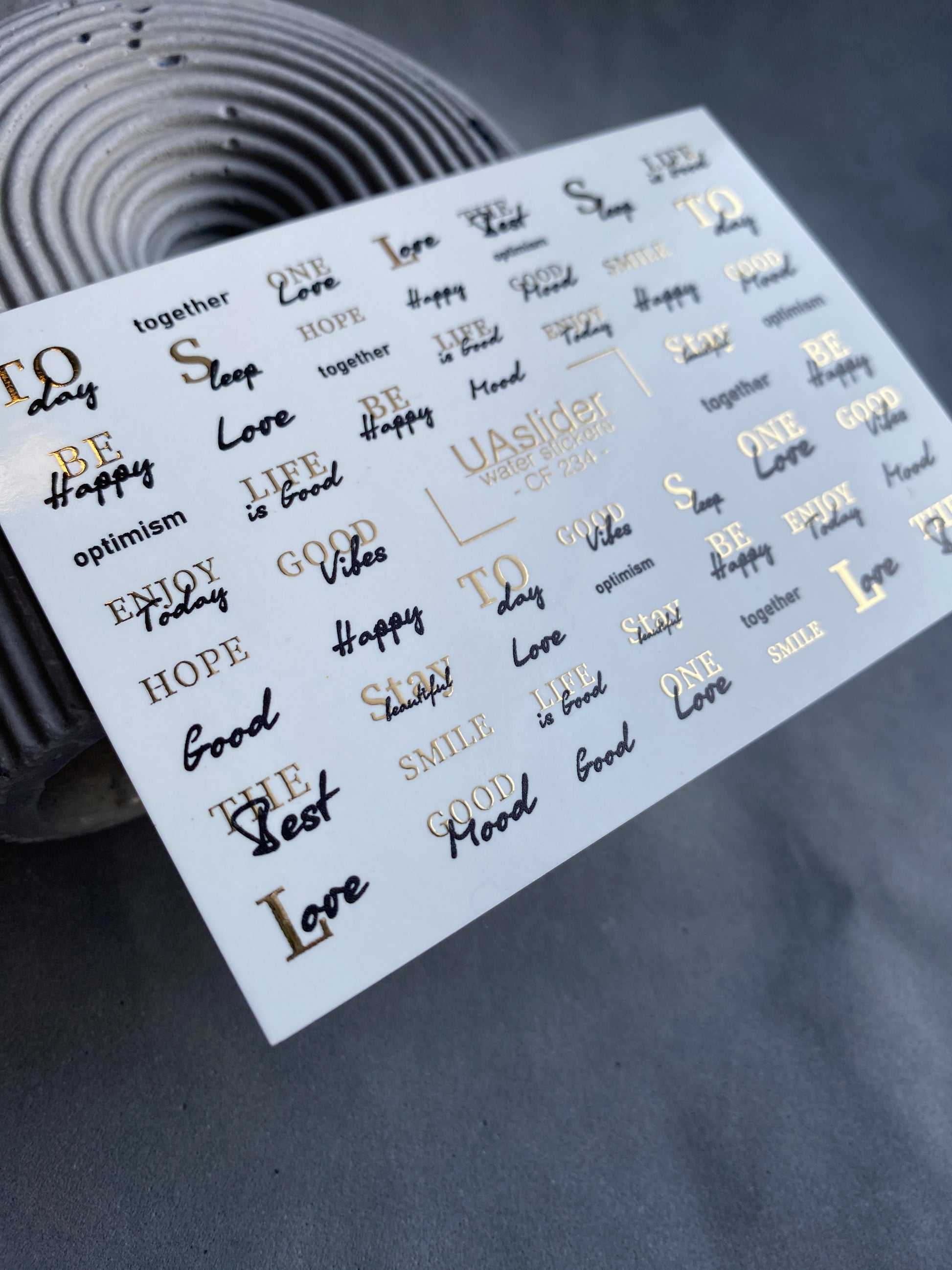 Vodní nálepky na nehty CF-234 | Vodní nálepky na nehty s písmeny | Pozitivní citáty a zlaté detailyCF_234