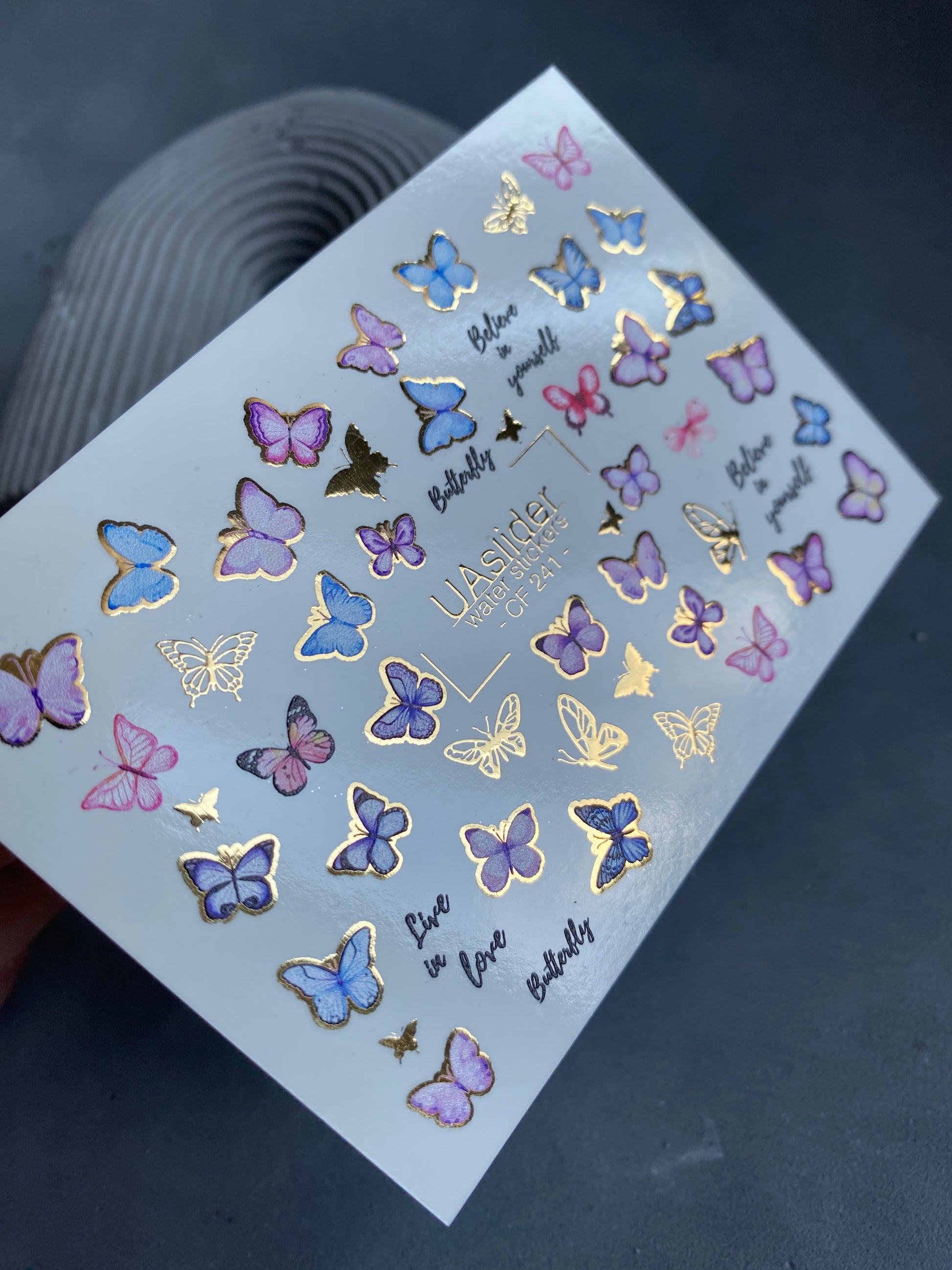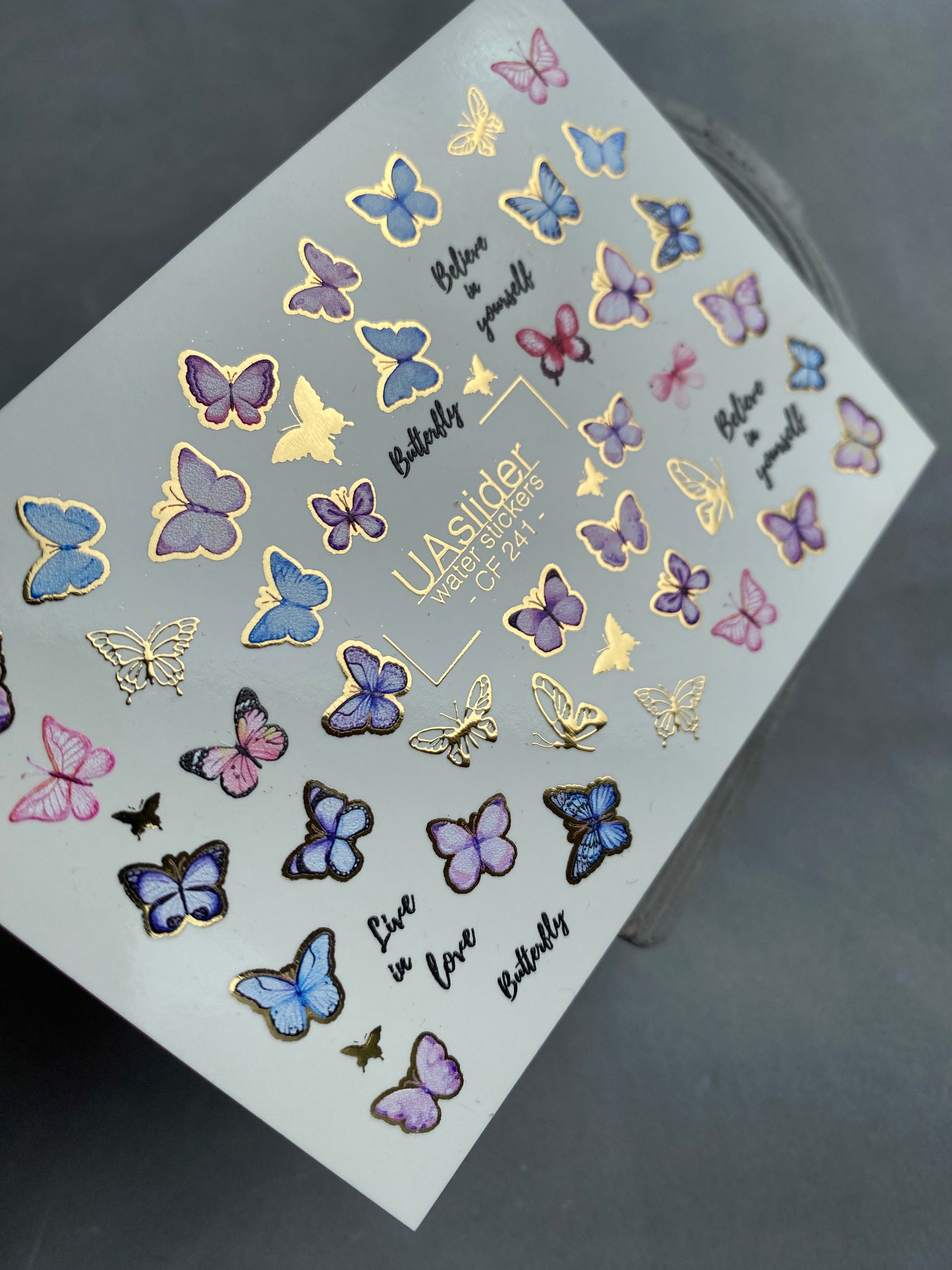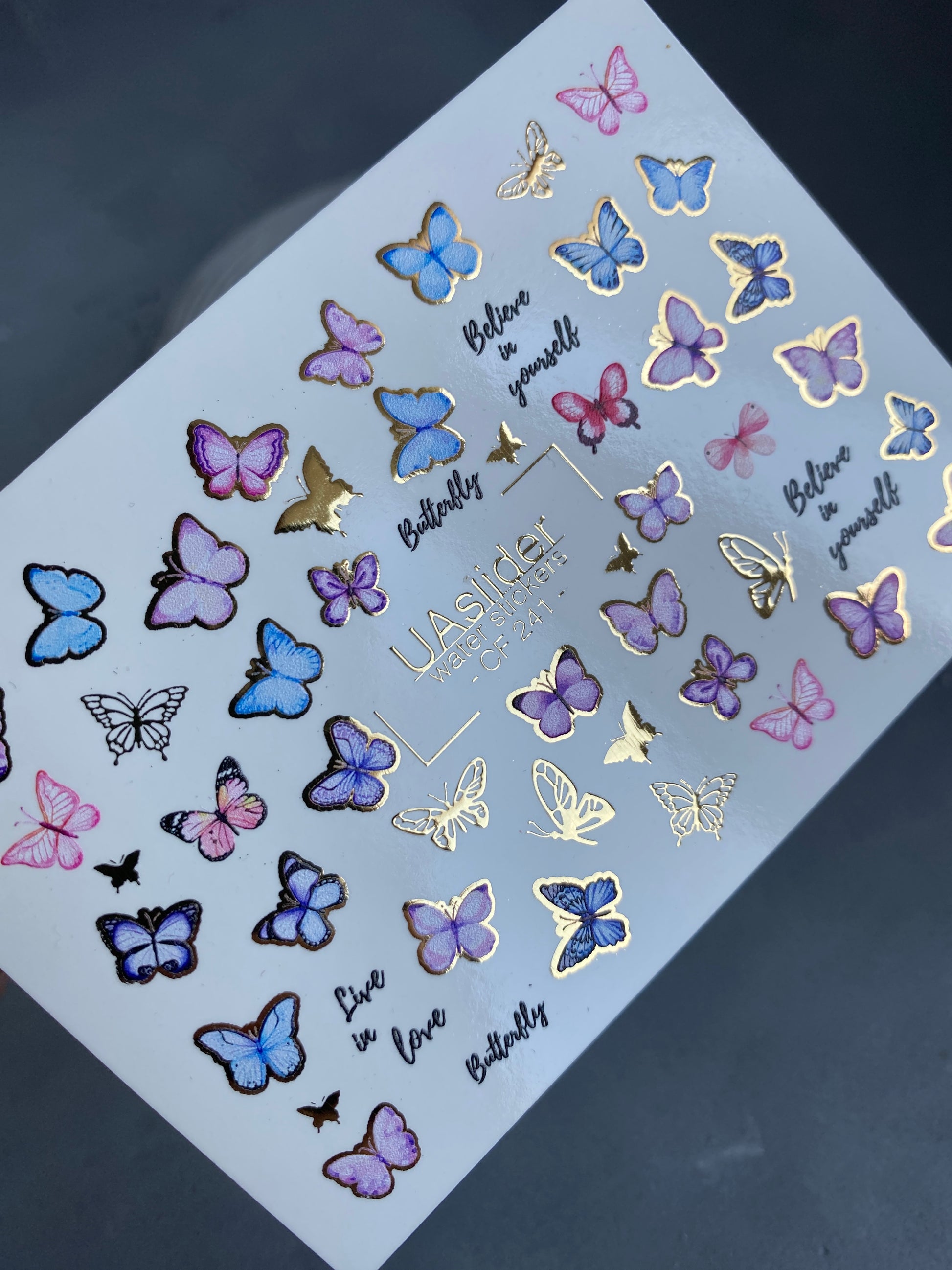Vodní nálepky na nehty s motýly v jemných růžových, modrých a fialových odstínech, zvýrazněné třpytivými zlatými detaily. Inspirativní slova jako „Believe in Yourself“ a „Live in Love“ dodávají stylový nádech.