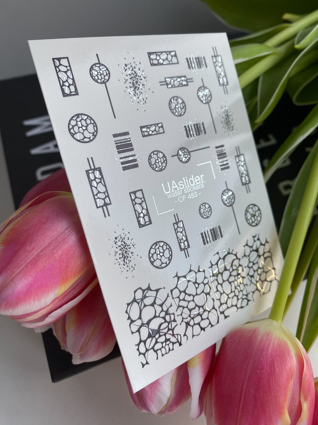 Nálepka na nehty CF-483 | Stříbrné geometrické nálepky na nehty | Abstraktní mozaikové a mřížkové vzory