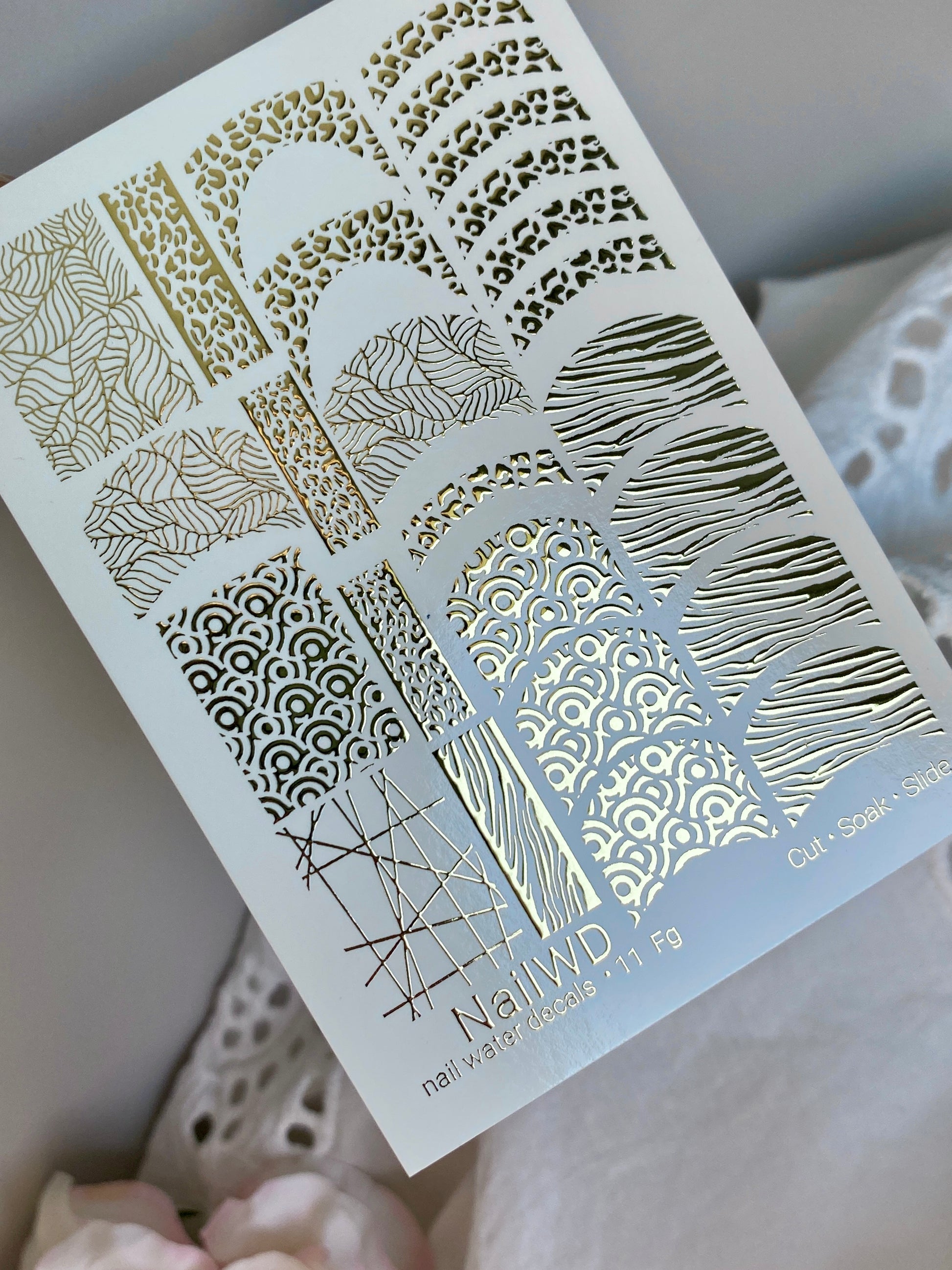 Stilvolle Water Slide Nail Decals mit goldenen geometrischen und abstrakten Mustern — Zebralinien, Leopardenflecken, Wellen, Gitter und ornamentale Motive. Diese Nagel-Wasser-Decals sind wasseraktiviert — zum Auftragen einweichen, und jedes Stück gleitet leicht ab für eine saubere Übertragung.