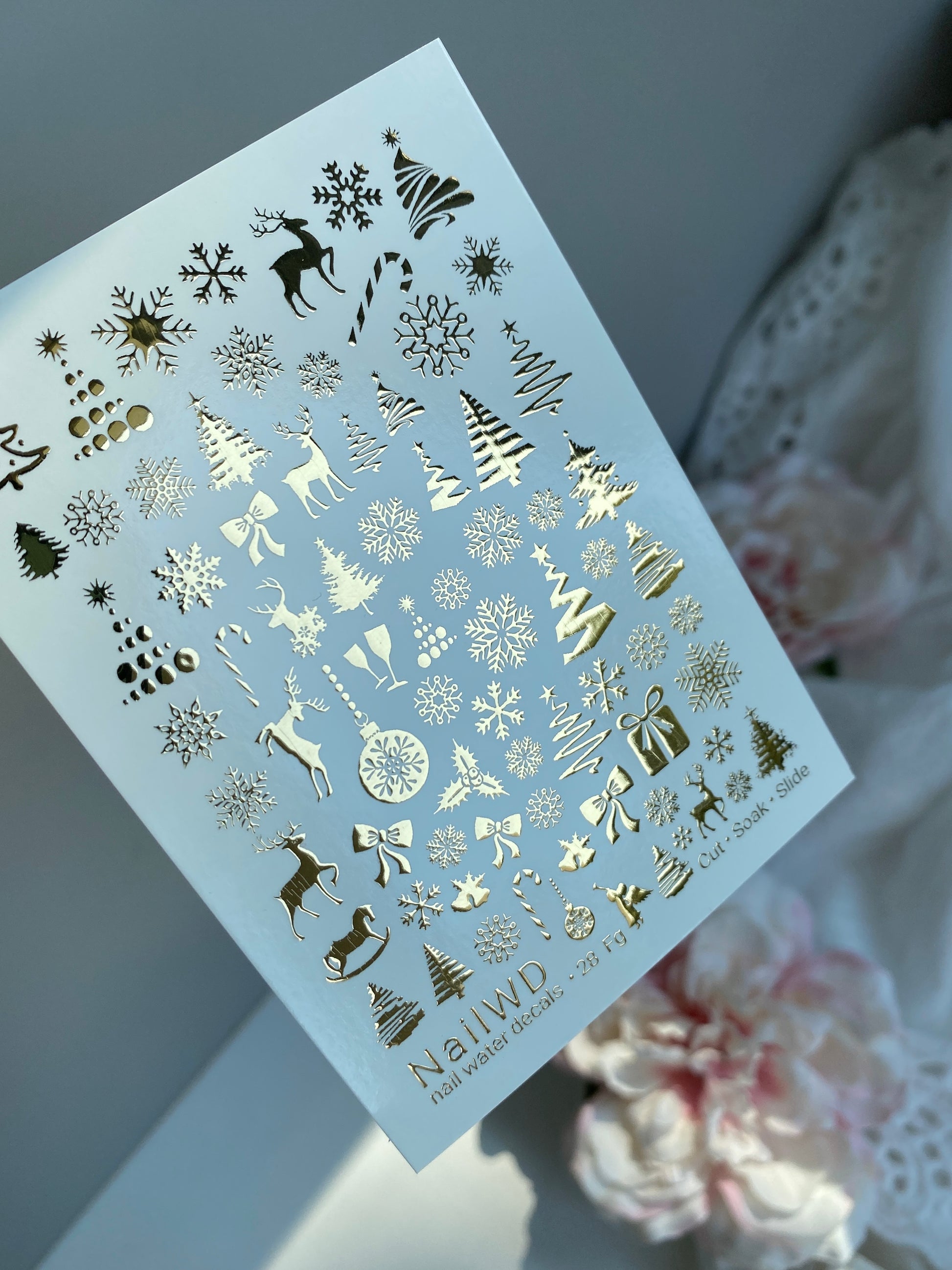 Nagel-Wasserabziehbild 28 NailWD | Wasserfolien-Nagelabziehbilder mit Goldfolie Weihnachtsmuster | Schneeflocken, Bäume, Rentiere & Feiertagsakzente