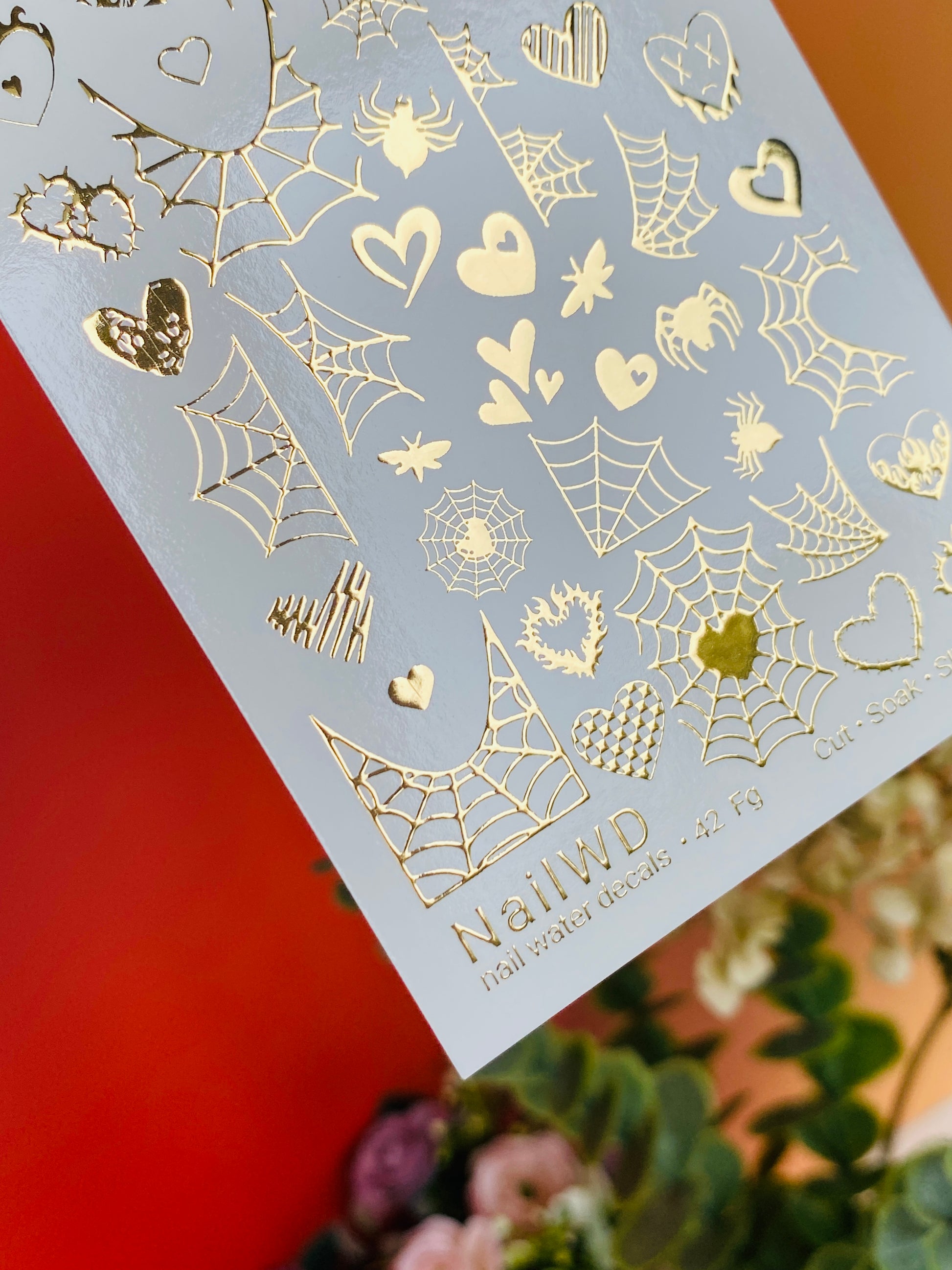 Nagel Wasserabziehbild 42 NailWD | Gotische Wasserfolien Nagelabziehbilder | Goldfolie Herzen & Spinnennetze
