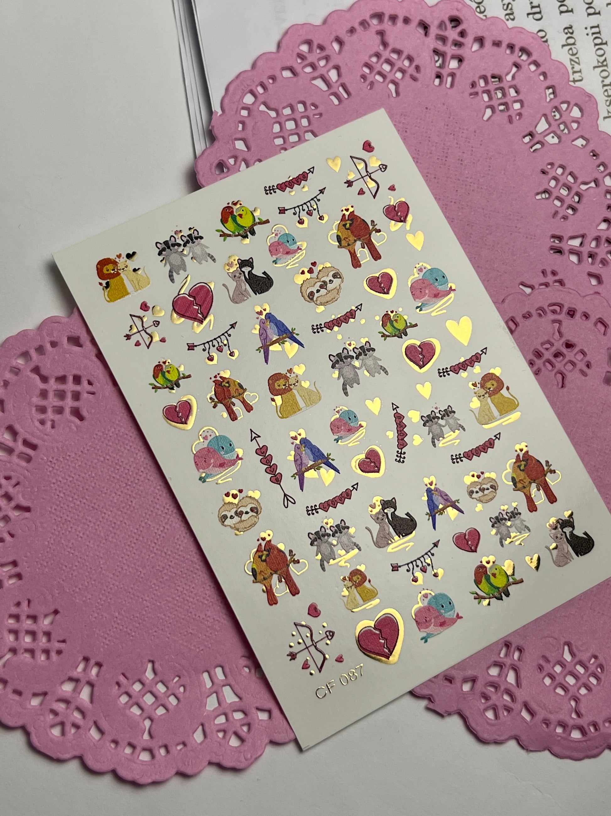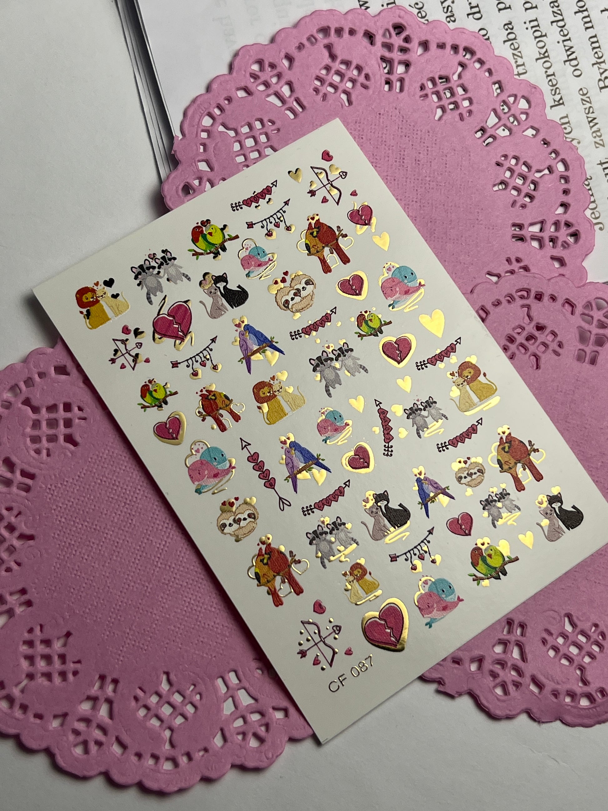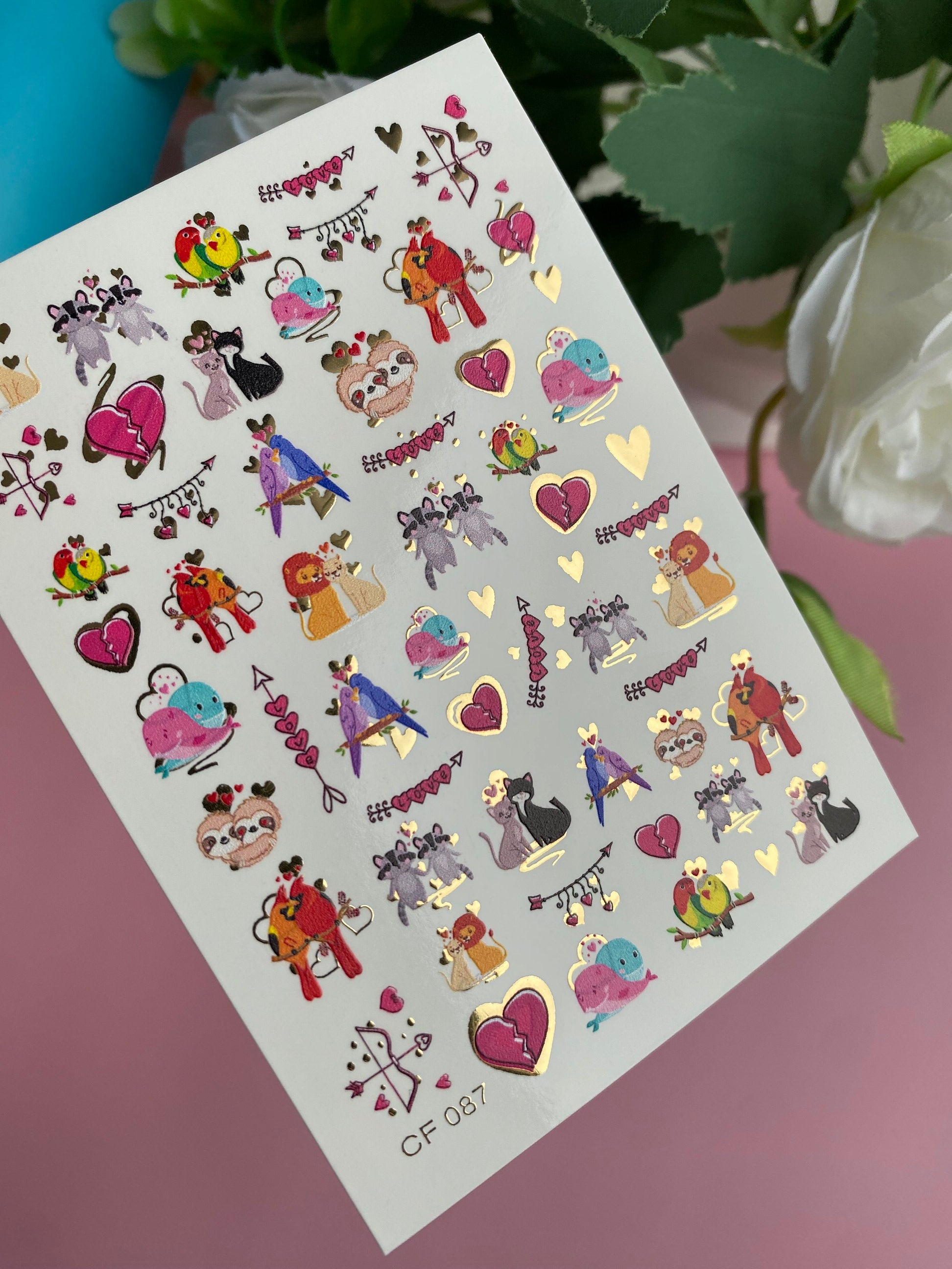 Süße Wasserfolien-Nagelaufkleber mit niedlichen Tierpaaren: Liebesvögel, Katzen, Löwen, Faultiere und Mäuse mit Herzen, Pfeilen und liebevollen Details in leuchtenden Farben mit Goldfolie. Perfekt für den Valentinstag, romantische Nagelkunst oder verspielte Alltagsdesigns.