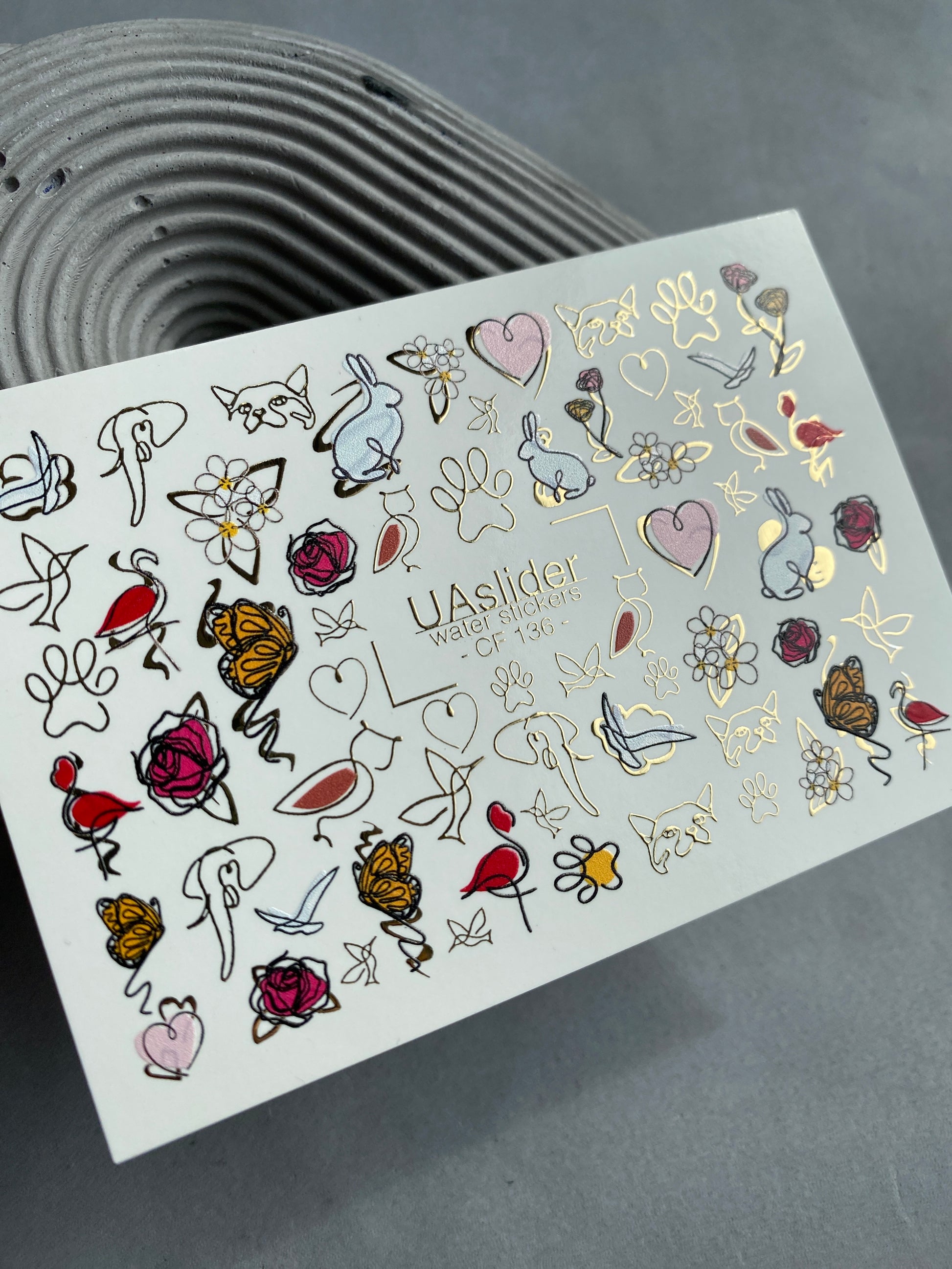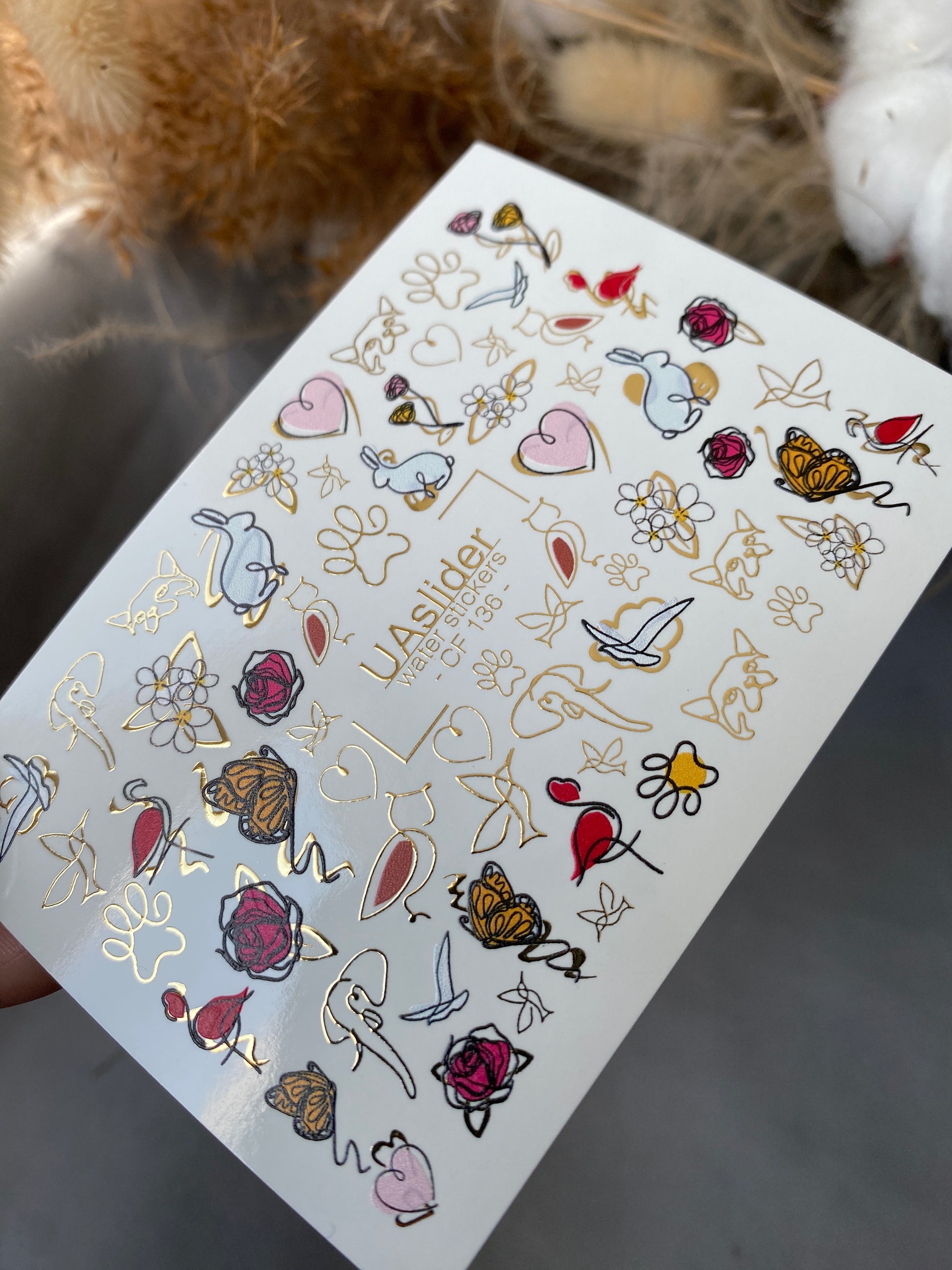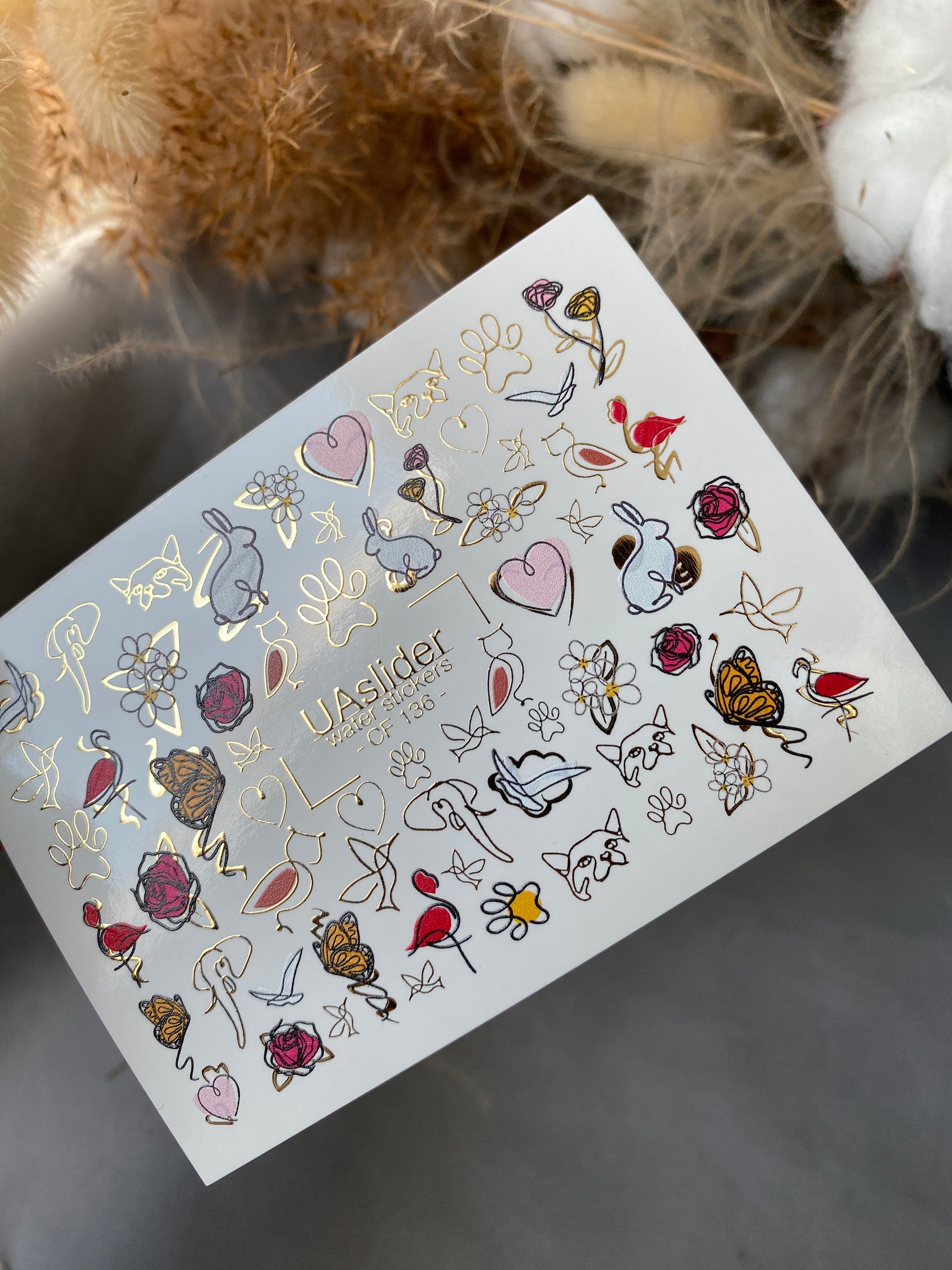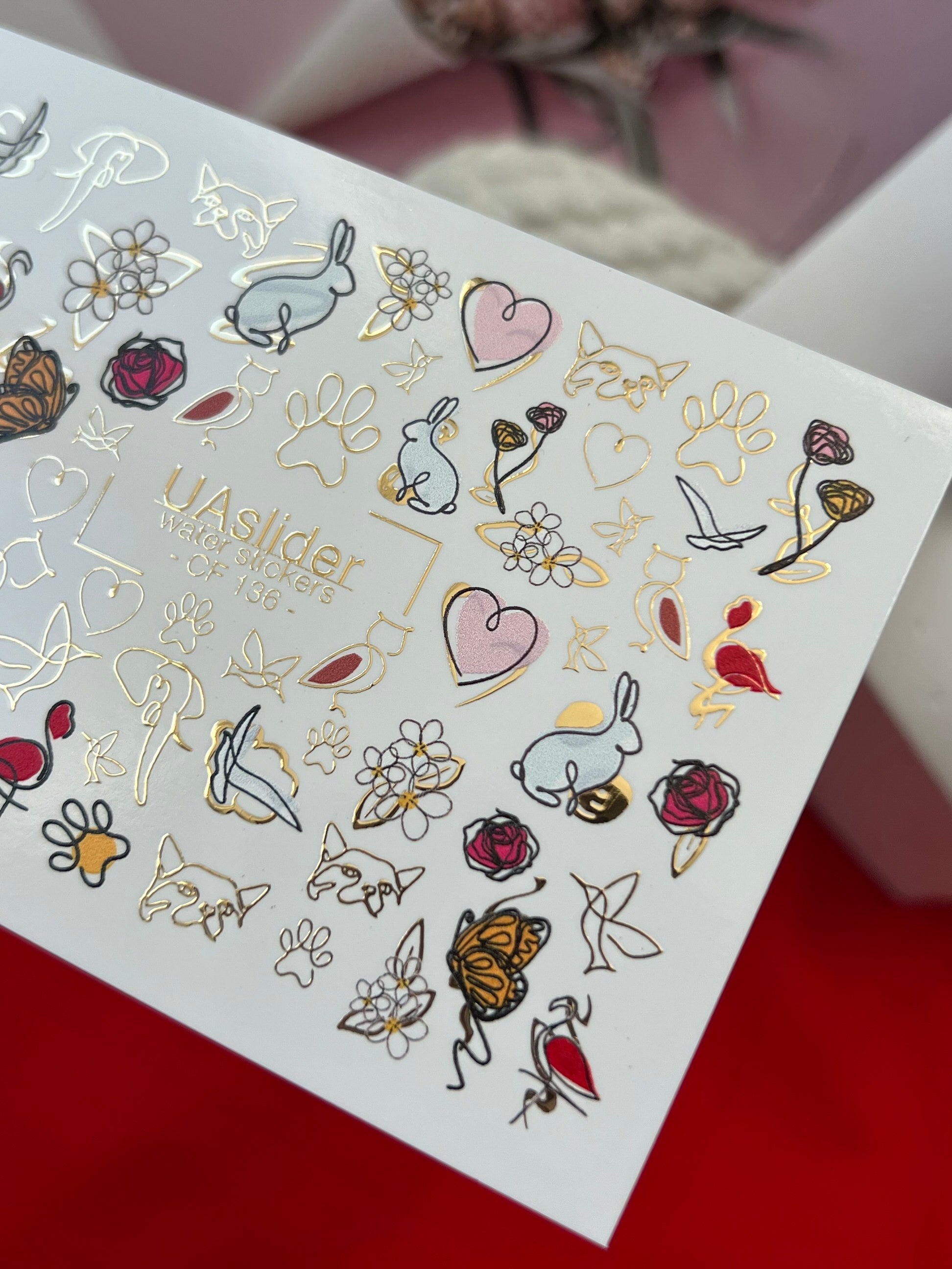 Verspielte Tier- und Blumen-Wasserabziehbilder mit Rosen, Schmetterlingen, Flamingos, Kaninchen, Katzen, Pfotenabdrücken und charmanten goldenen Folienakzenten. Eine lustige und stilvolle Mischung für kreative Maniküren.