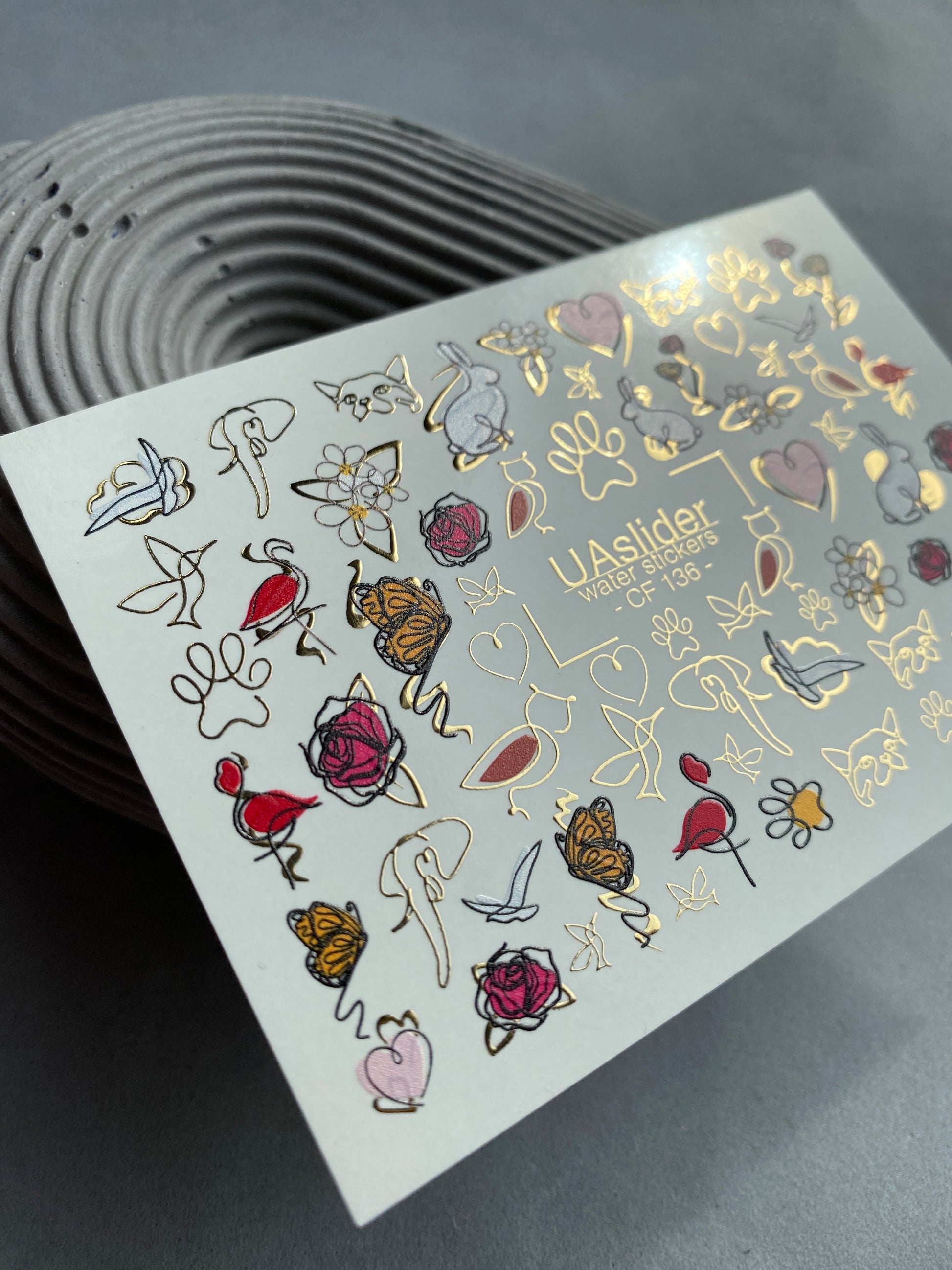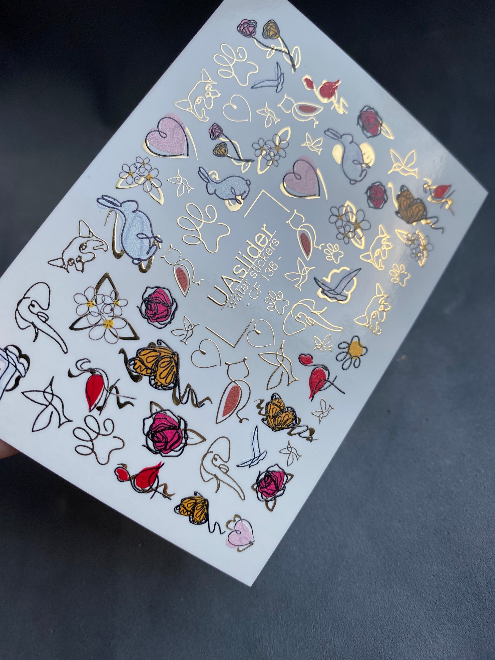 Nagel Wasserabziehbild CF-136 | Tier- & Blumen Wasser-Schiebefolien Nagelabziehbilder | Goldfolie Schmetterlinge, Rosen & Herzen