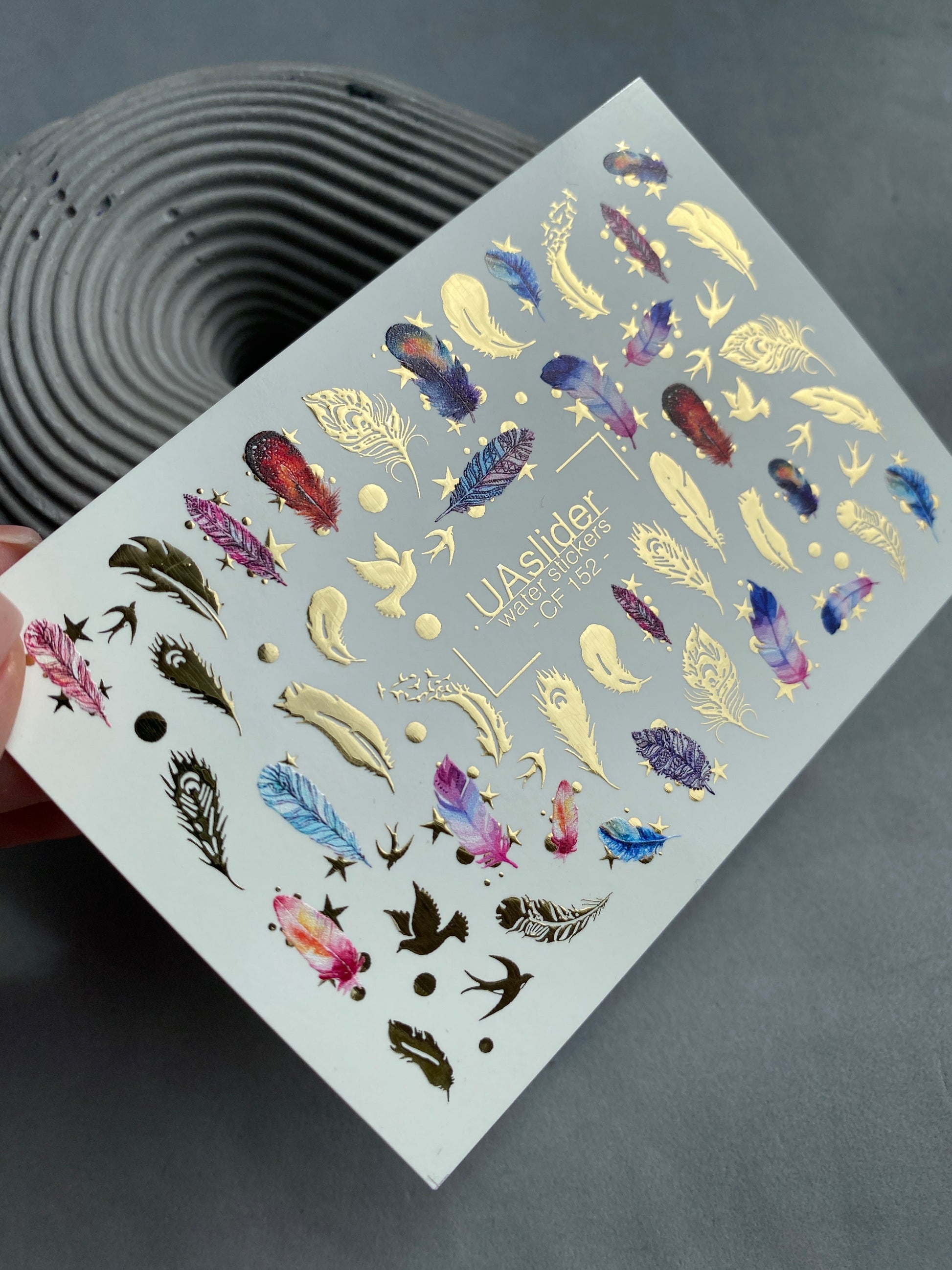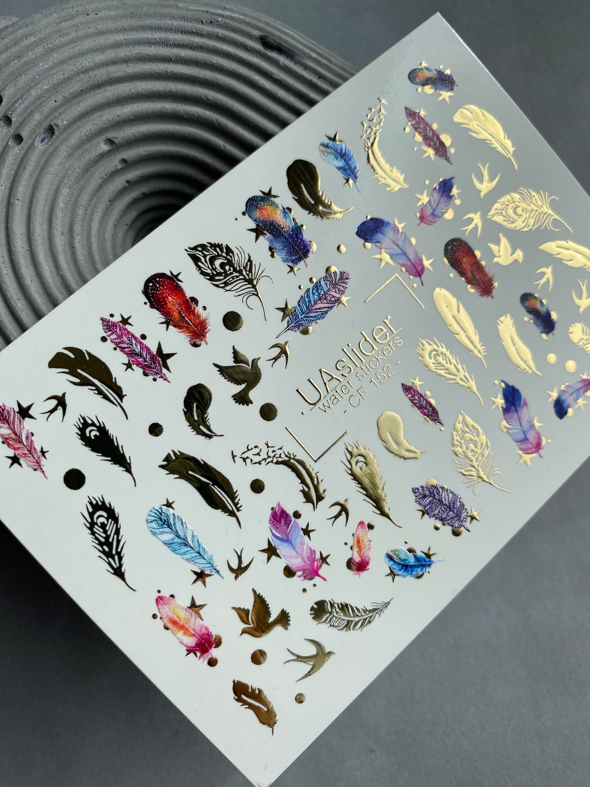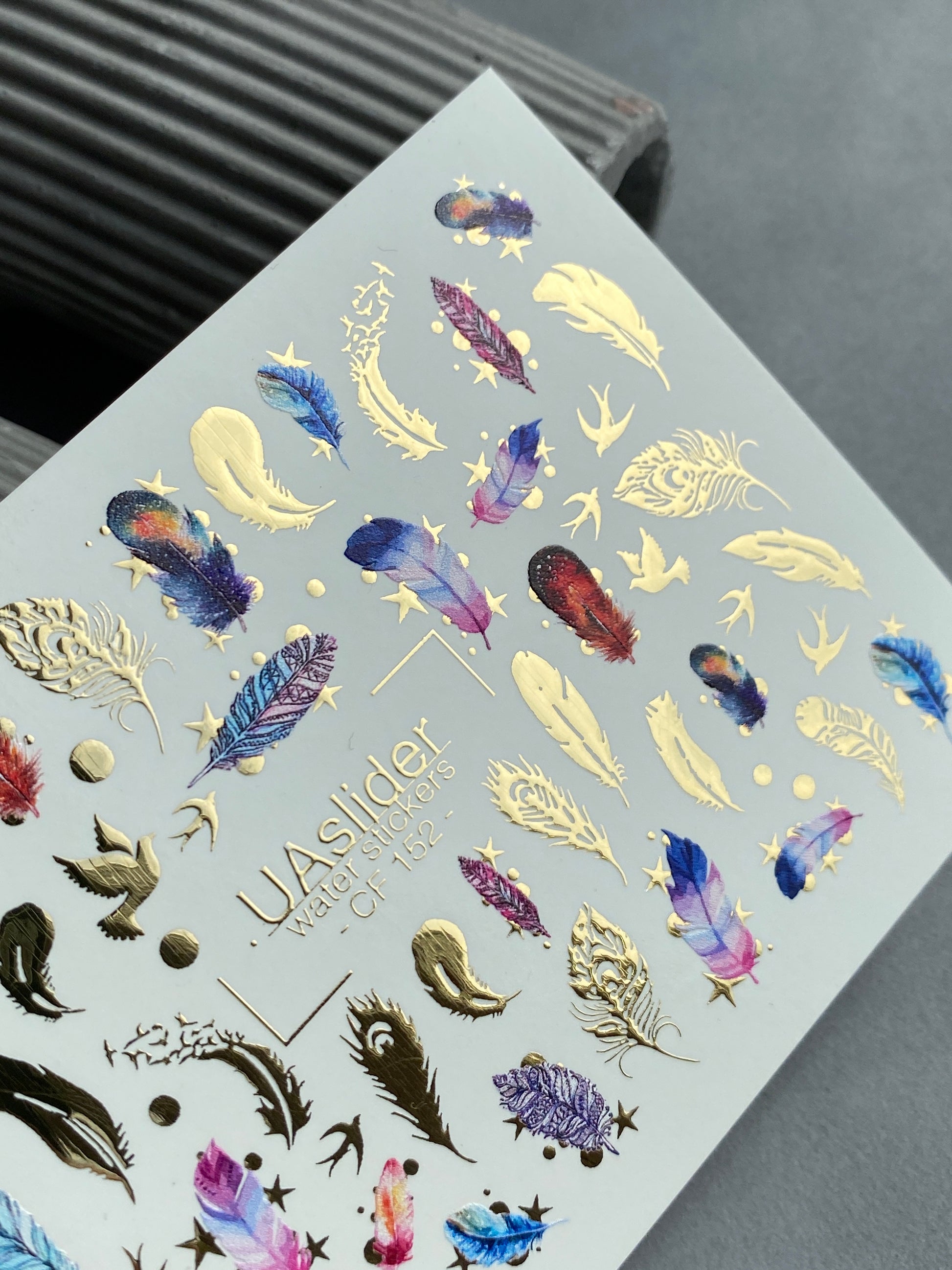 Nagel-Wasserabziehbild CF-152 | Feder-Wasserfolien-Nagelabziehbilder | Bunte Federn, Vögel & Goldfoliensternchen