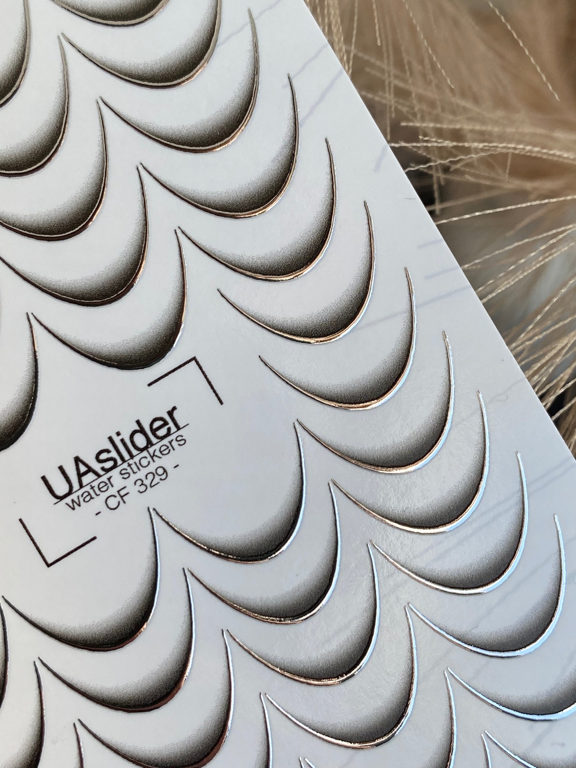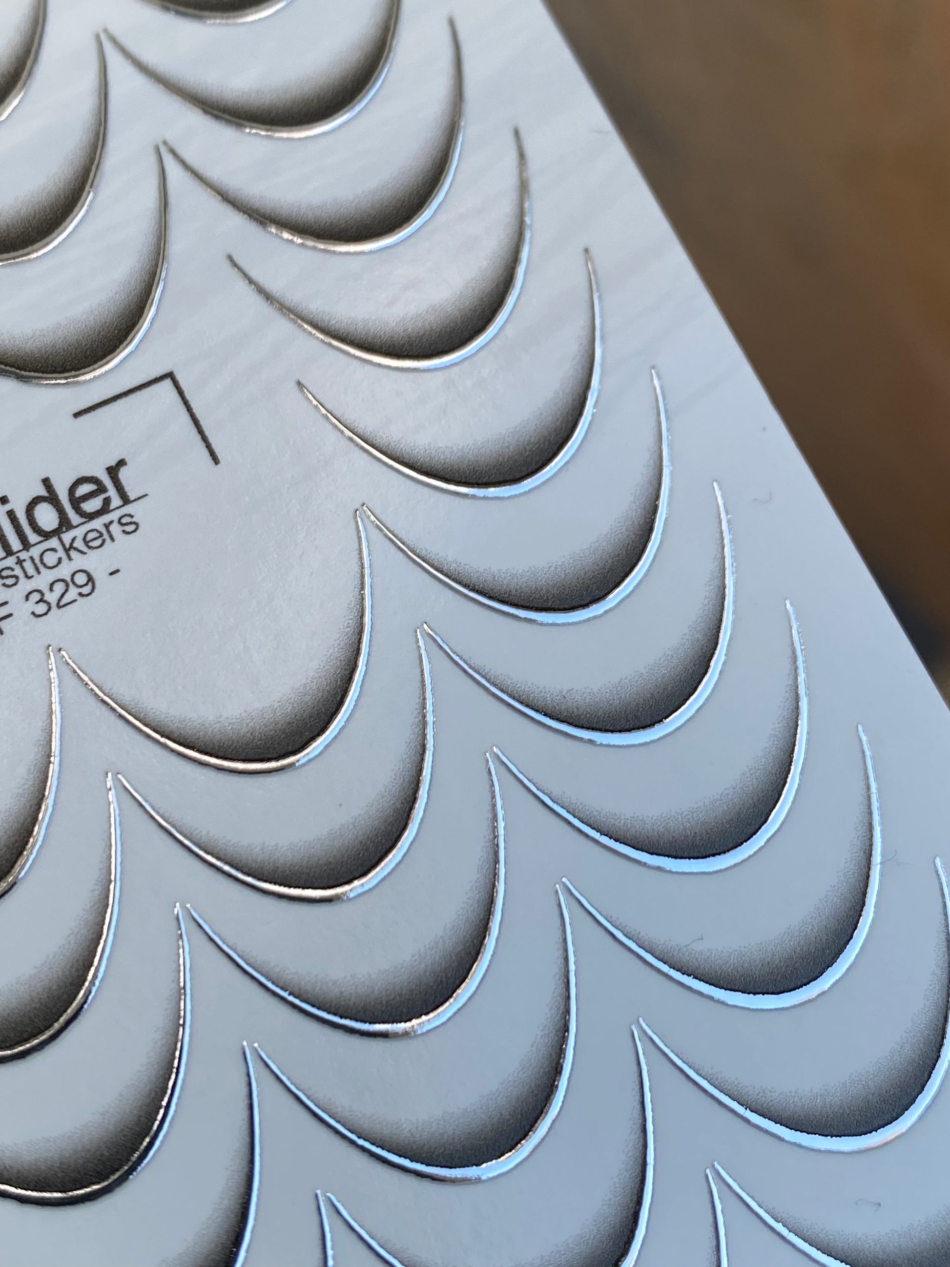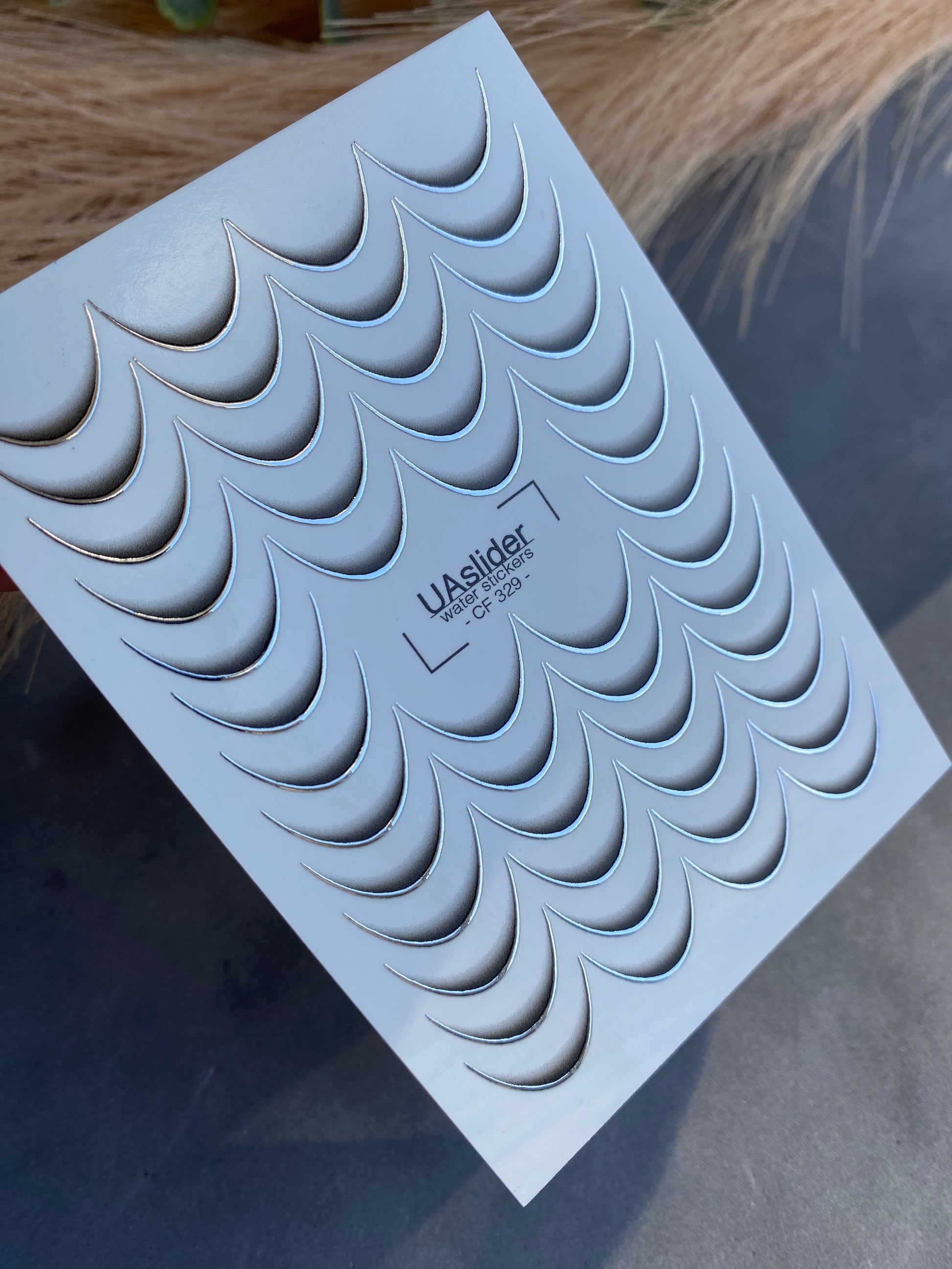 Anspruchsvolle French Water Slide Nagelaufkleber mit einem rauchigen Schwarz-zu-Grau-Verlauf und eleganten silbernen Umrissen. Perfekt, um moderne French Maniküren mit einem kühnen, eleganten Twist zu kreieren.