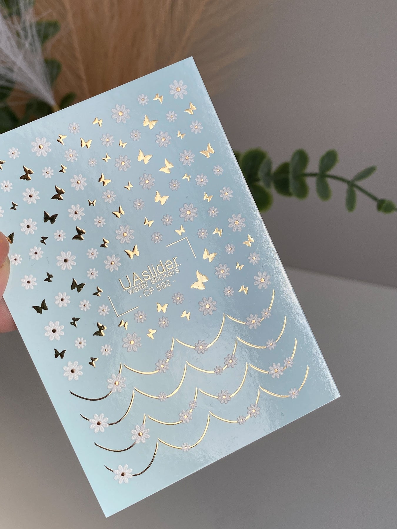 Nagel Wasserabziehbild CF-592 | Weiße florale Nagel Wasserabziehbilder mit goldenen Schmetterlingen | Elegante französische Designaufkleber