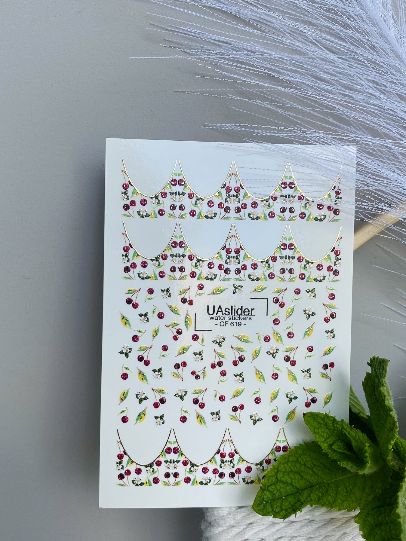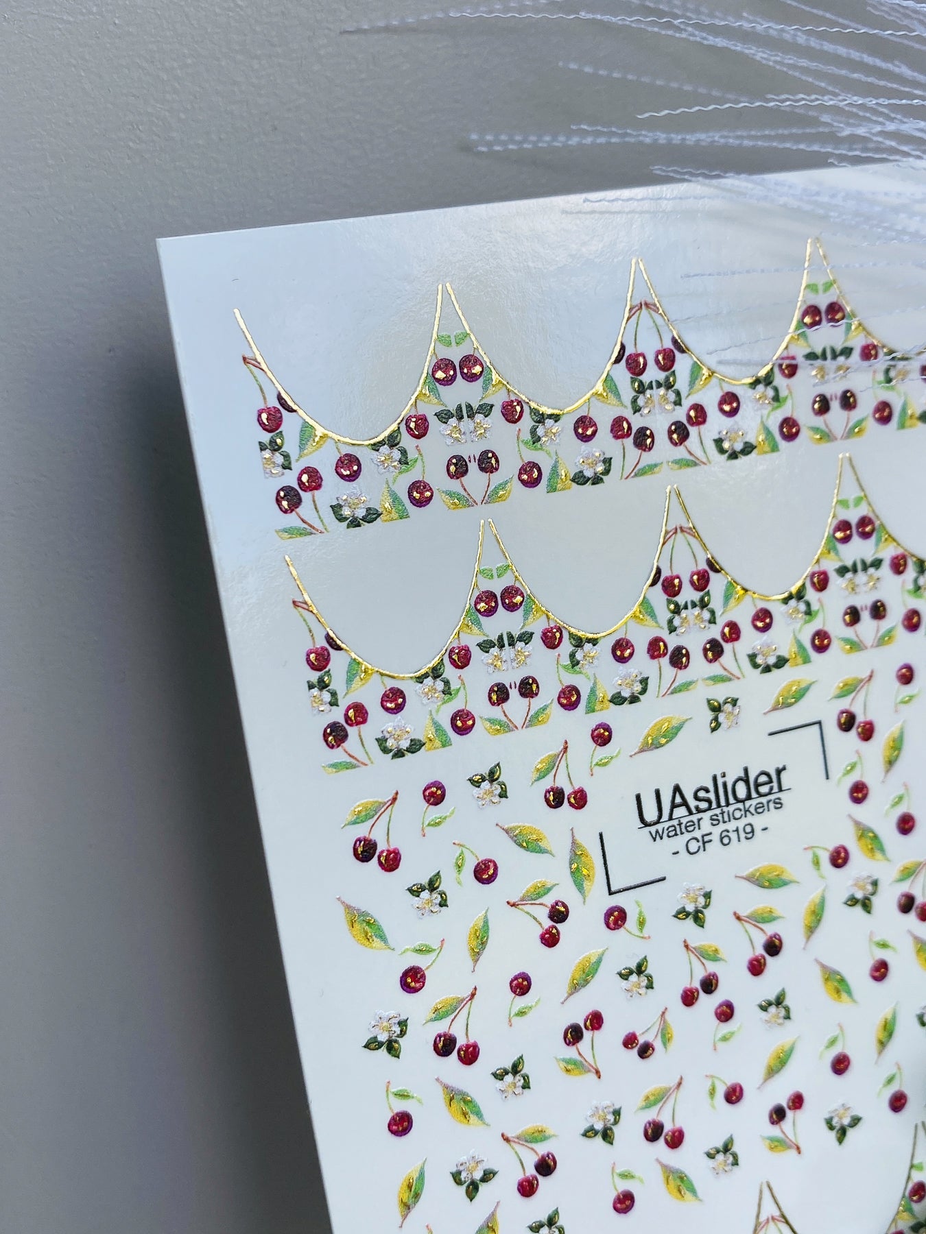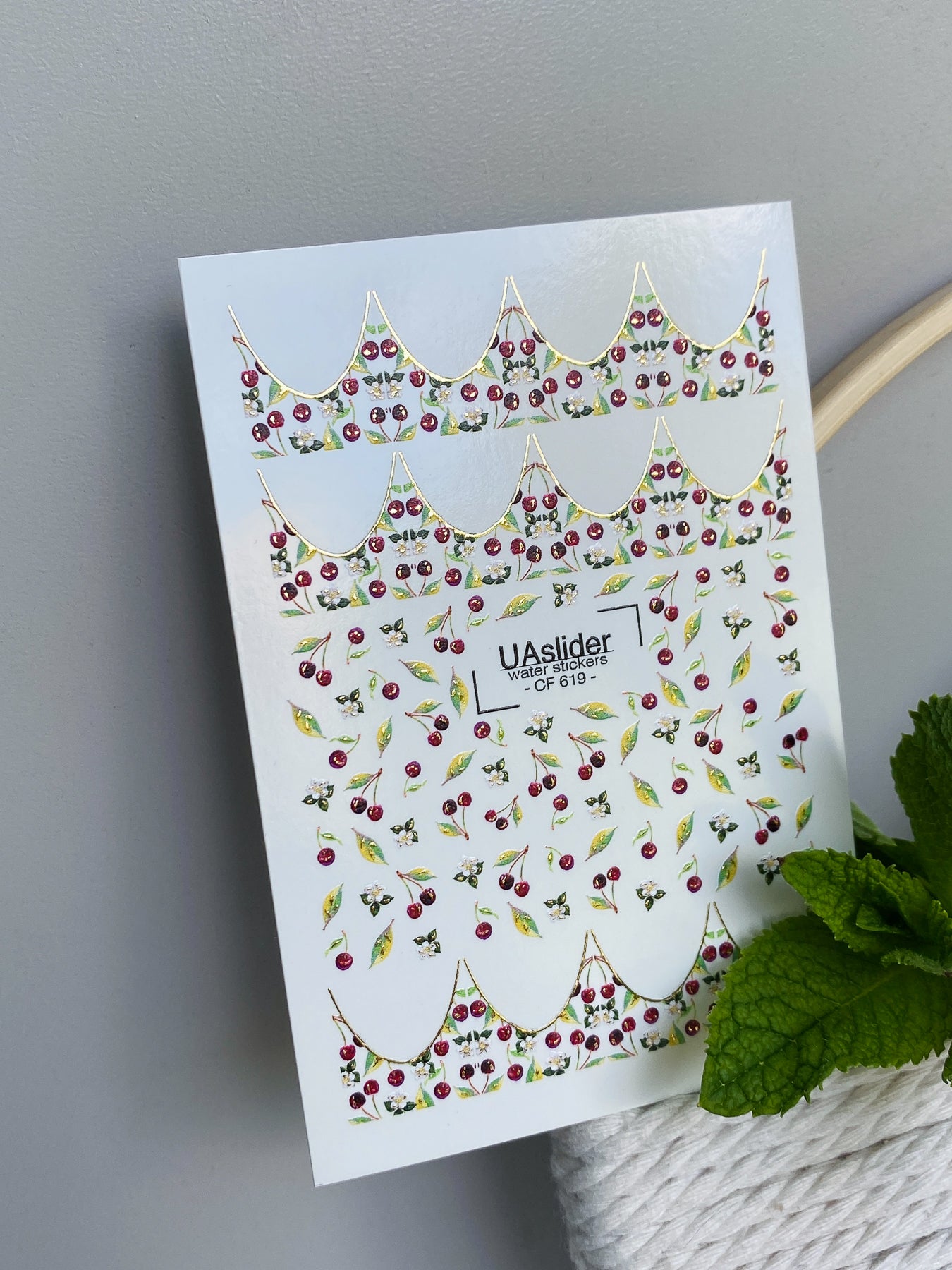 Cherry French Wassertransfer-Nagelaufkleber mit saftigen Kirschen, frischen grünen Blättern und zarten weißen Blüten. Diese Nagel-Wasseraufkleber sind wasseraktiviert – einfach das gewünschte Stück ausschneiden, ins Wasser legen, und es löst sich vom Trägerpapier für eine glatte Übertragung.