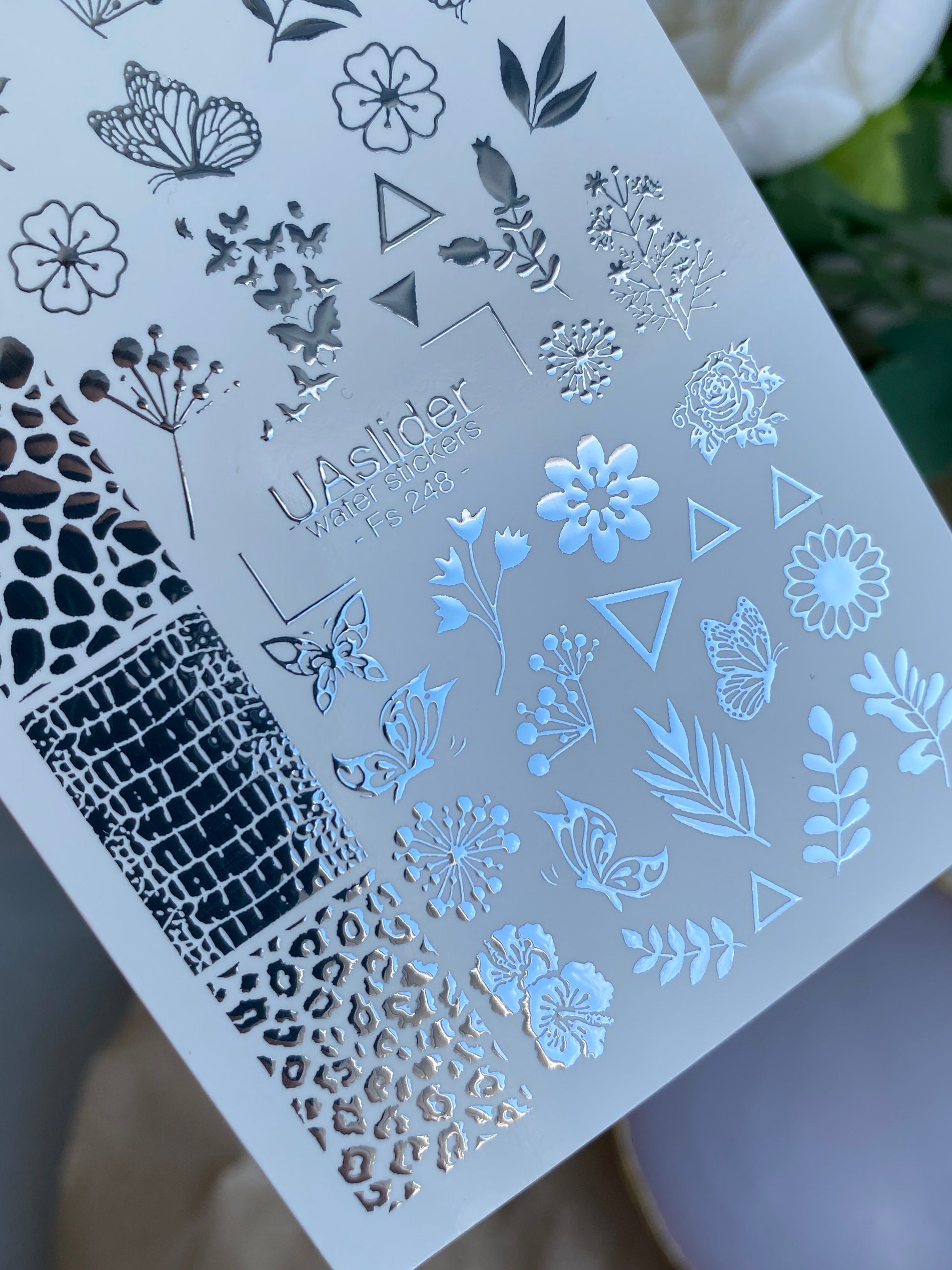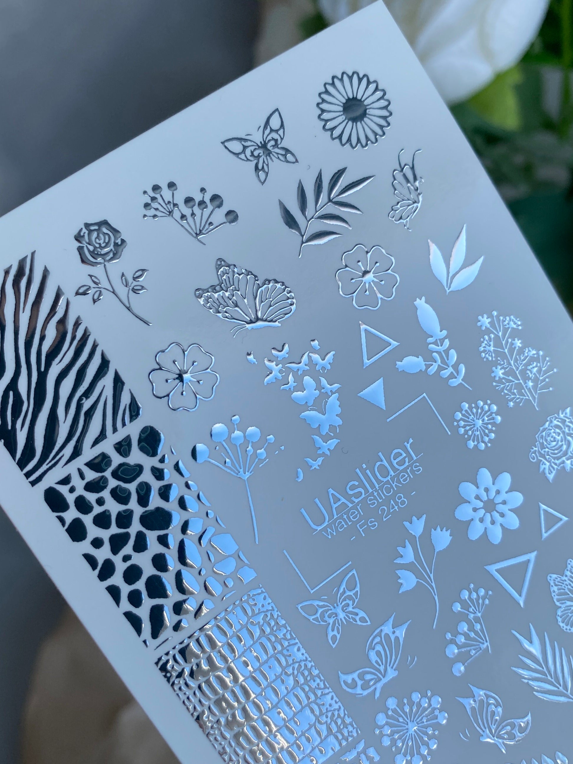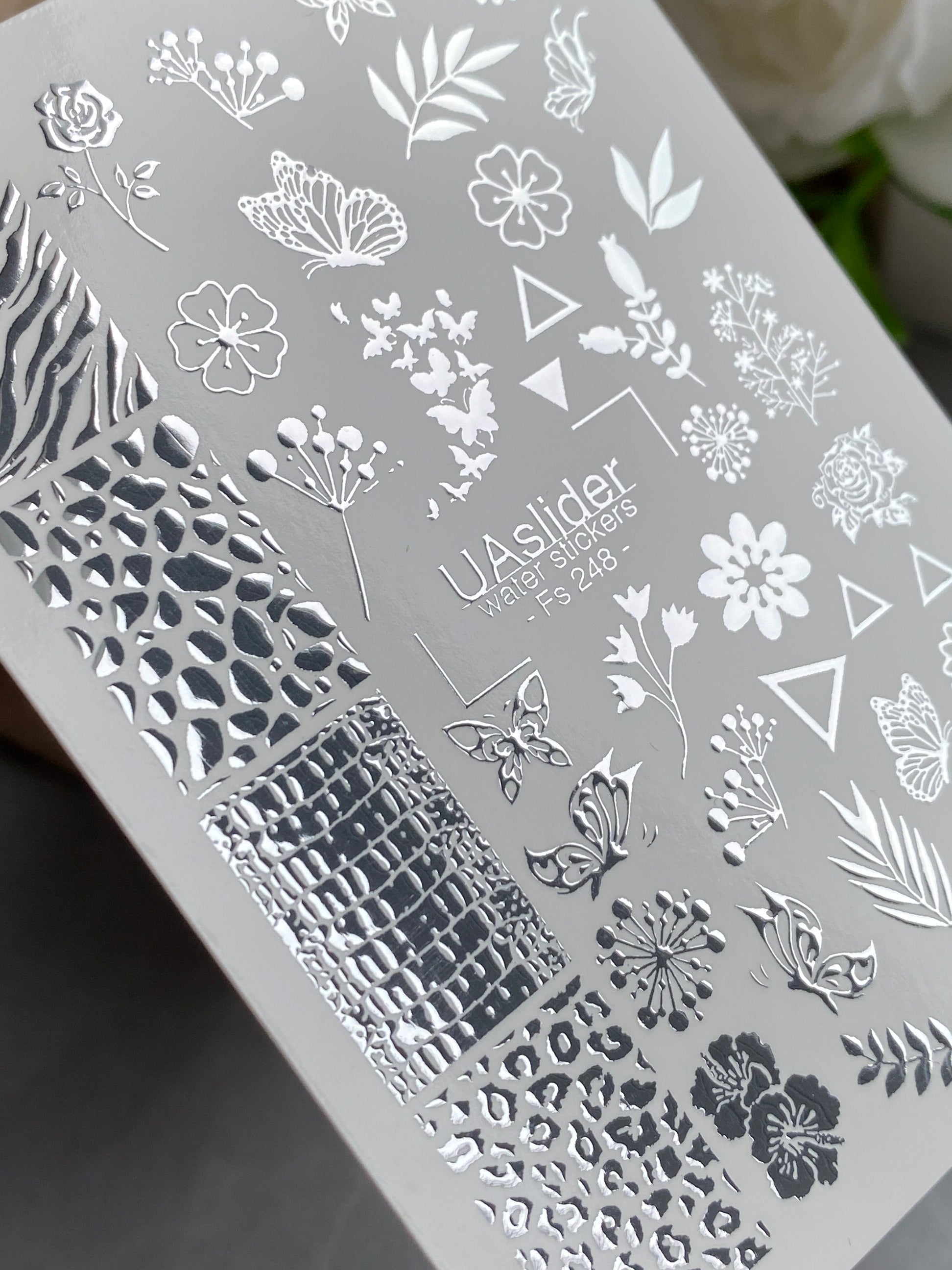 Nagel-Wasserabziehbild Fs-248 | Gemischte Wasser-Schiebefolien-Nagelabziehbilder | Silberfolie Blumen, Schmetterlinge & TiermusterFs_248