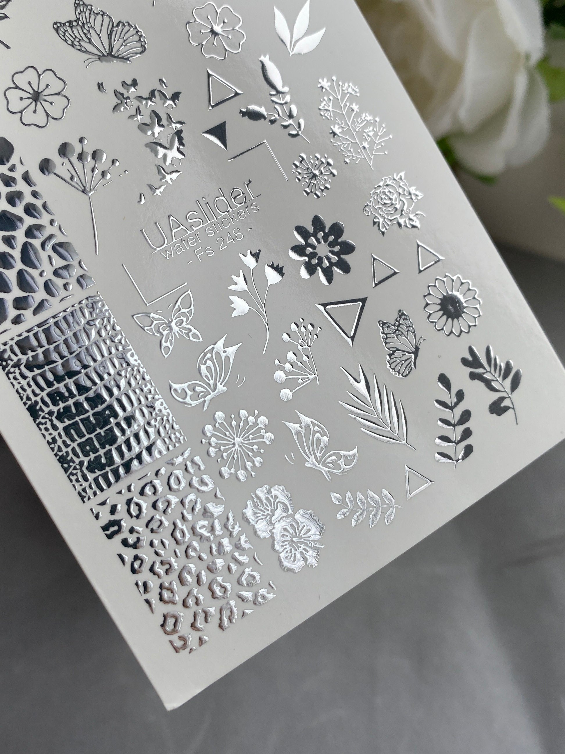 Nagel-Wasserabziehbild Fs-248 | Gemischte Wasser-Schiebefolien-Nagelabziehbilder | Silberfolie Blumen, Schmetterlinge & Tiermuster