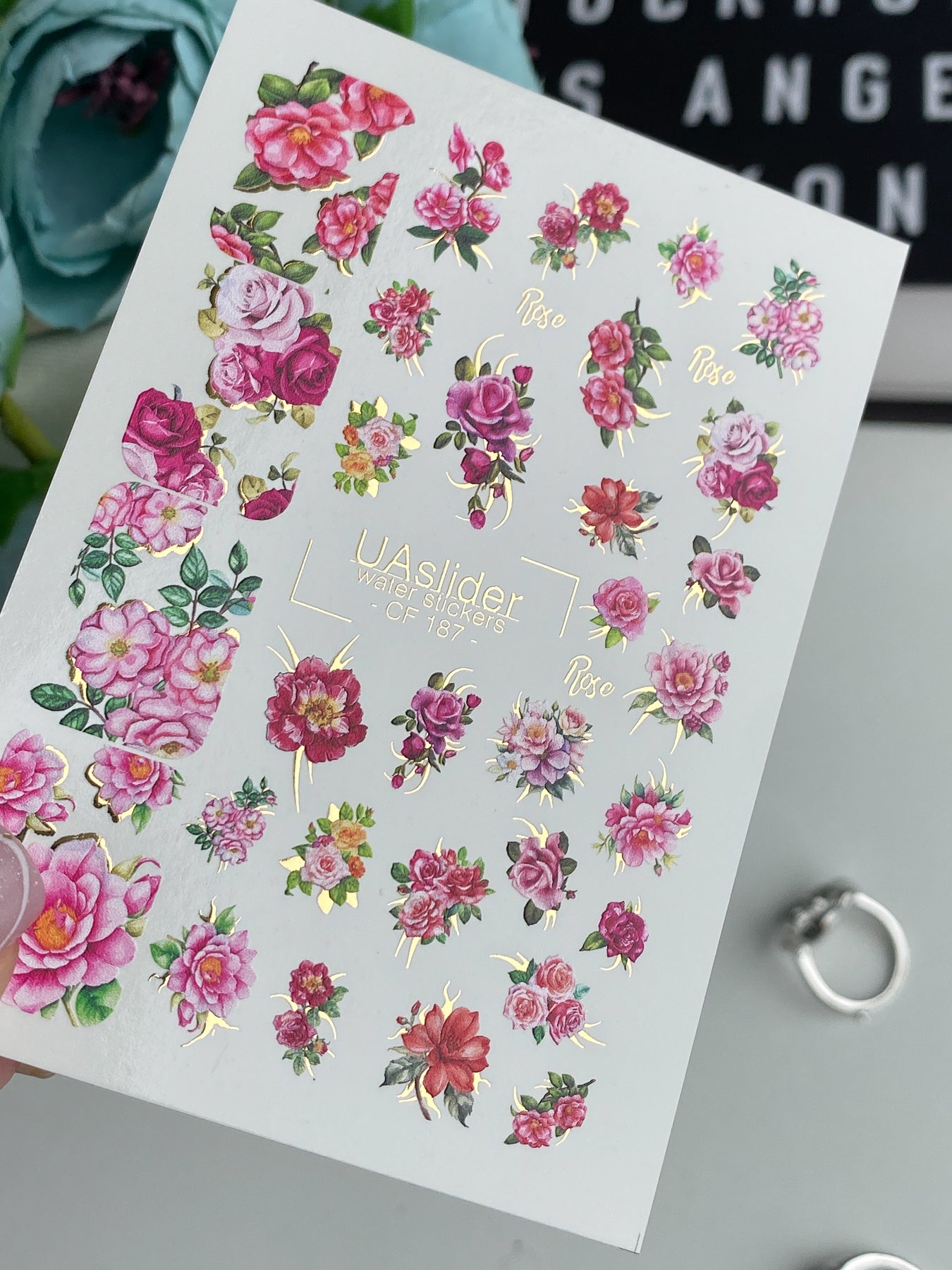 Calcomanías de agua para uñas románticas con ramos exuberantes de rosas en tonos rosa y rojo, resaltados con detalles dorados. Perfectas para crear diseños de uñas femeninos, elegantes y florales.