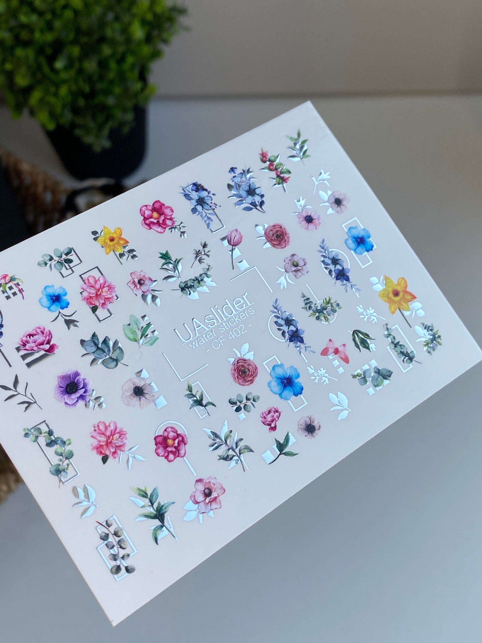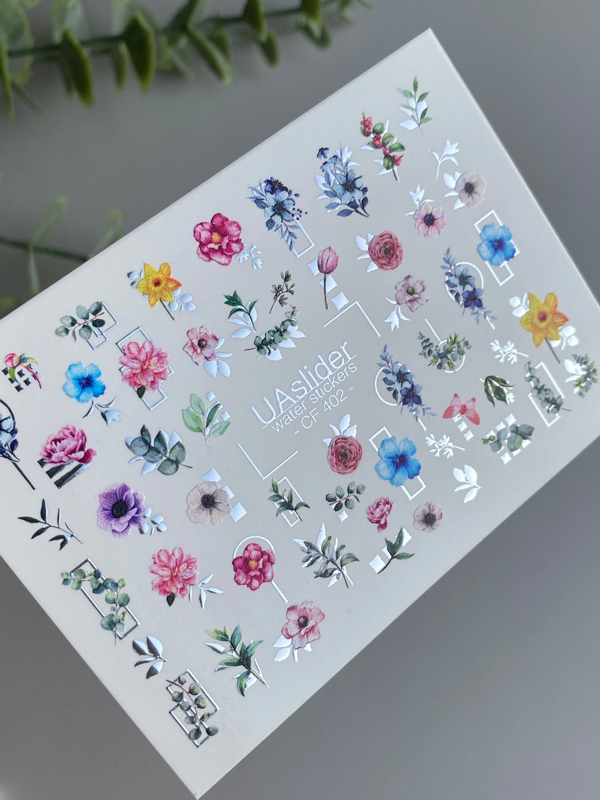 Küünte veekleebis CF-402 | Botaanilised veeslibri küünte kleebised | Värvikad lilled geomeetriliste aktsentidegaCF_402