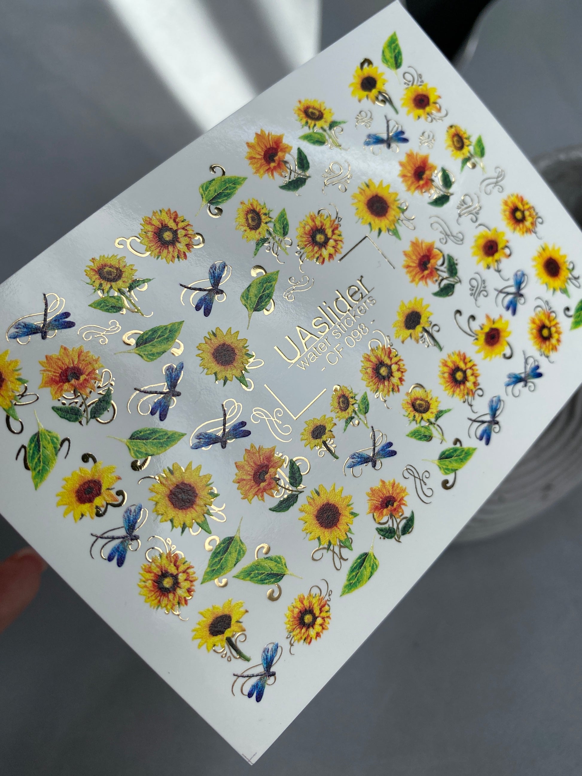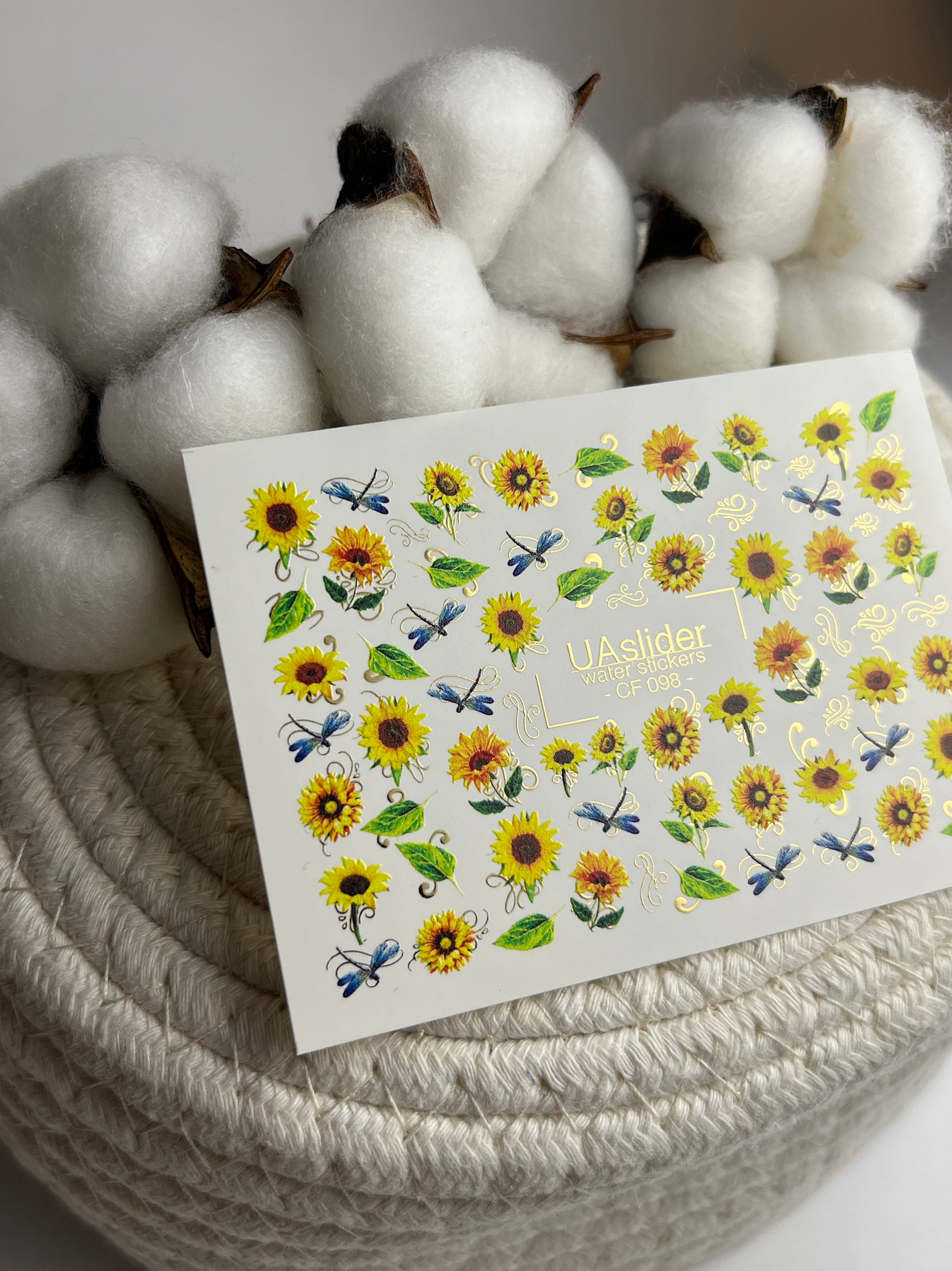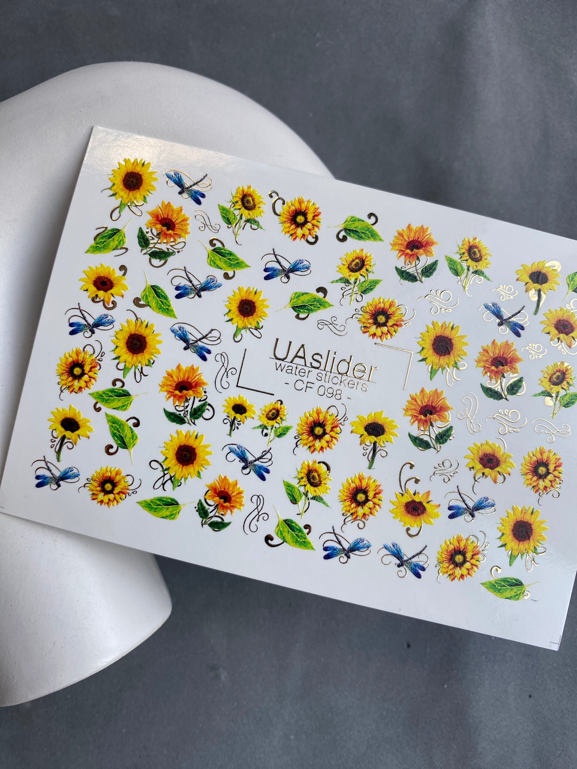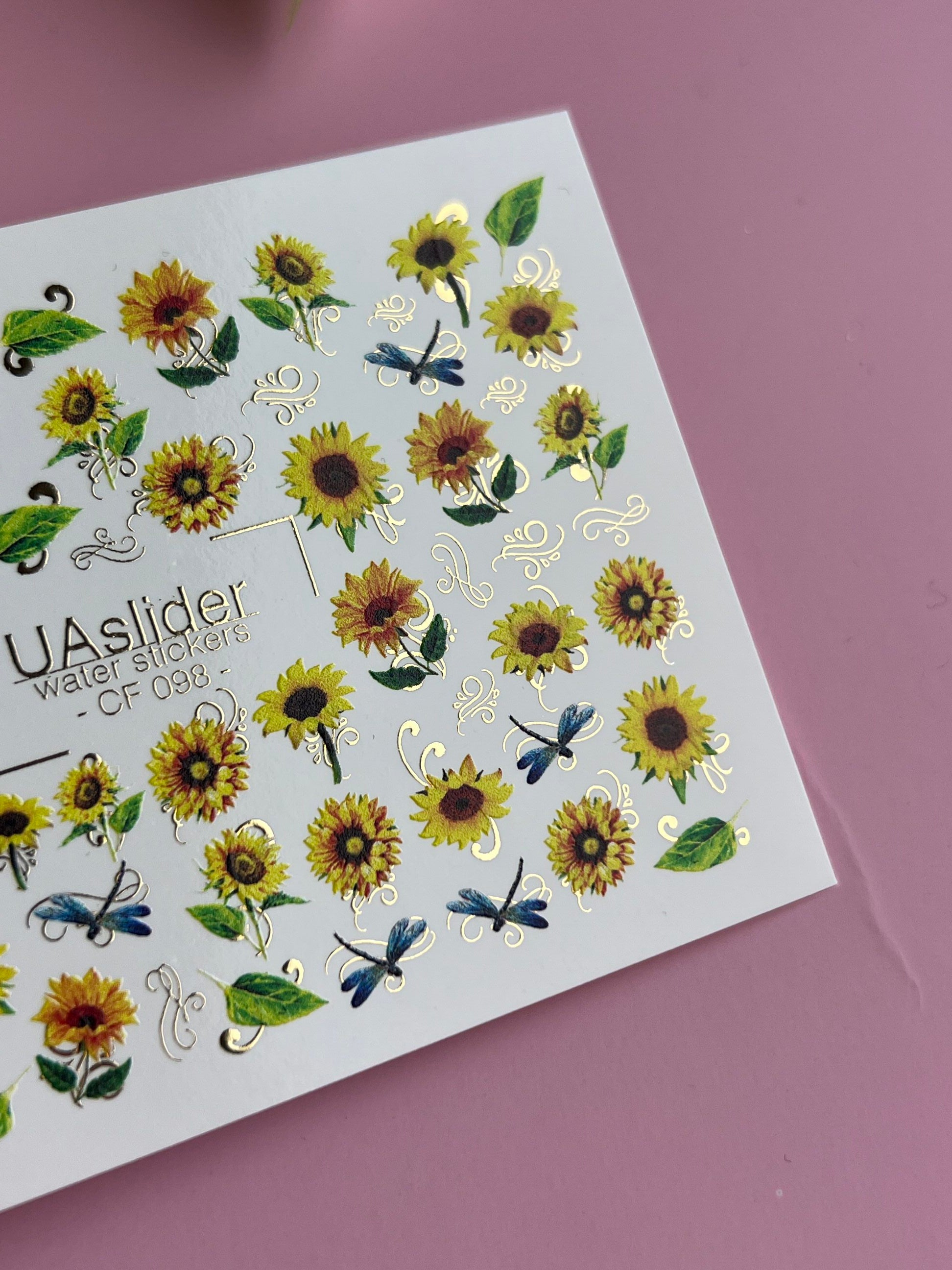 Décalcomanie d'eau pour ongles CF-098 | Décalcomanies d'eau florales pour ongles | Tournesols et libellules bleues