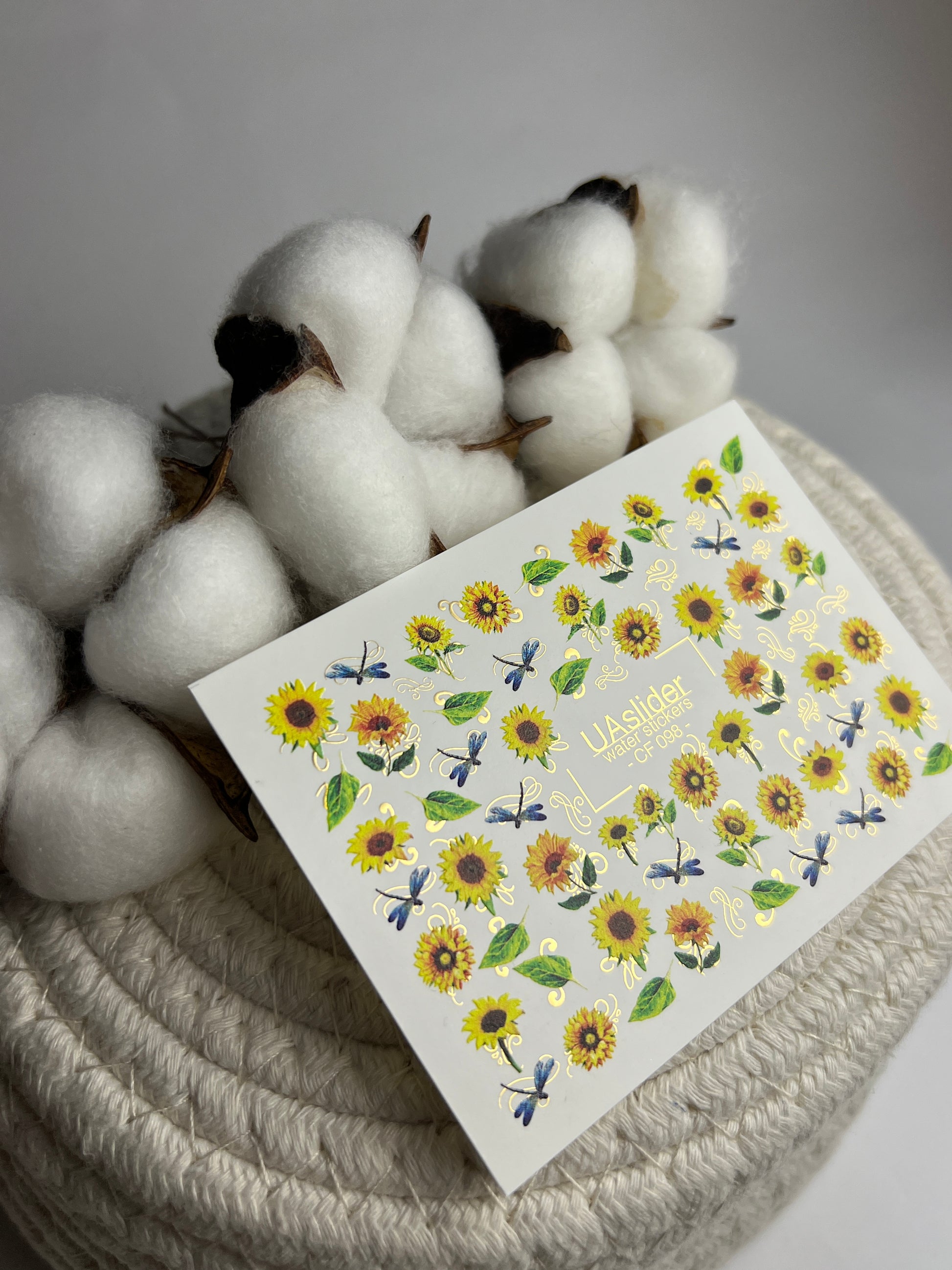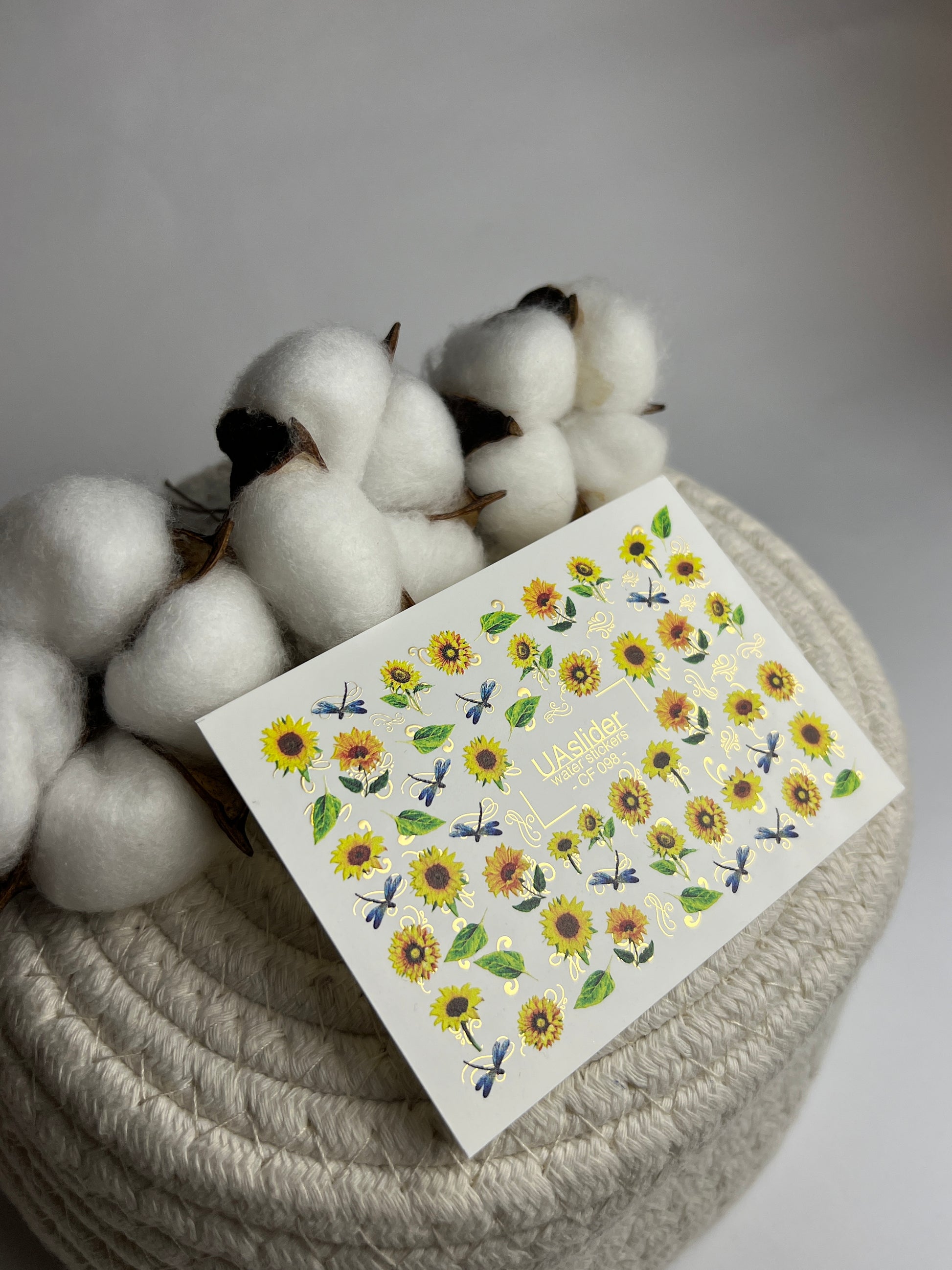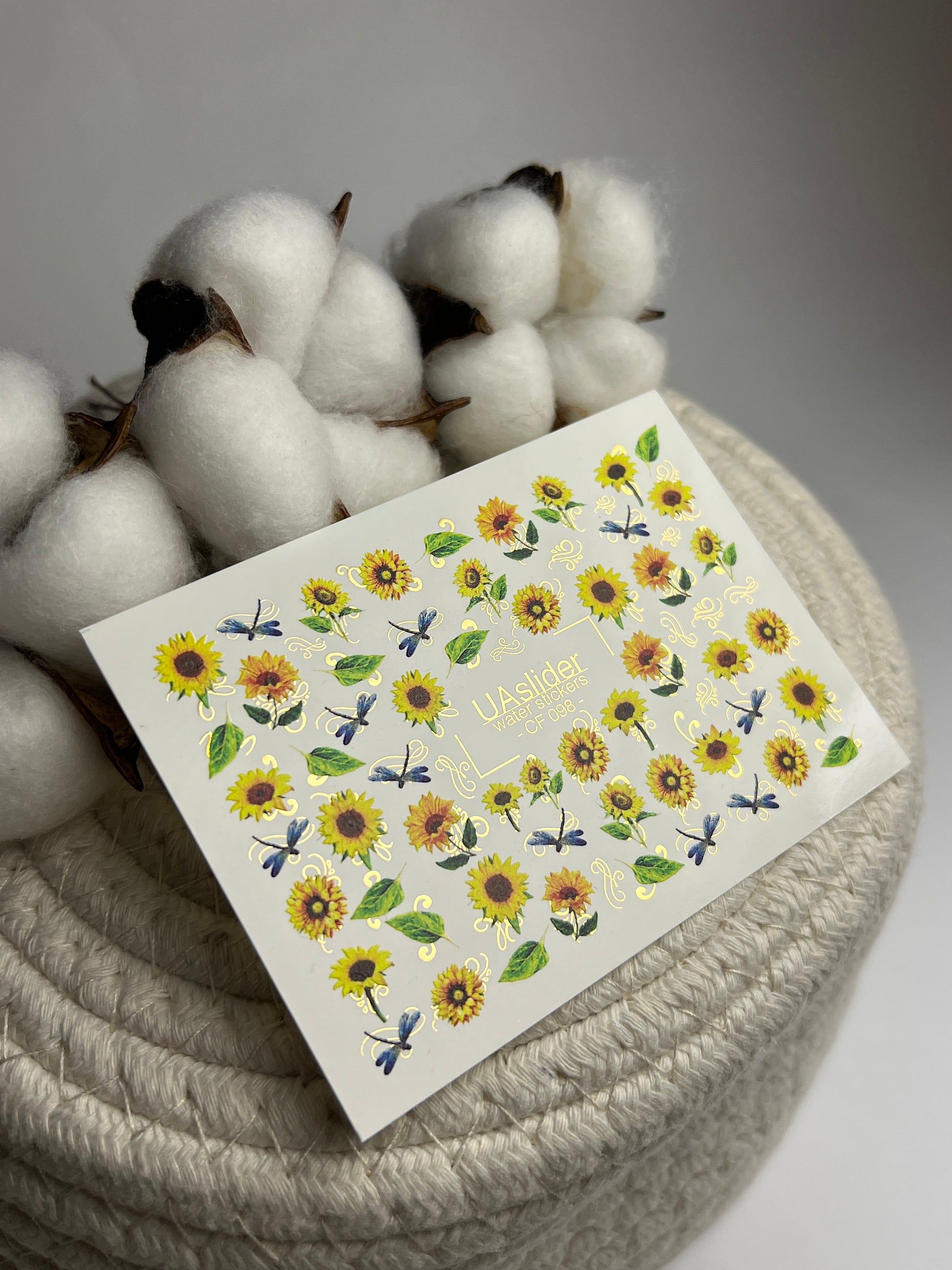Décalcomanie d'eau pour ongles CF-098 | Décalcomanies d'eau florales pour ongles | Tournesols et libellules bleues