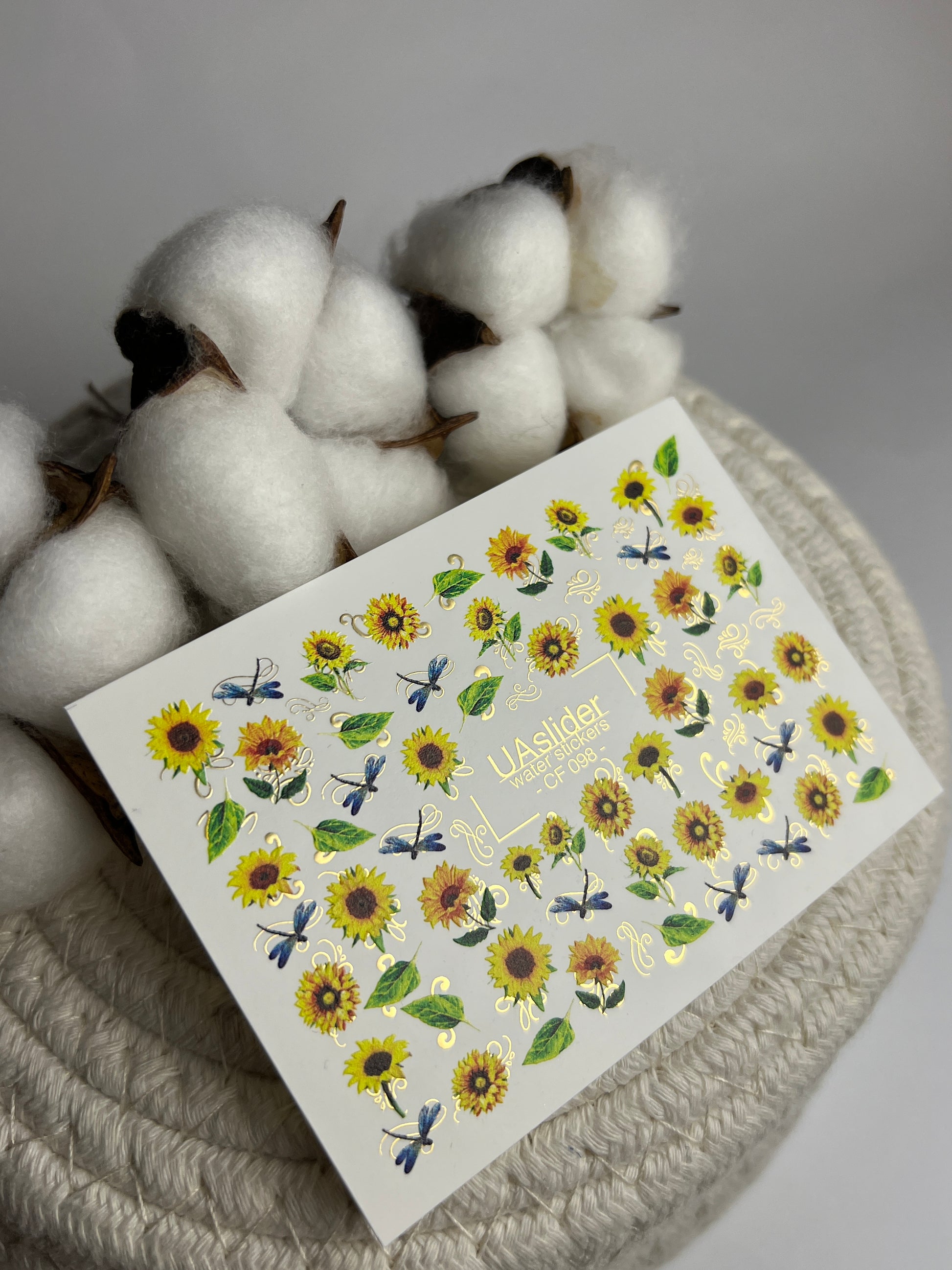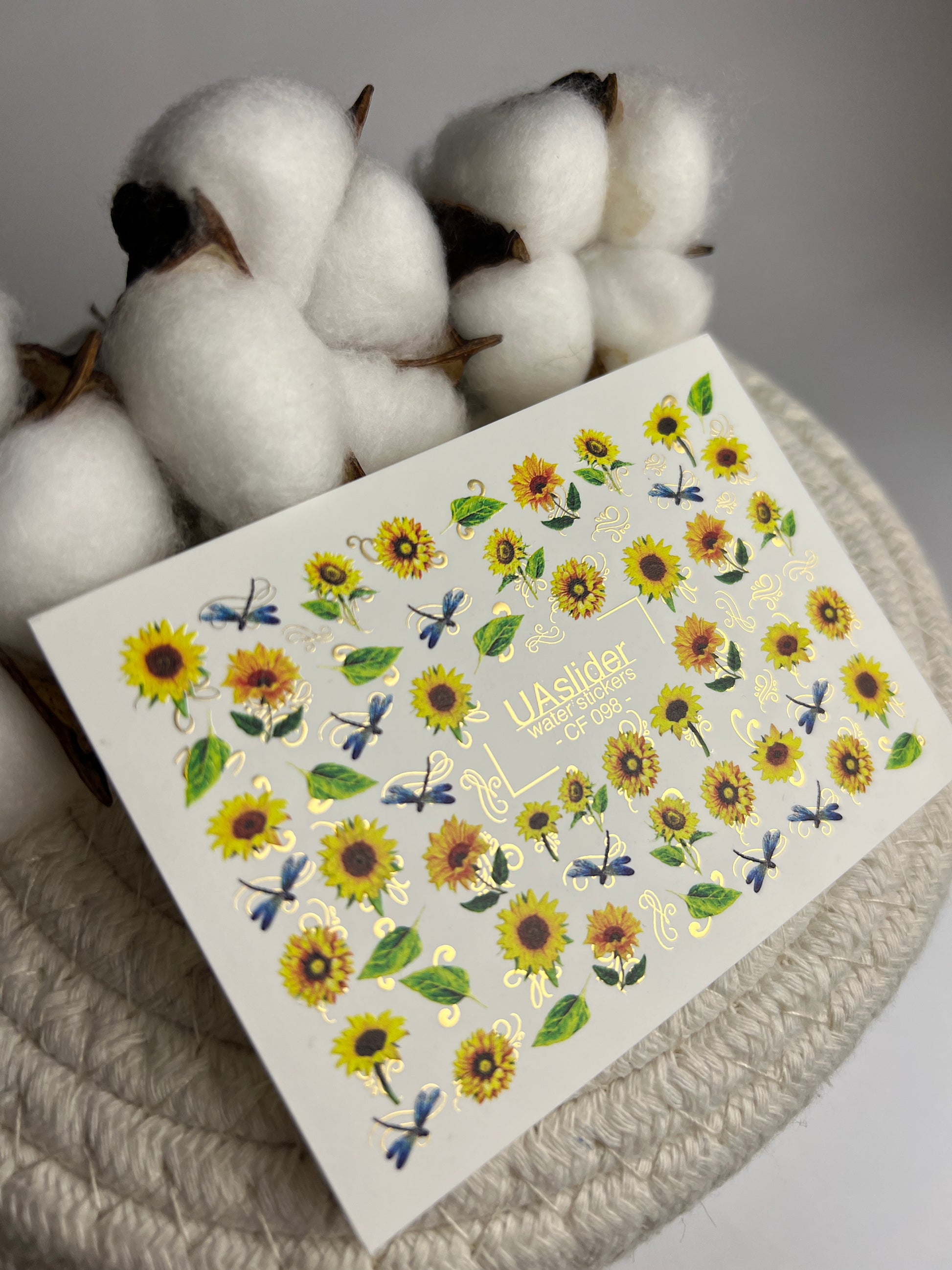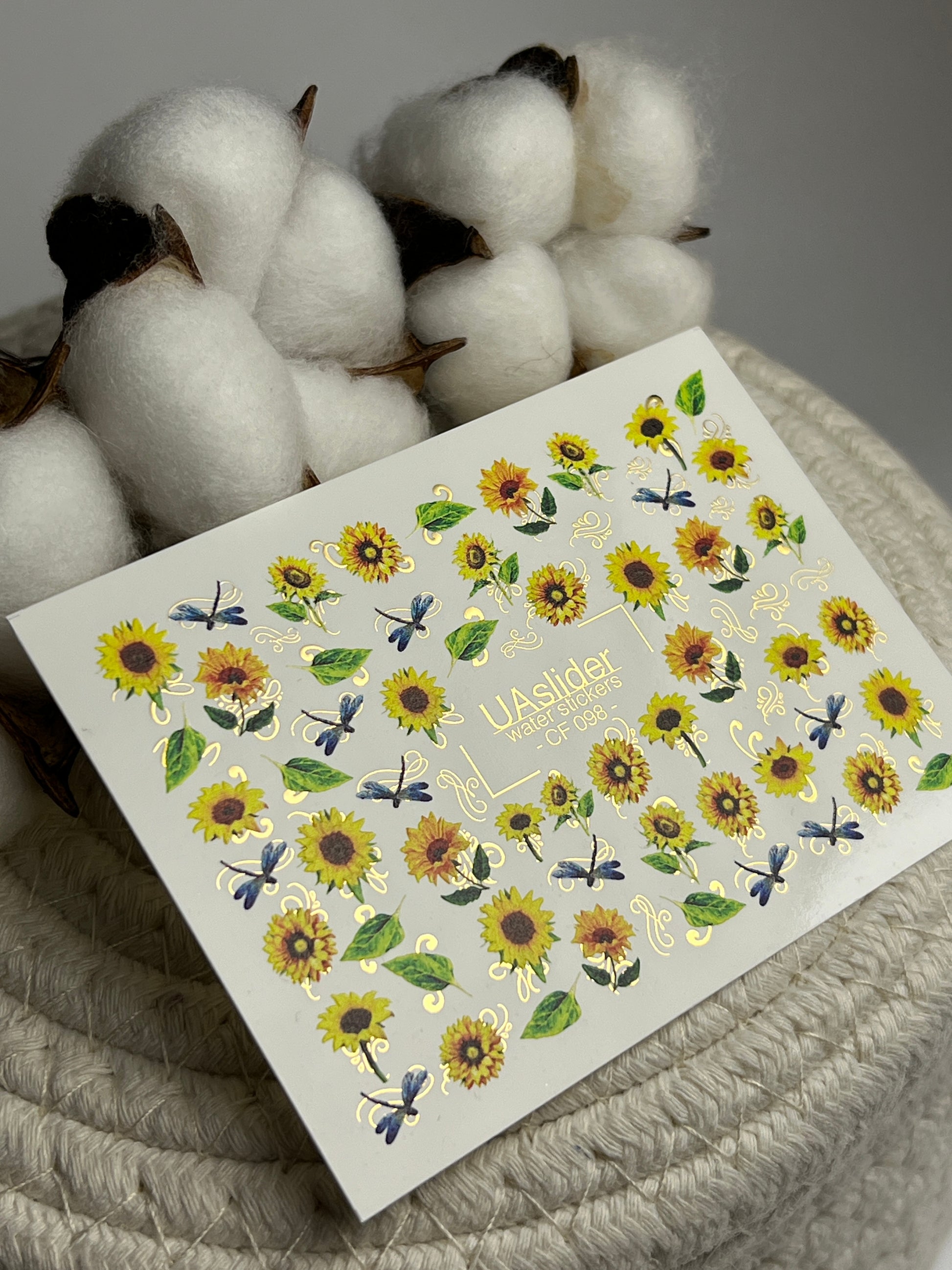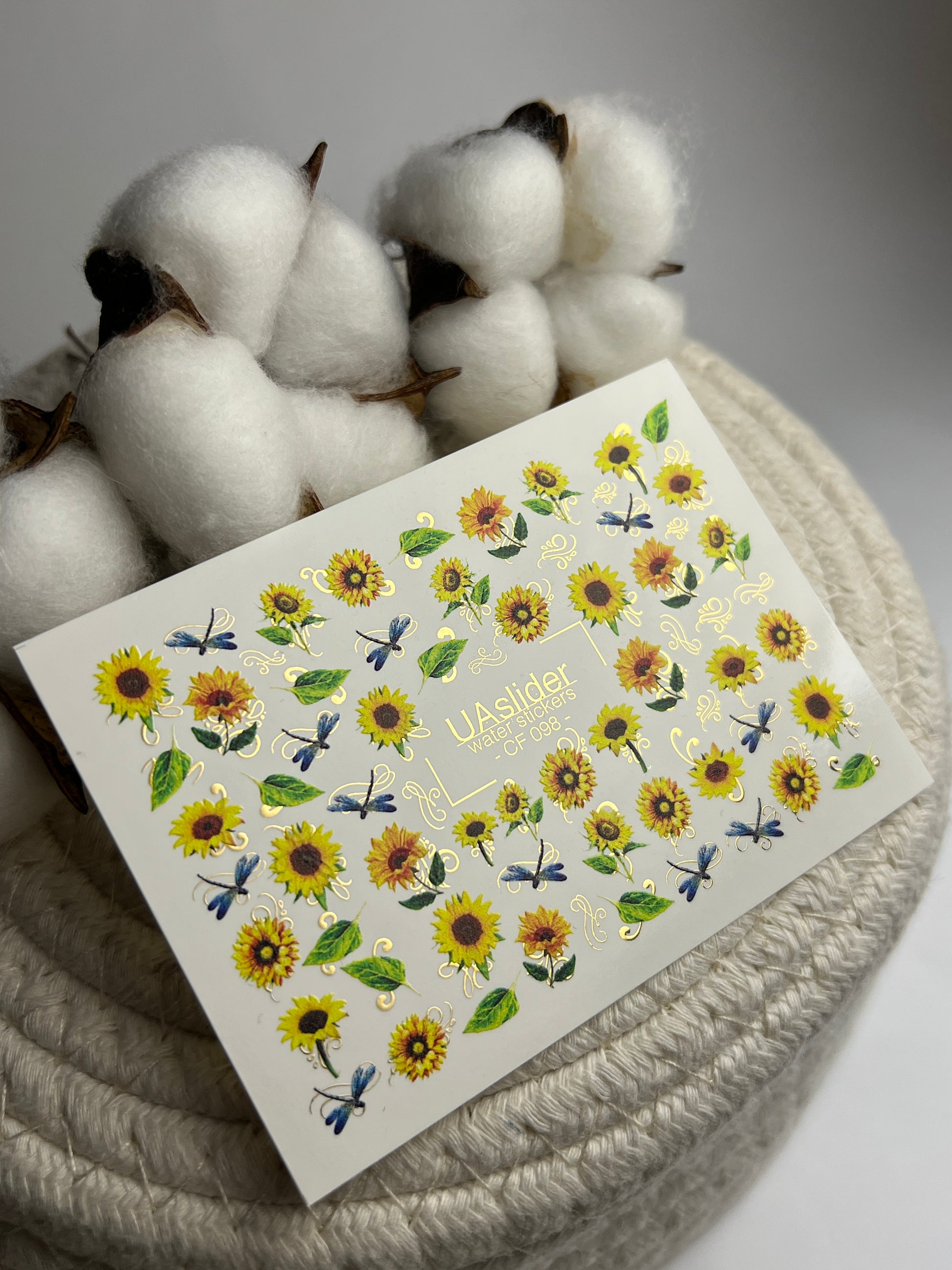 Décalcomanie d'eau pour ongles CF-098 | Décalcomanies d'eau florales pour ongles | Tournesols et libellules bleues