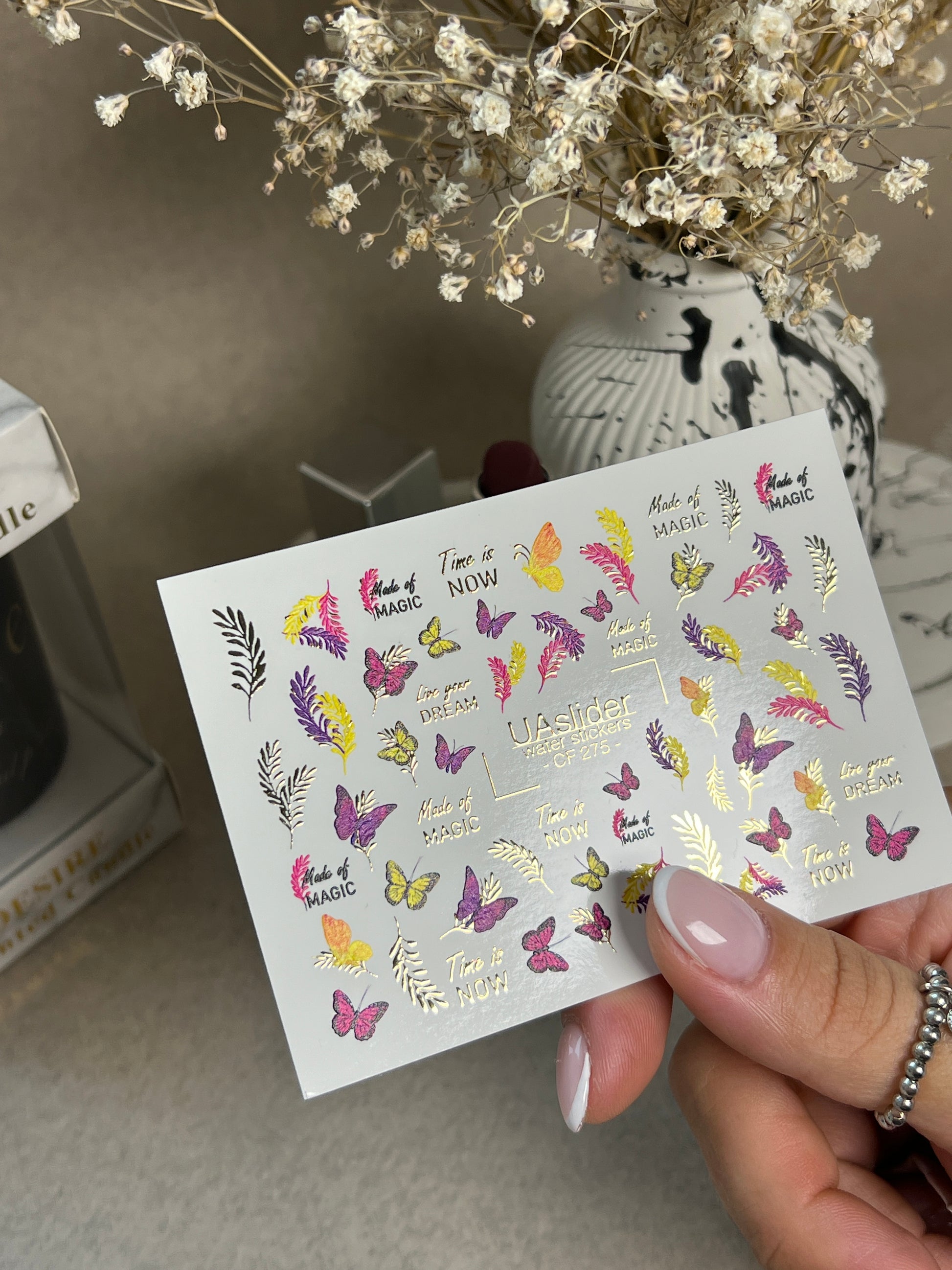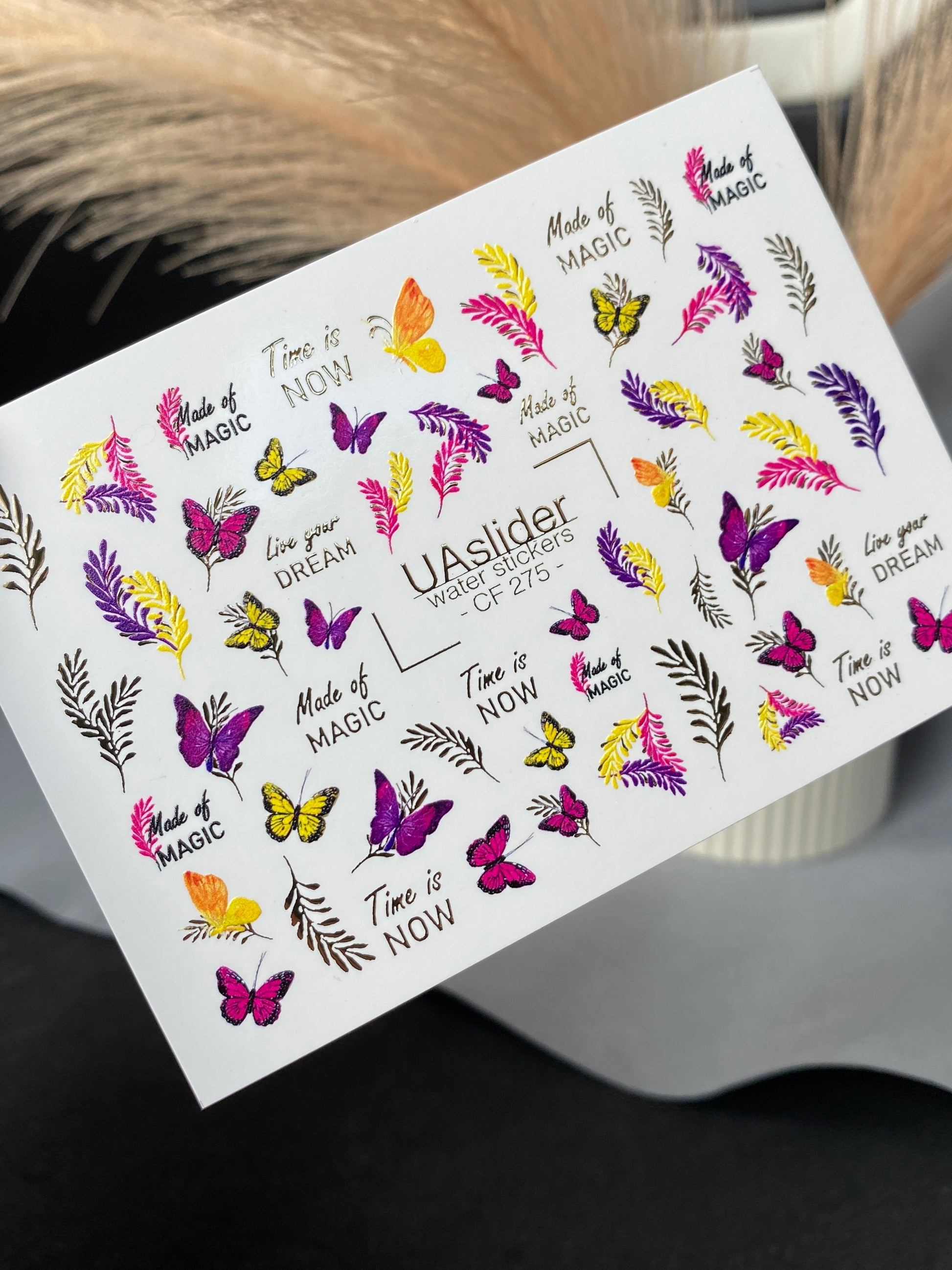 Décalcomanie d'eau pour ongles CF-275 | Décalcomanies d'eau pour ongles papillon | Papillons colorés, feuilles et citations magiquesCF_275