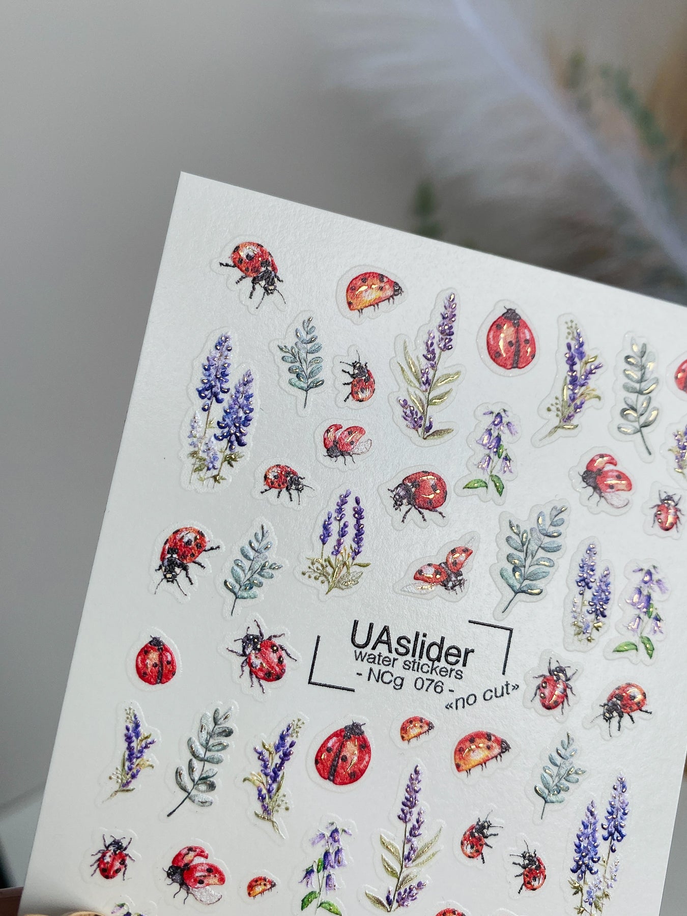מדבקות ציפורניים עם דמויות חמודות של חיפושיות וענפי לבנדר עדינים. מדבקות מים אלו מופעלות במים — פשוט להשרות במים, וכל אלמנט מחליק בקלות להעברה פשוטה.