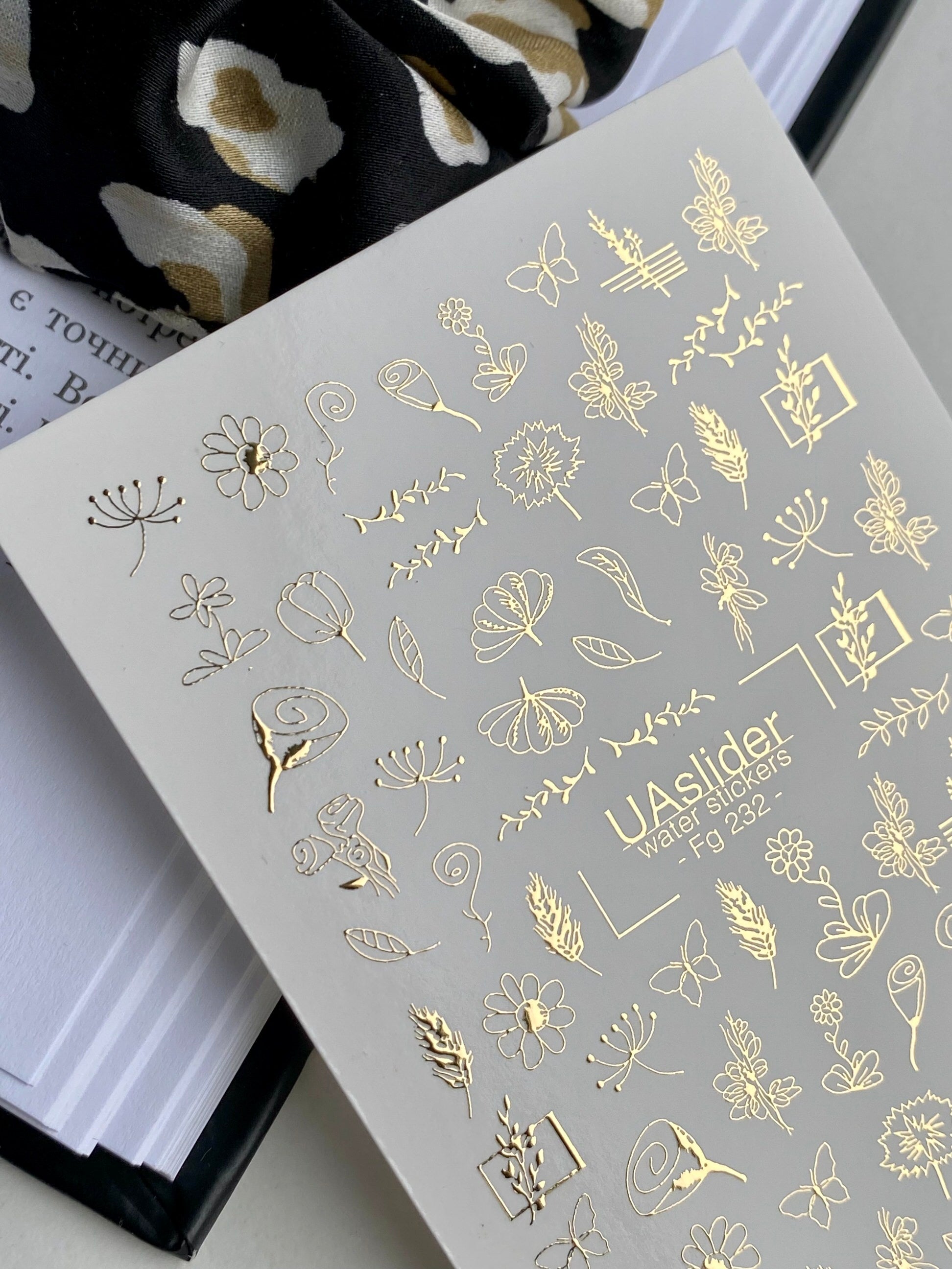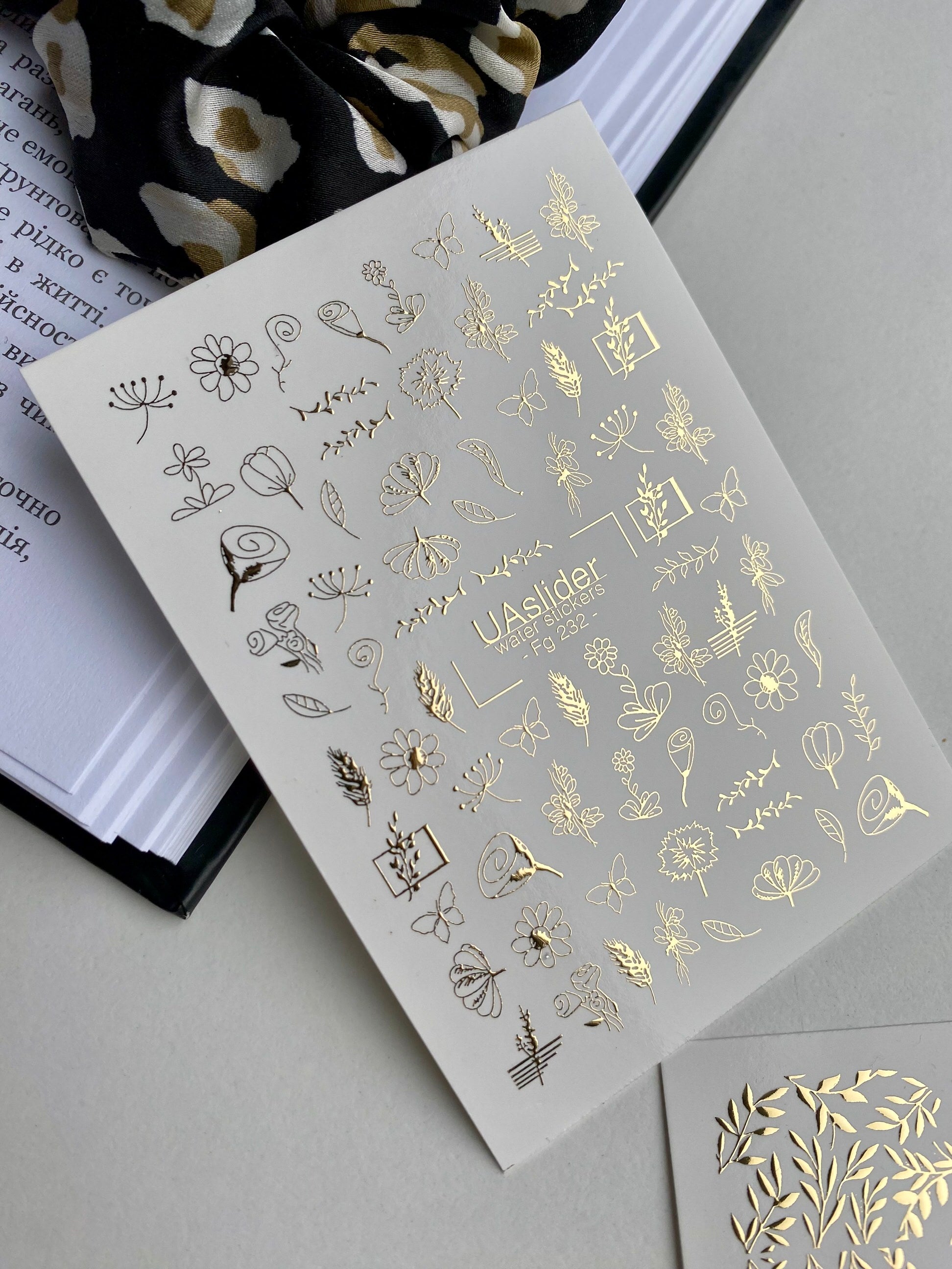 Köröm víz matrica Fg-232 | Vízsikló köröm matricák | Arany fólia virágok és pillangók