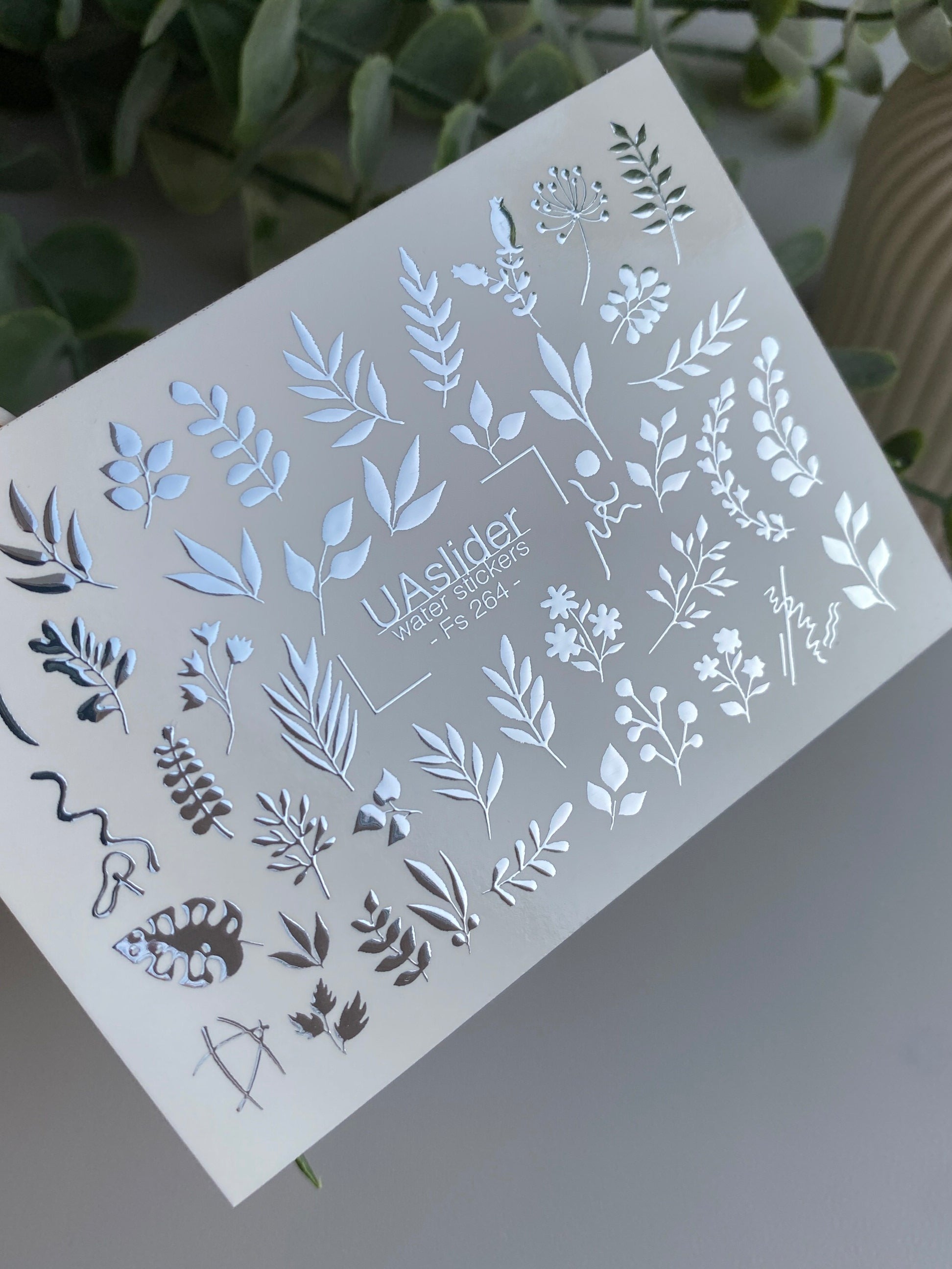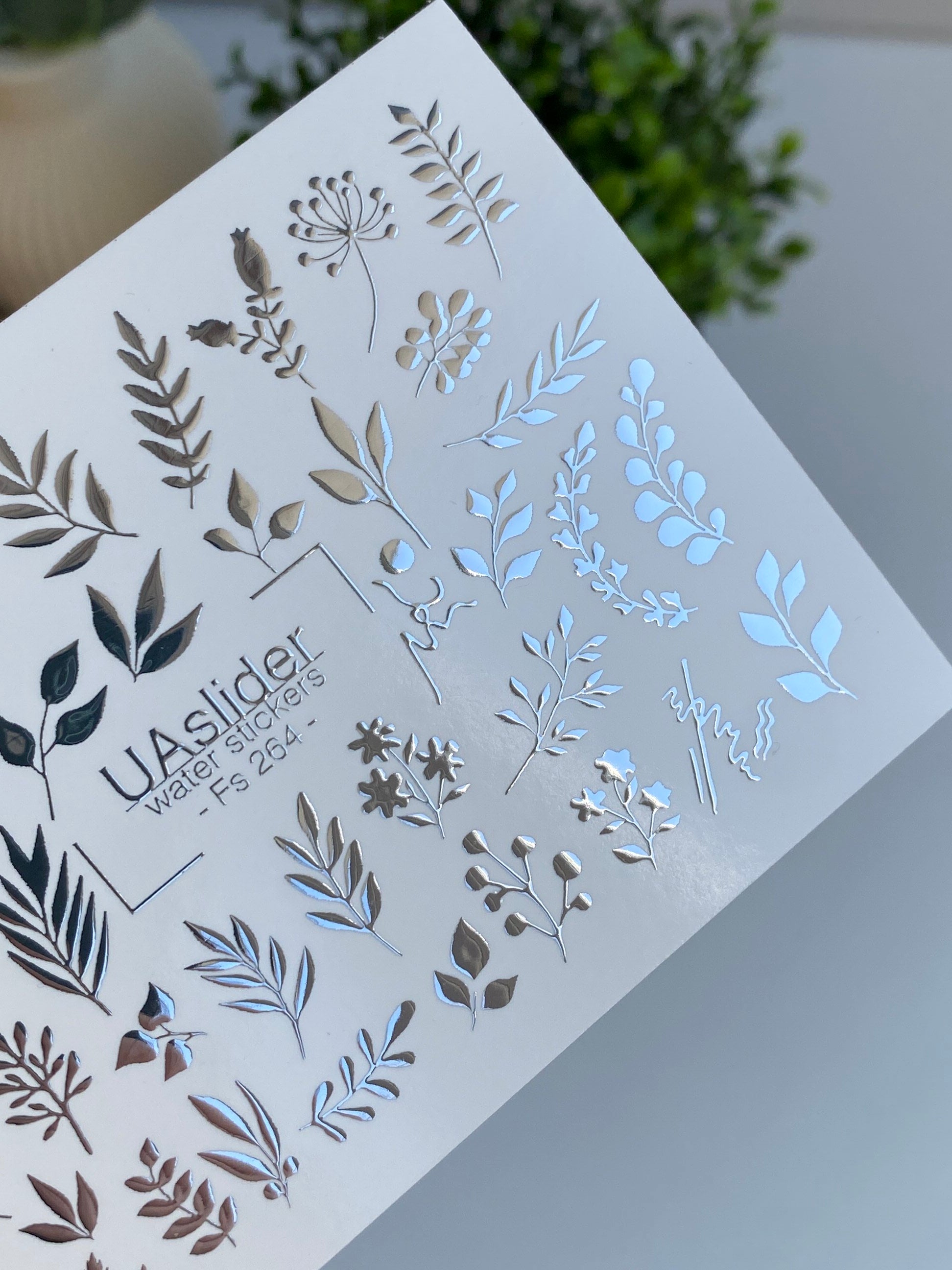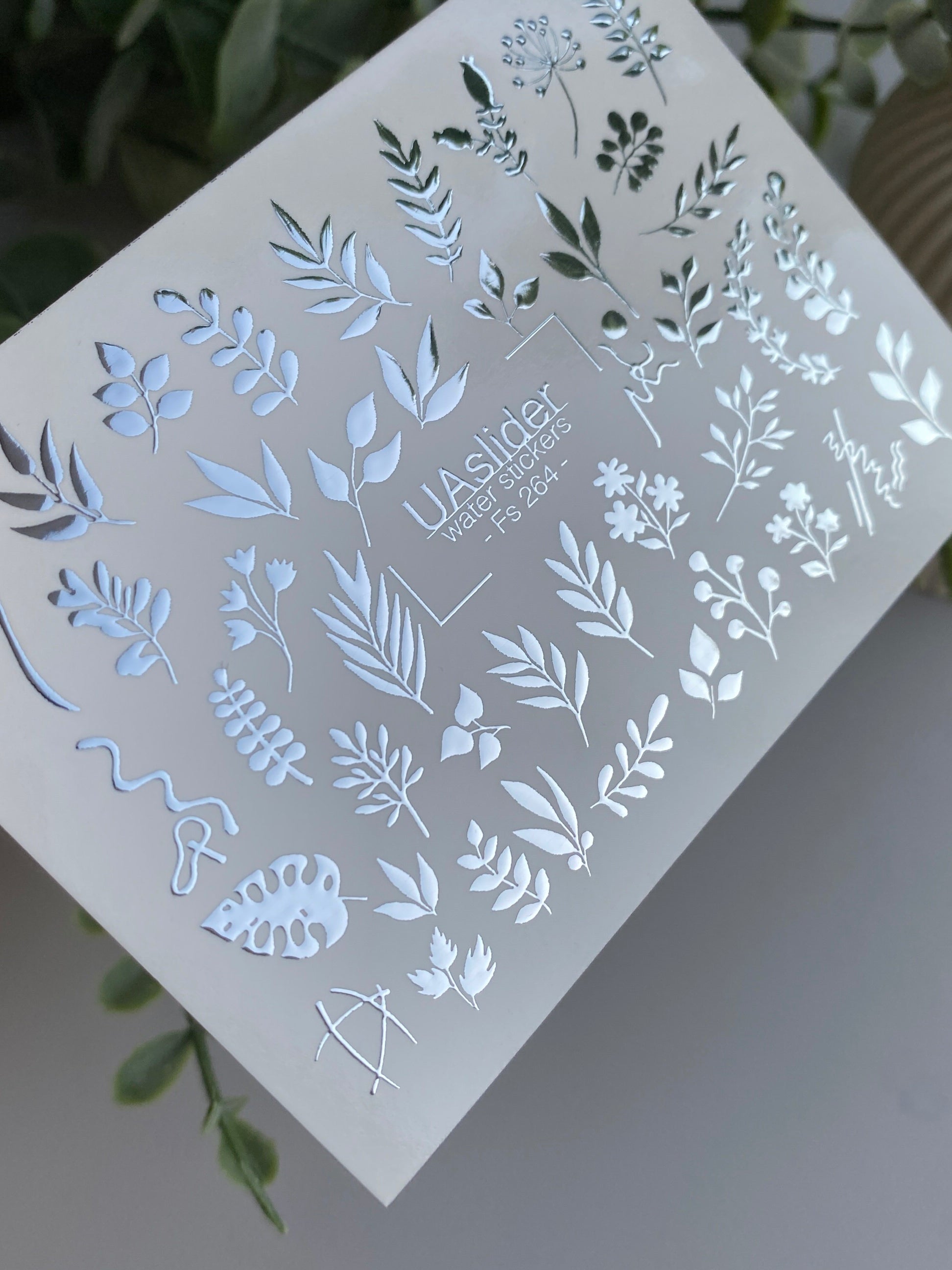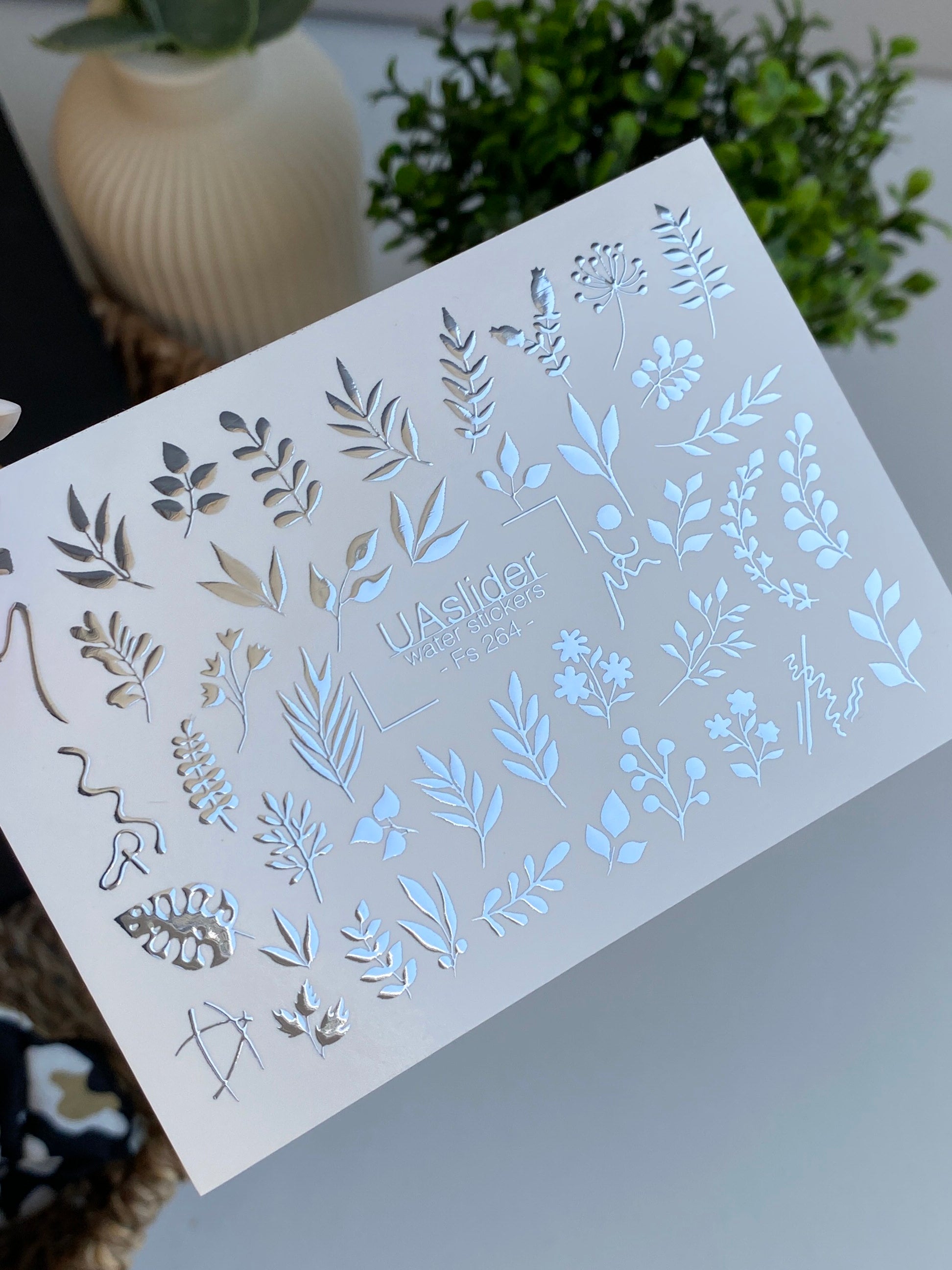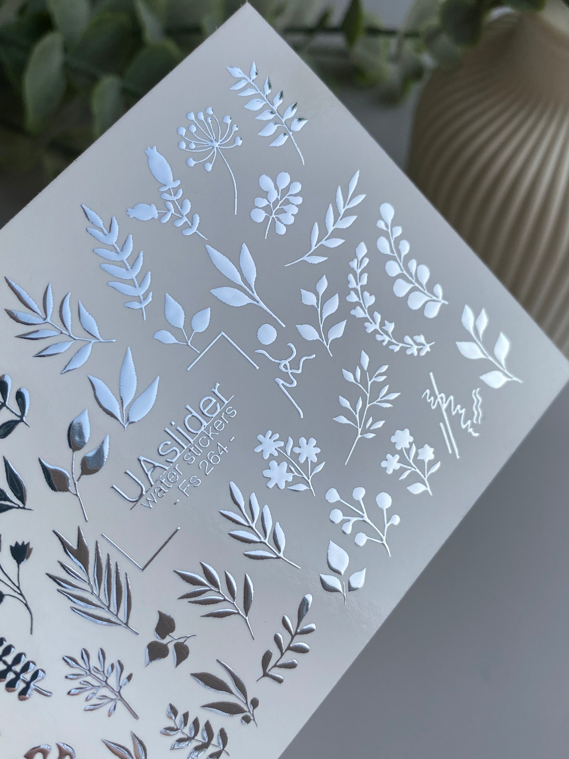 Köröm víz matrica Fs-264 | Botanikus vízcsúsztatós köröm matricák | Ezüst fólia levelek és virágos ágvégek