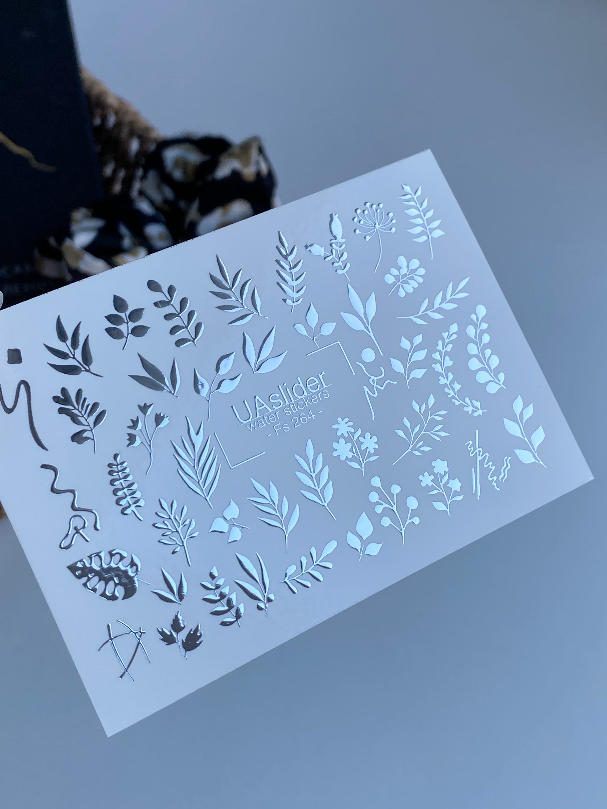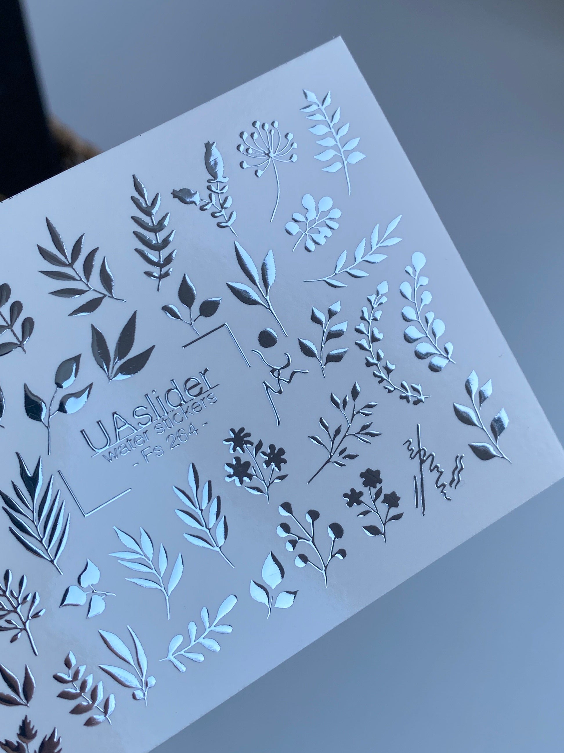 Botanikus víztranszfer körömmatricák fémes ezüst fóliával — különféle levelekkel, finom ágcskákkal és apró virágos részletekkel. Ezek a köröm vízmatricák vízaktiváltak: áztassa vízben, és a minta simán lecsúszik az átlátszó hordozóról az egyszerű átvitel érdekében.