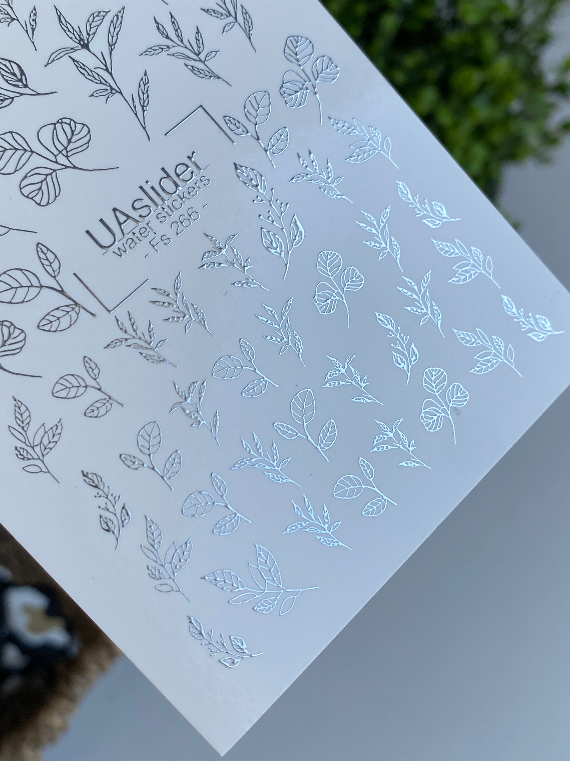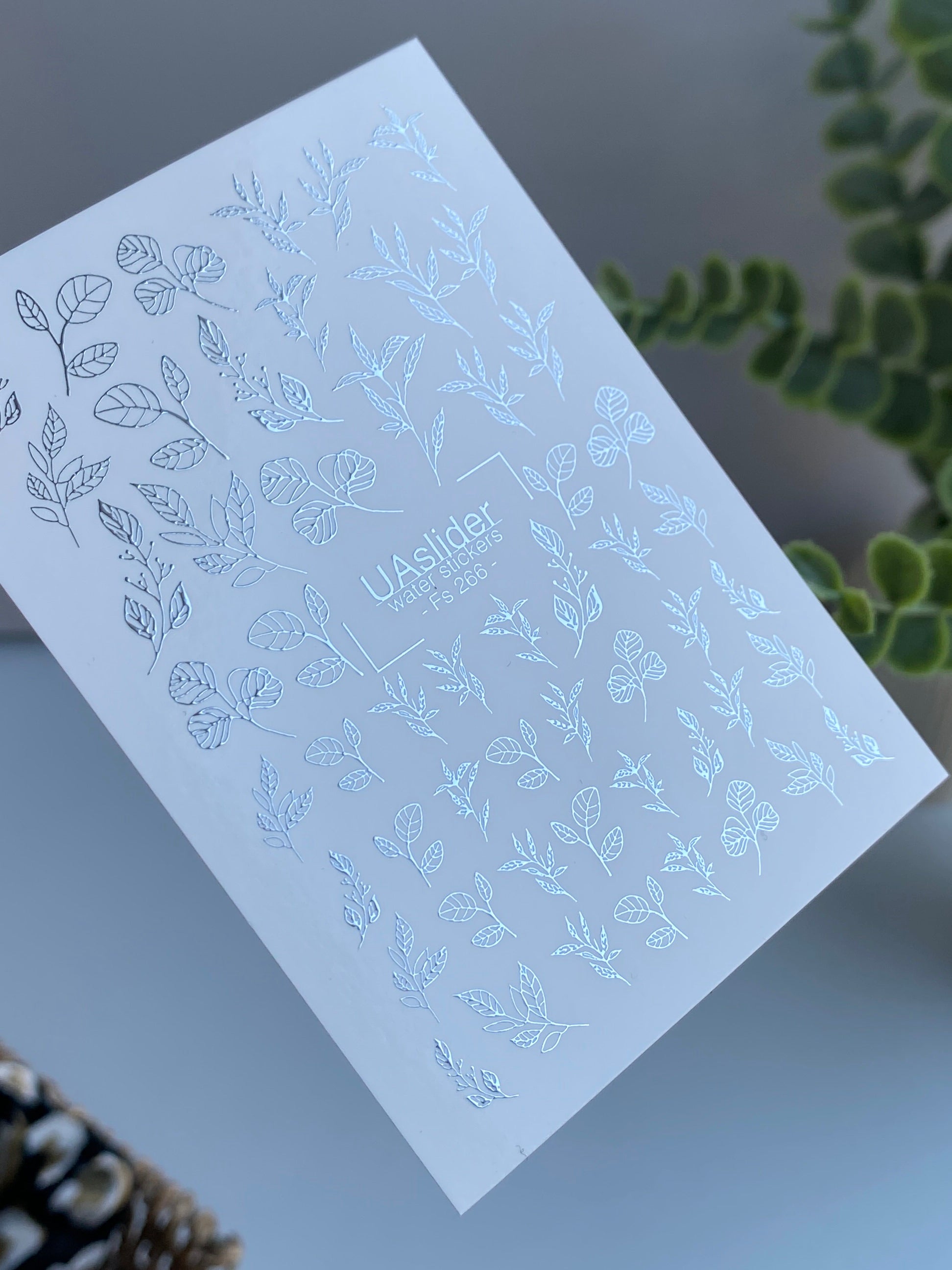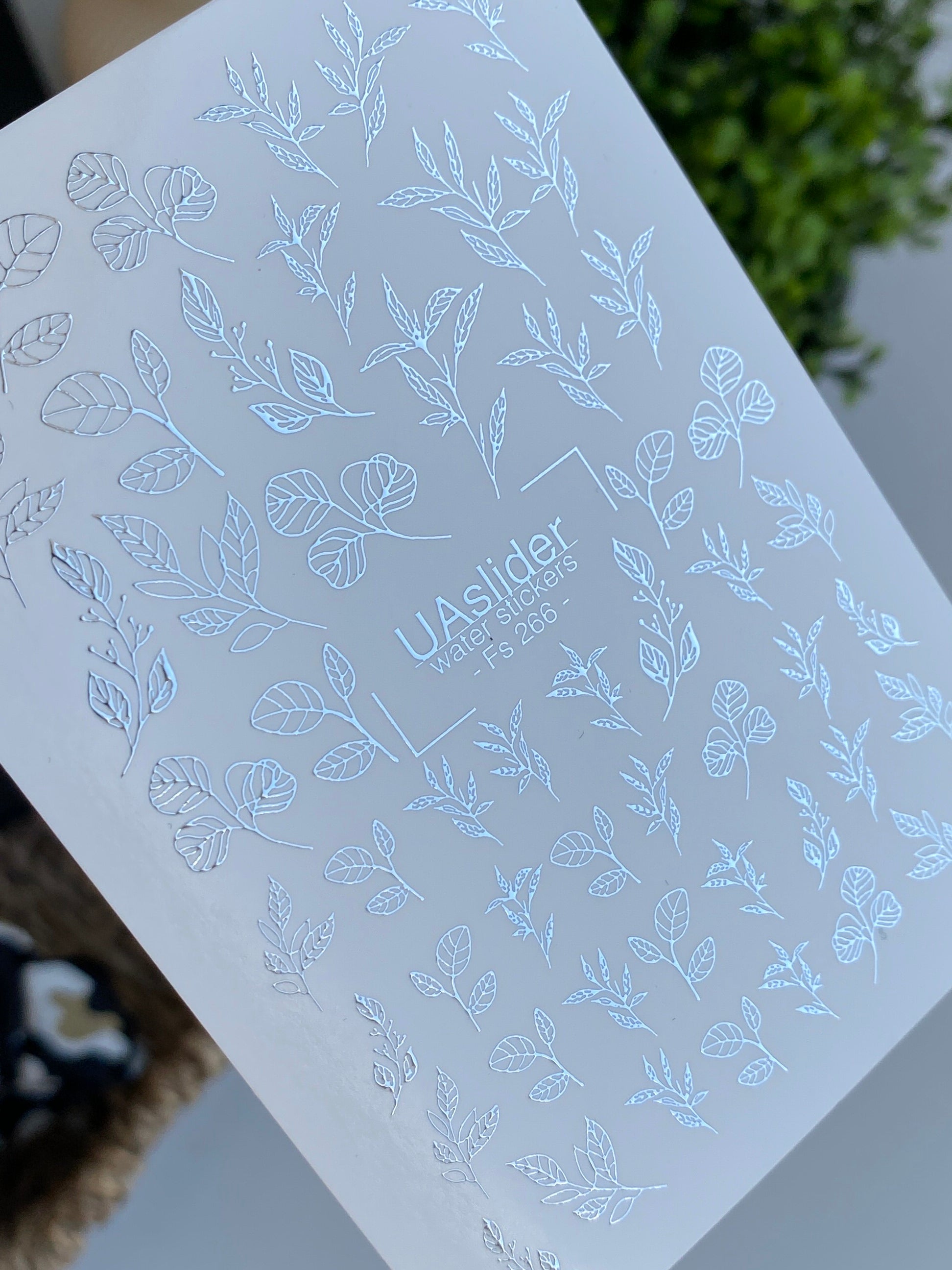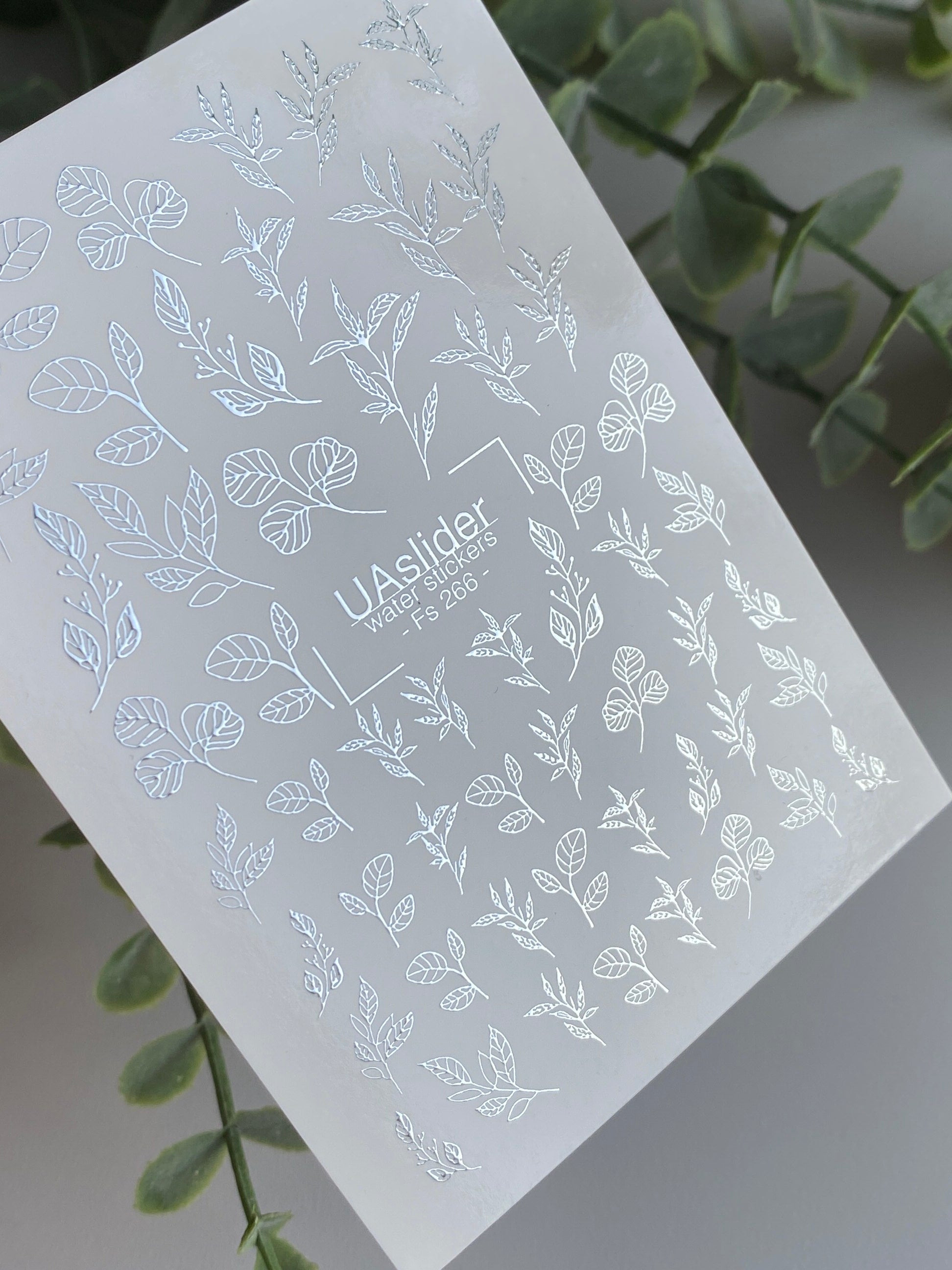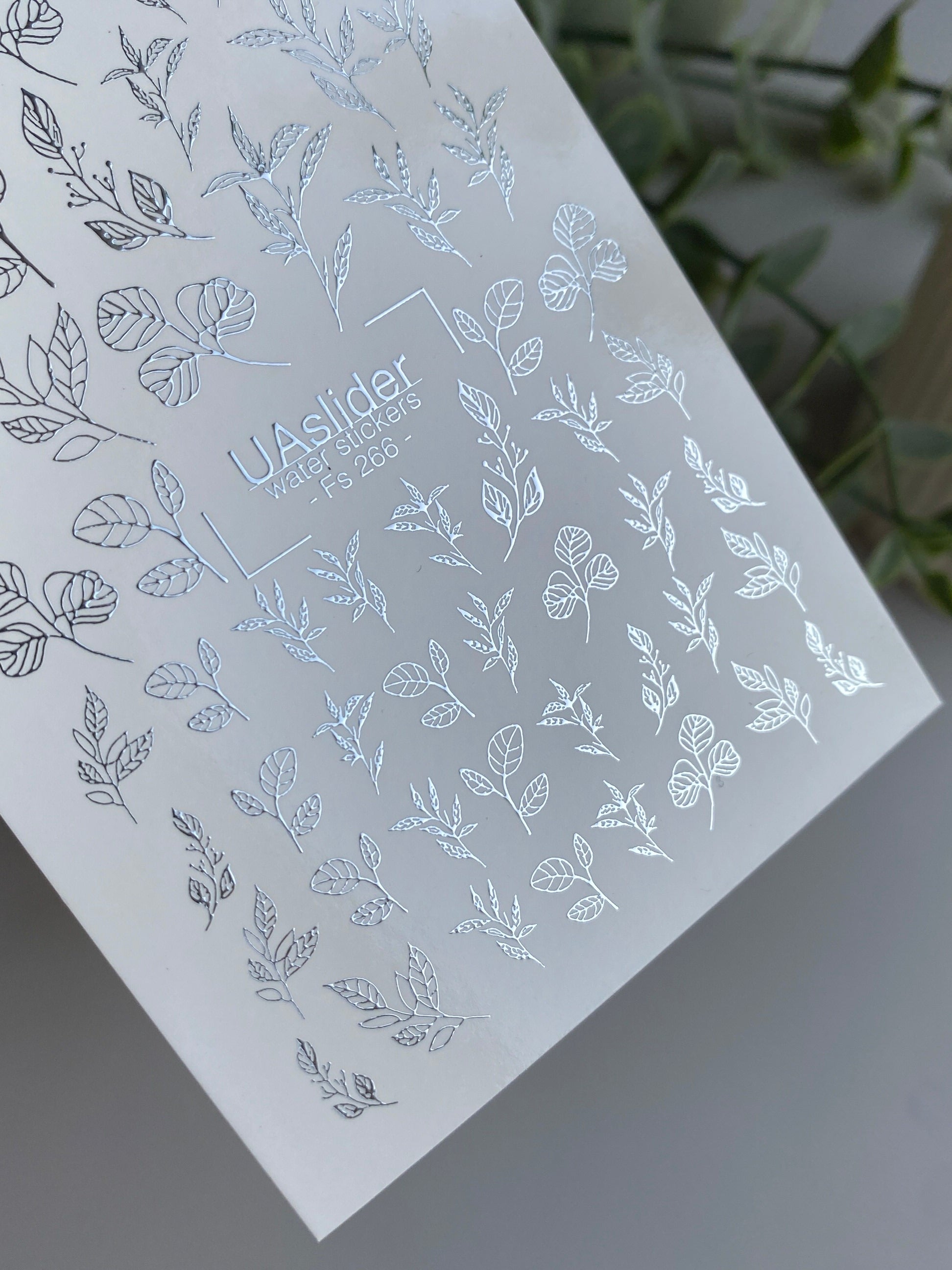 Köröm víz matrica Fs-266 | Botanikus vízcsúsztatós köröm matricák | Ezüst fólia levelek és ágak