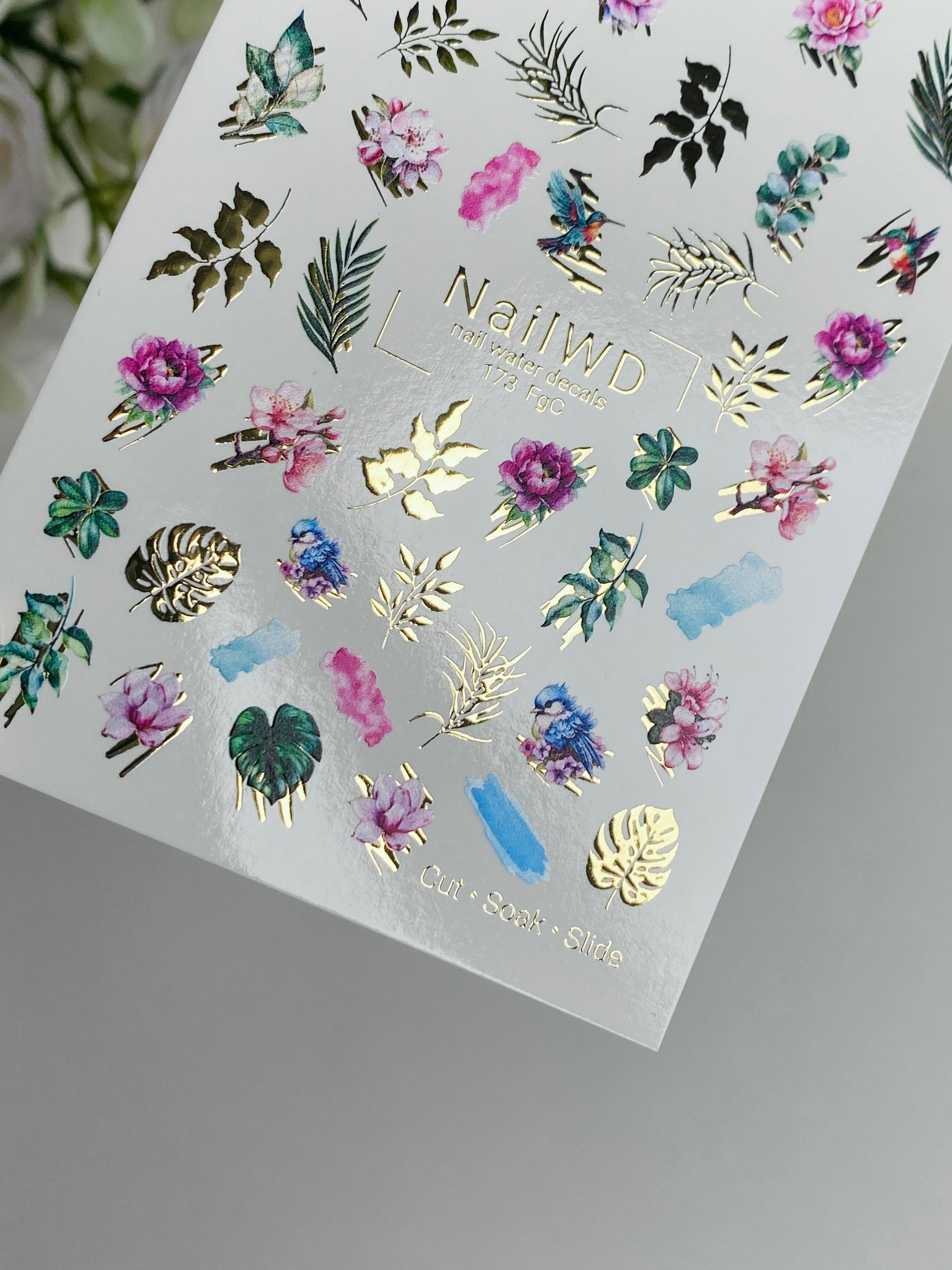 Adesivo per Unghie ad Acqua 173 Nail WD | Adesivi per Unghie a Scivolamento ad Acqua Fiori Tropicali e Foglie | Adesivi per Unghie ad Acqua Design Esotico con Accenti Dorati