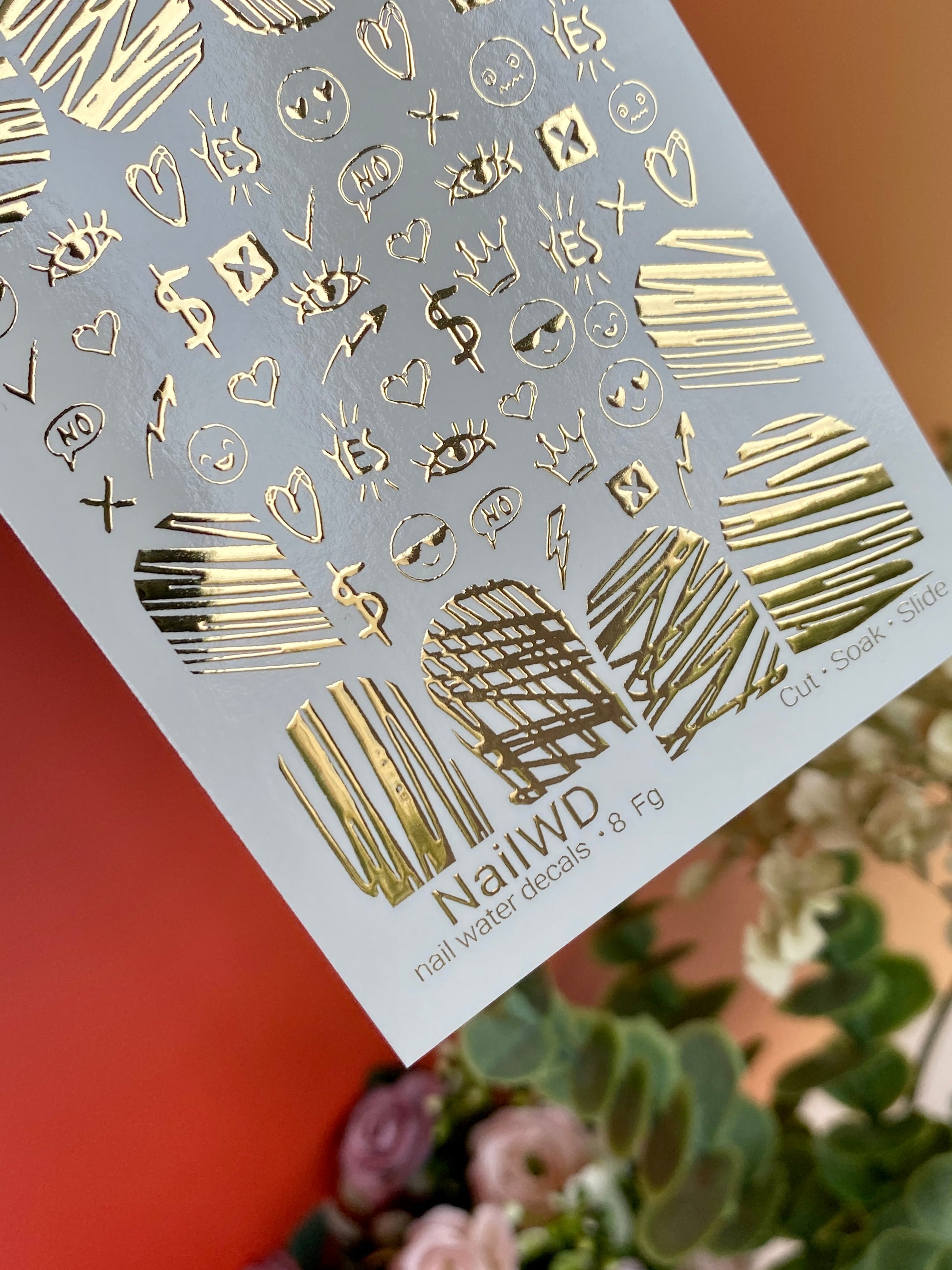 Adesivi per unghie trendy Water Slide con grafiche astratte dorate — strisce, cuori, occhi, corone, frecce e simboli giocosi come YES/NO e faccine sorridenti. Questi adesivi per unghie ad acqua si attivano con l'acqua — immergi per applicare, e ogni design scivola via facilmente per un trasferimento pulito.