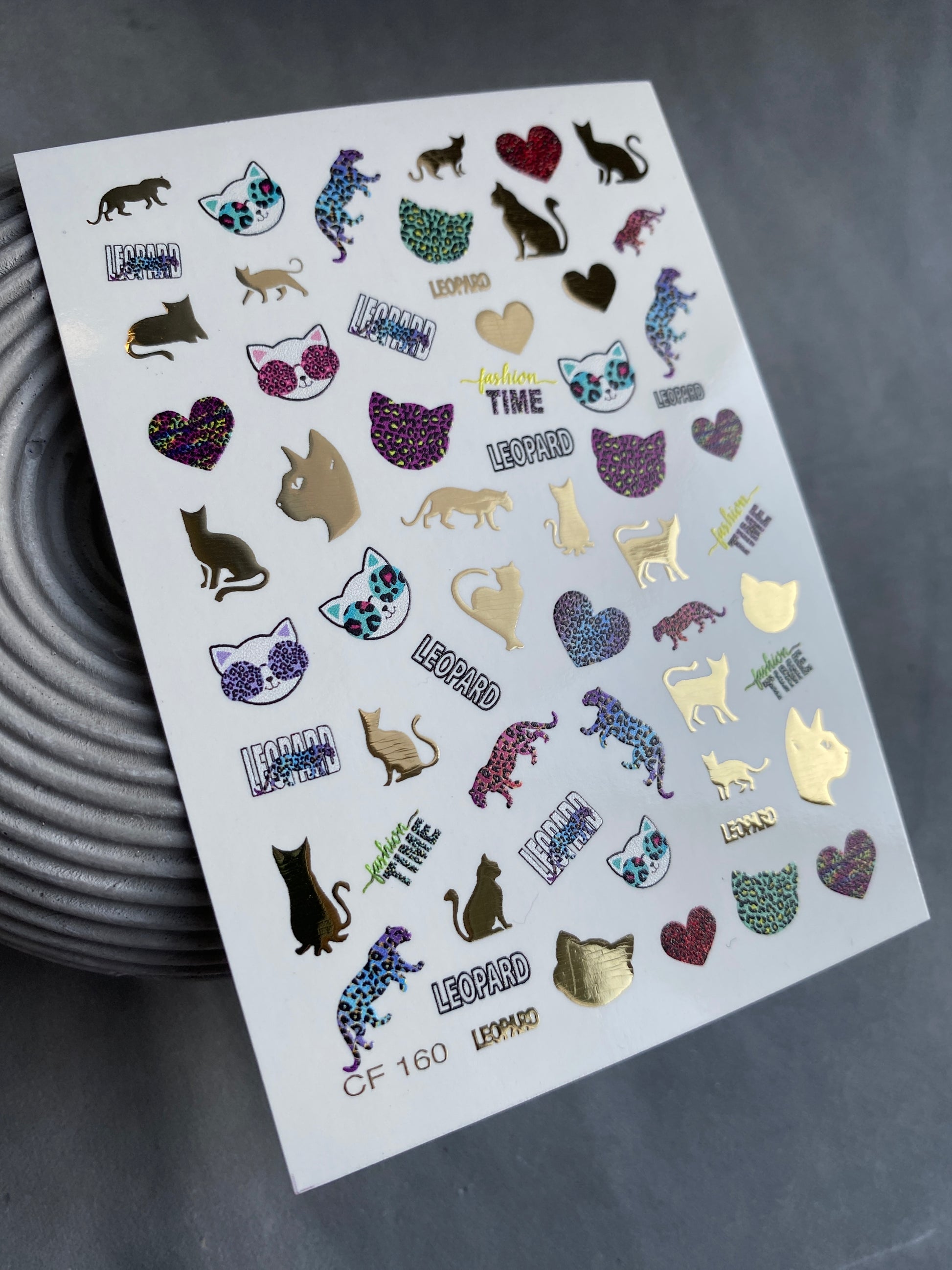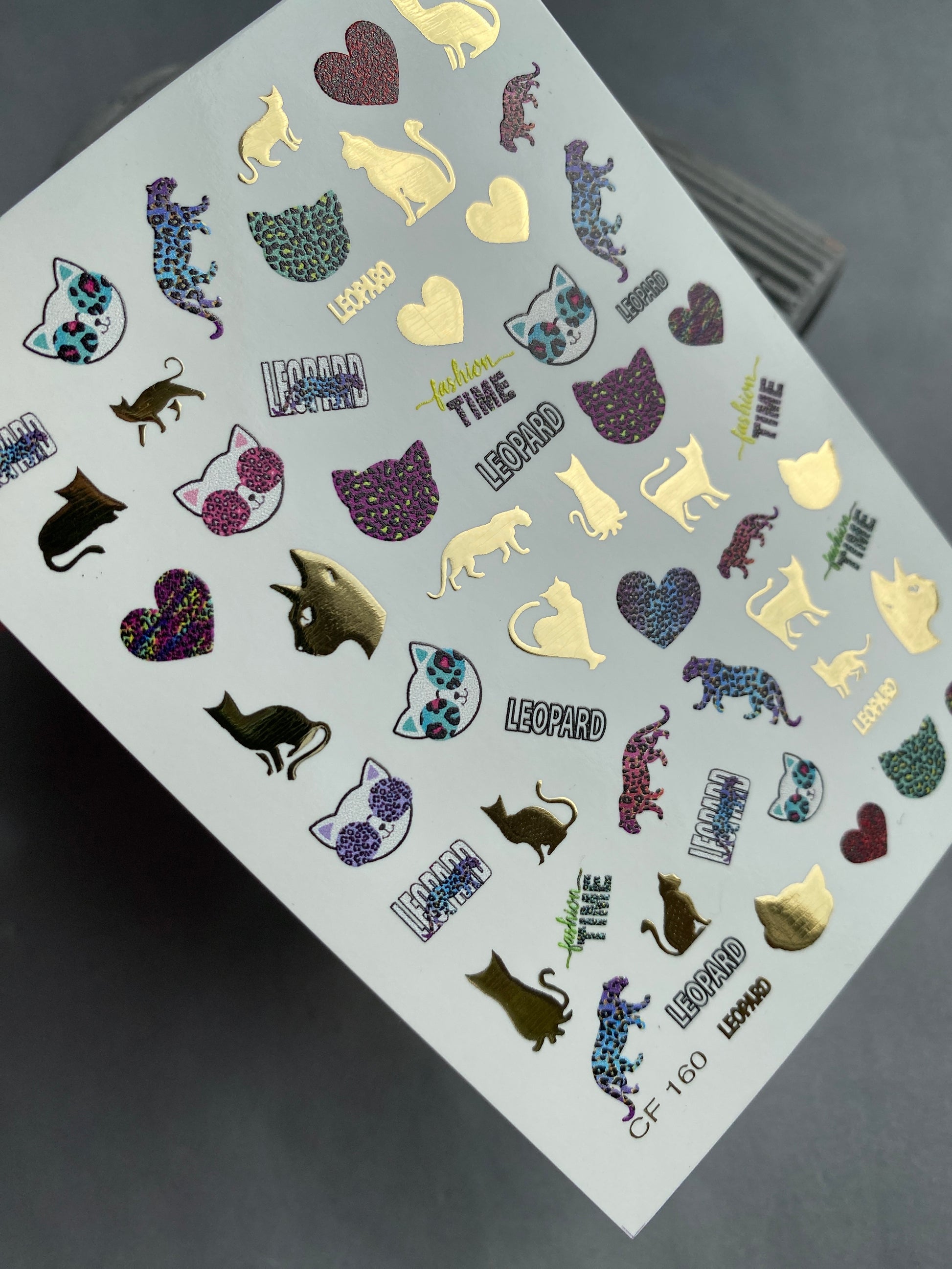 Adesivi per unghie ad acqua CF-160 | Adesivi per unghie a scivolamento ad acqua con leopardo e gatto | Stampa animale, cuori e accenti in foglia d'oroCF_160