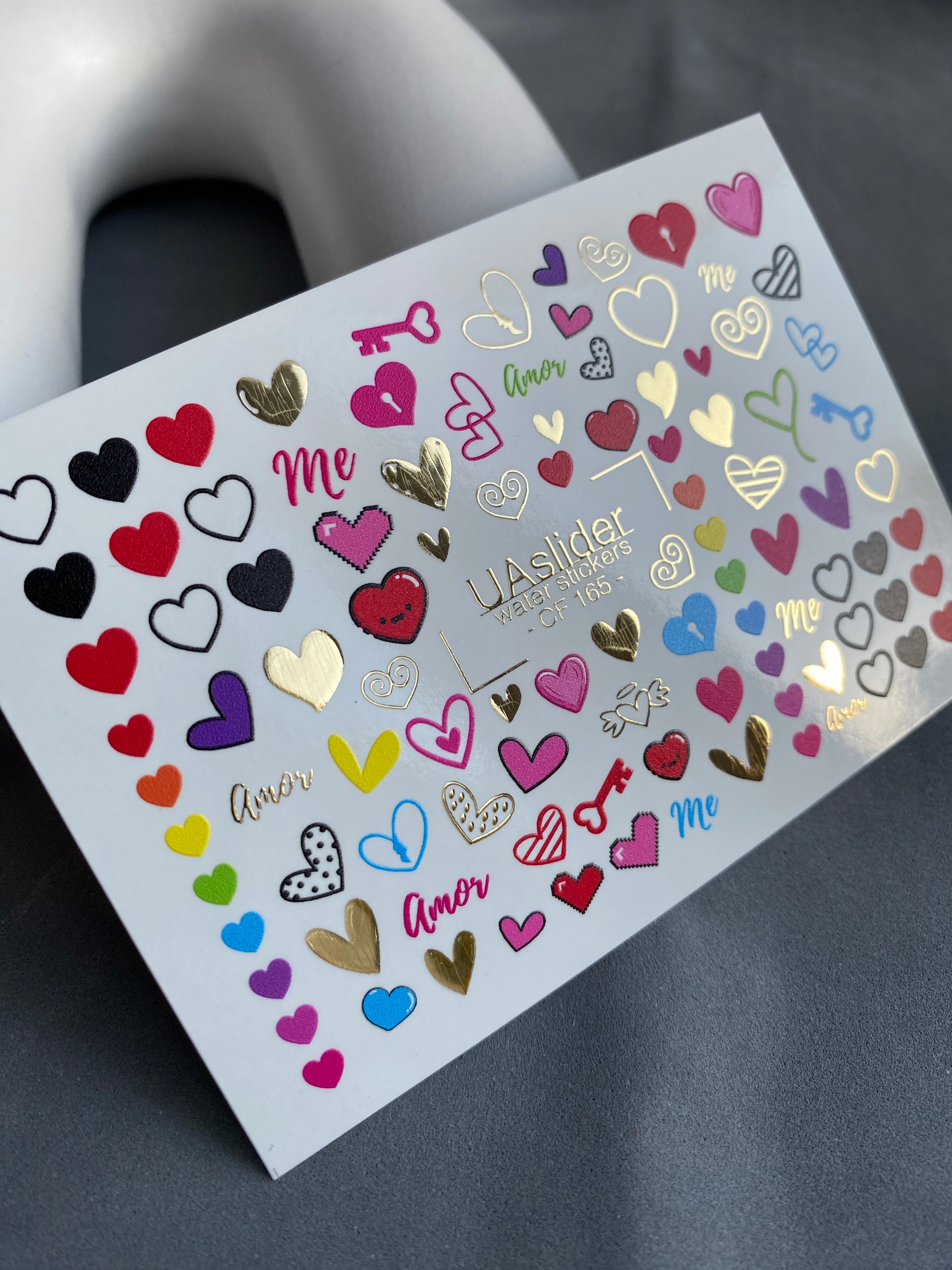 Adesivi per unghie a trasferimento ad acqua romantici con cuori colorati, chiavi e scritte come Amor e Me. Perfetti per manicure di San Valentino, nail art per matrimoni o design ispirati all'amore.