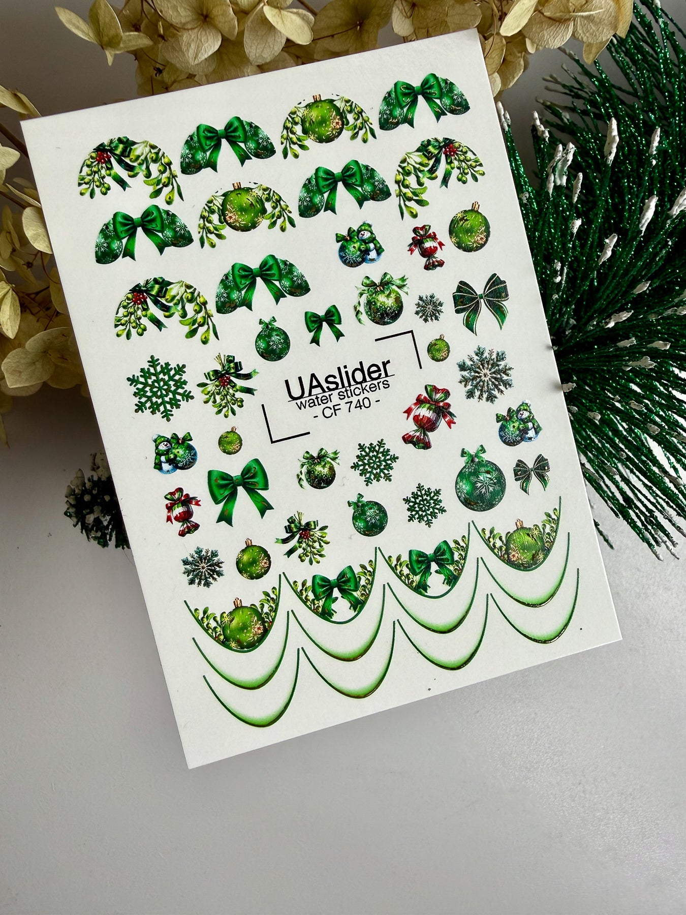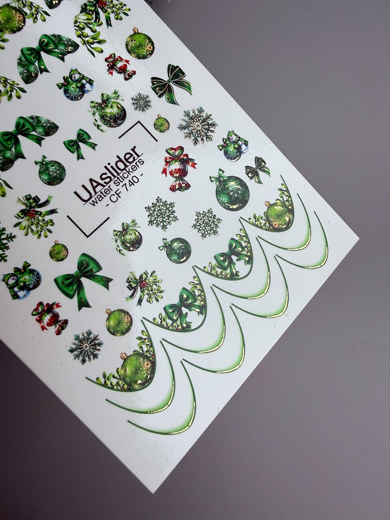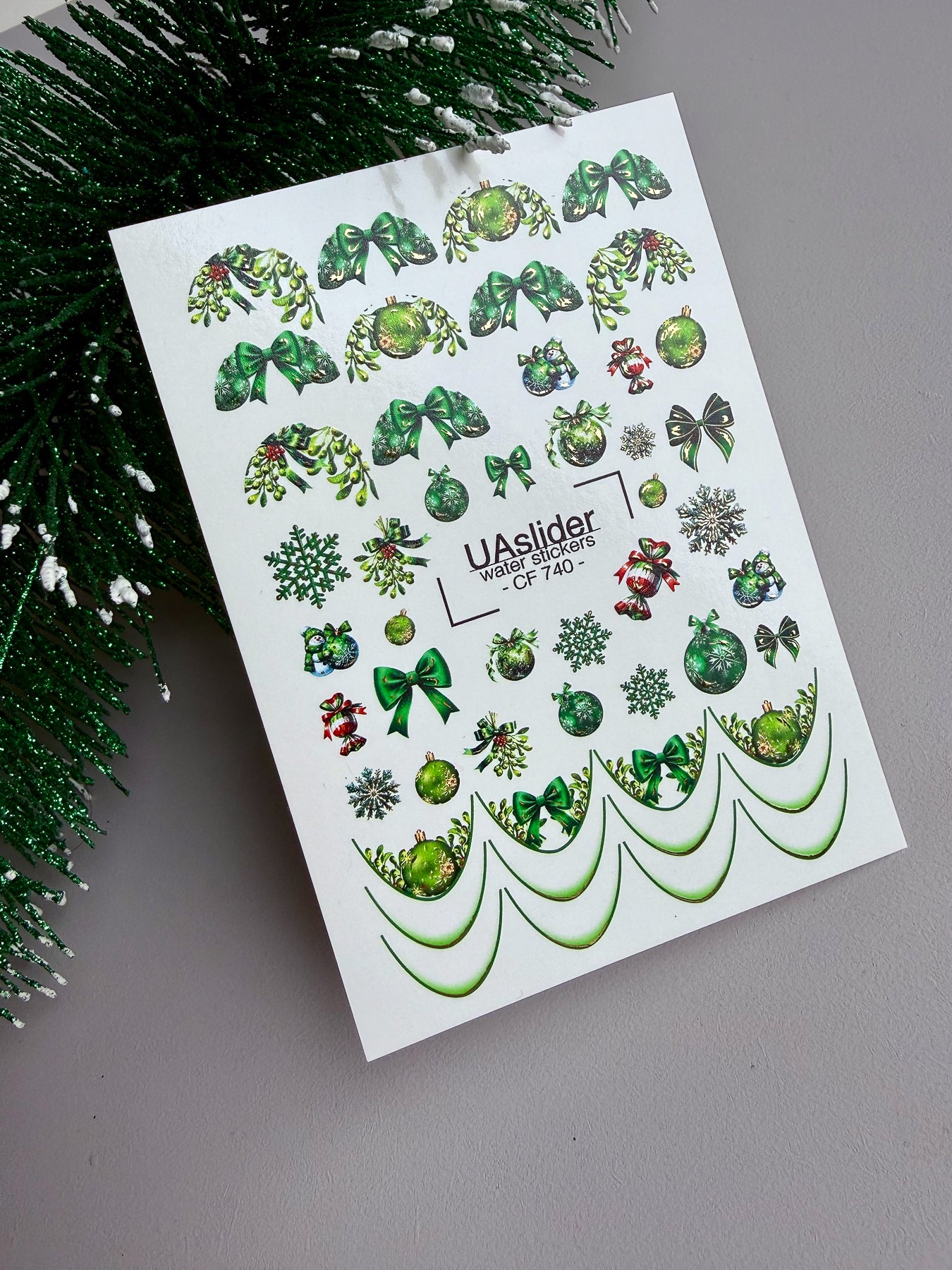 Adesivo per unghie CF-740 | Adesivi per unghie a scivolamento ad acqua | Ornamenti natalizi verdi e fiocchi festiviCF_740