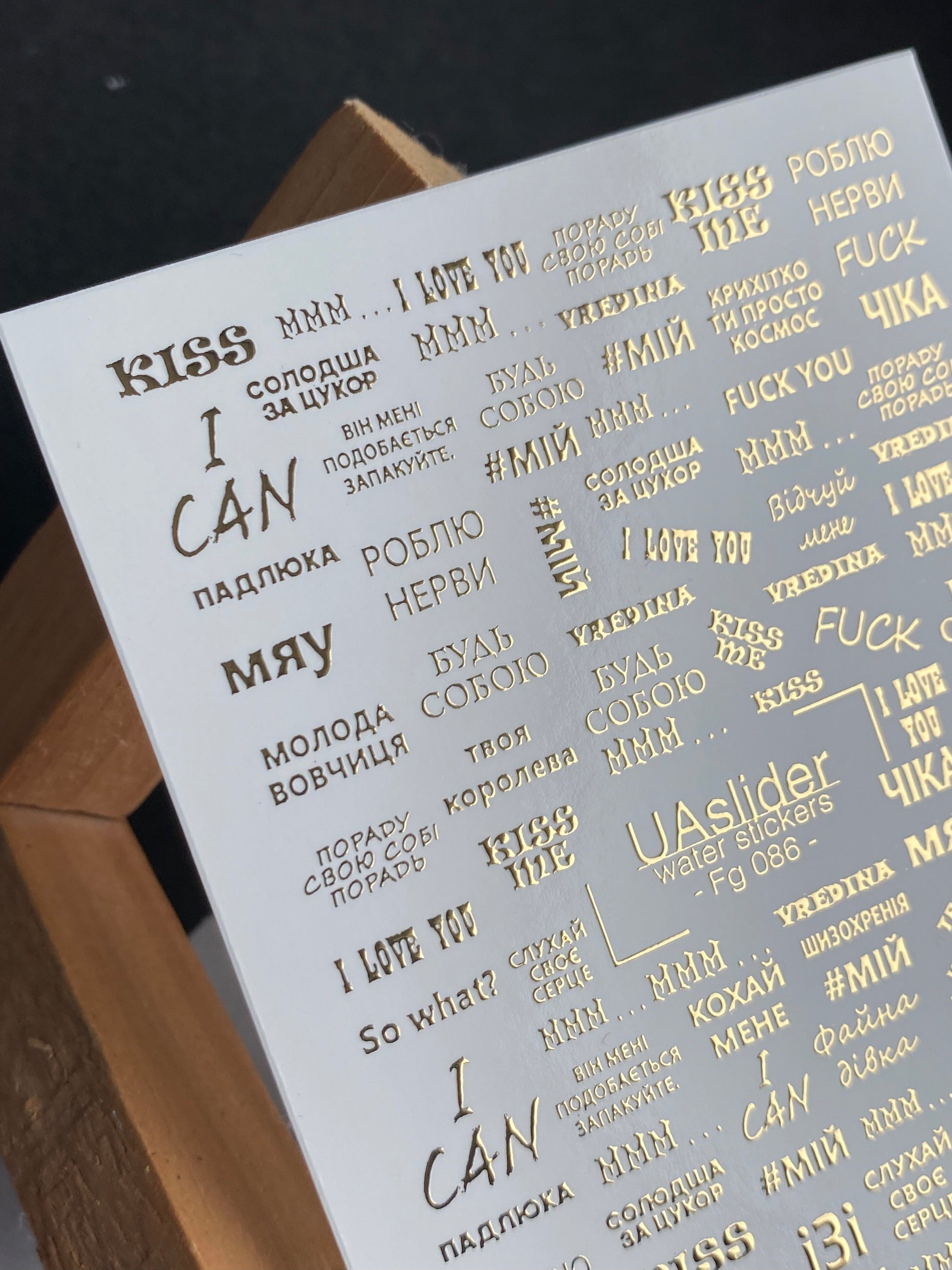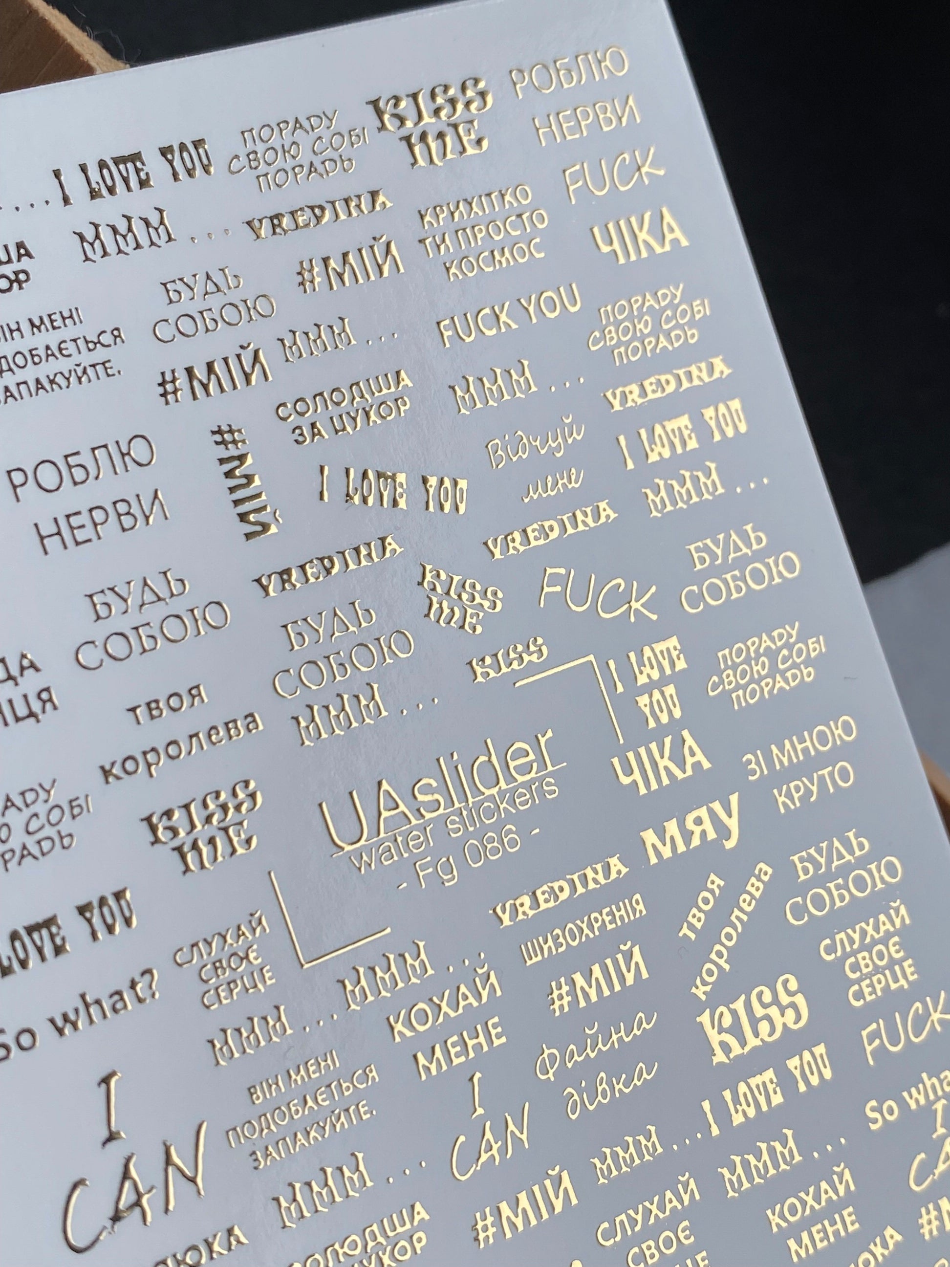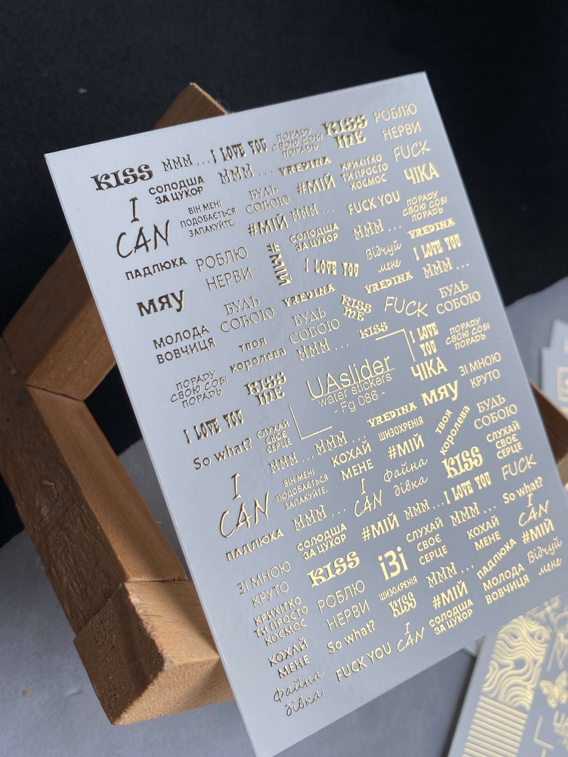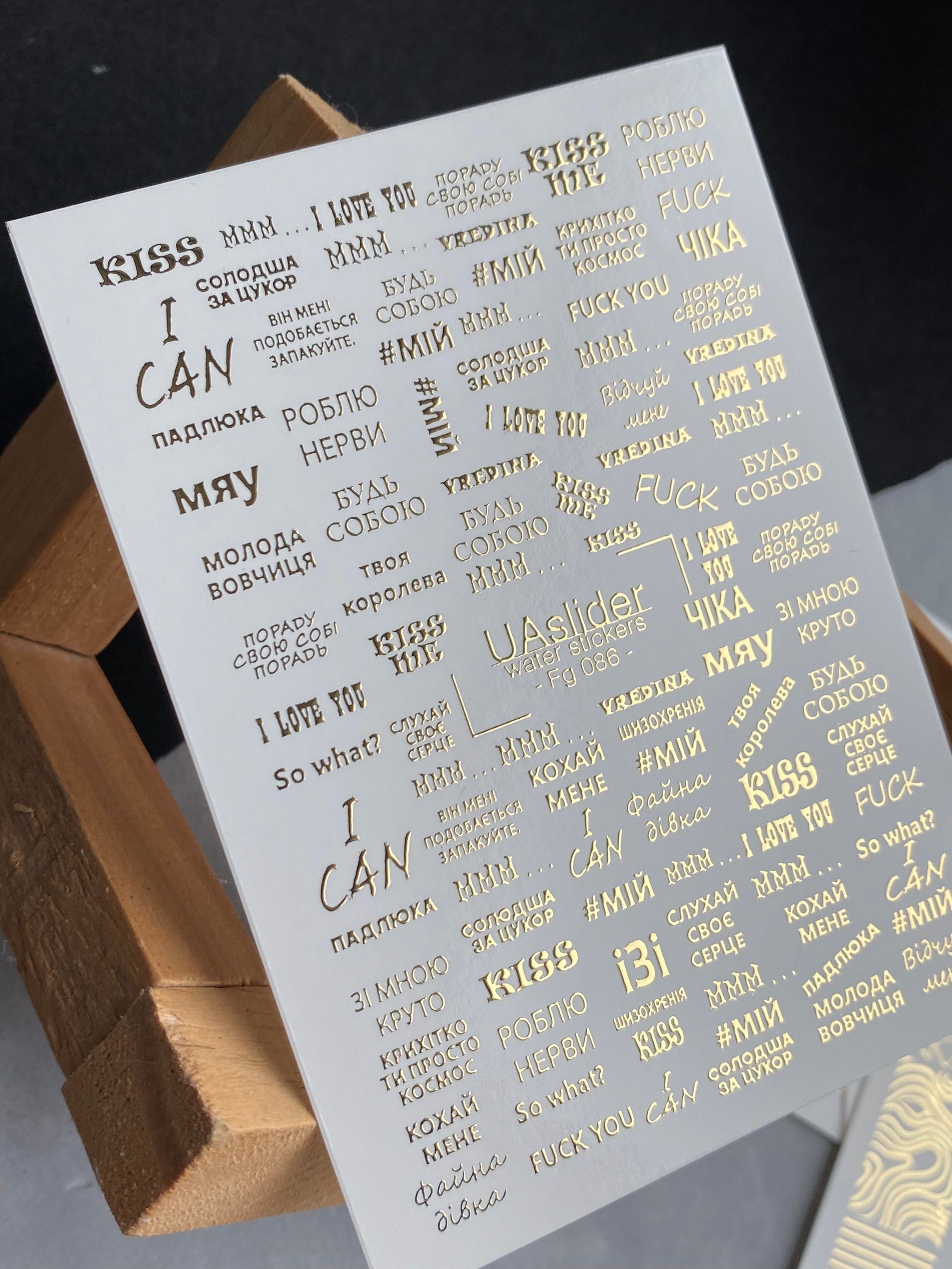 Decalcomanie per unghie a trasferimento ad acqua con foglia d'oro con iscrizioni alla moda e frasi giocose in inglese e ucraino. Da I Love You e Kiss a parole audaci come Будь собою e Мій, questi disegni metallici aggiungono un tocco di stile alla tua manicure.