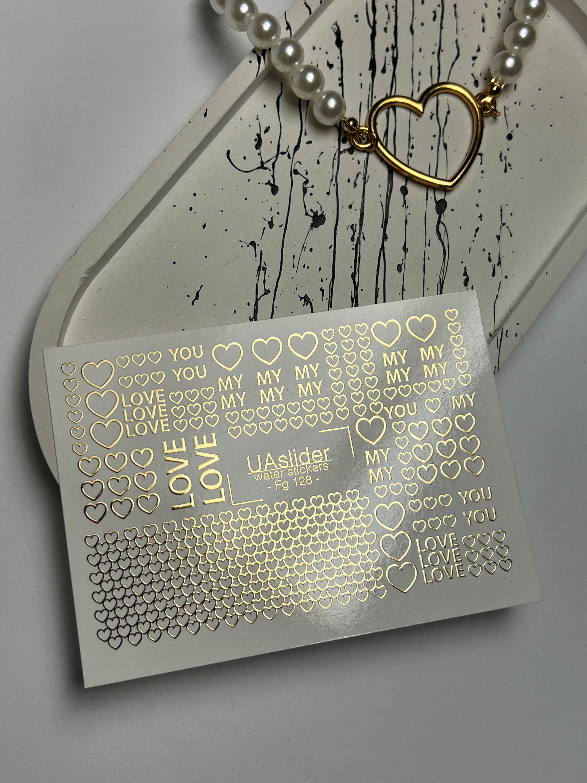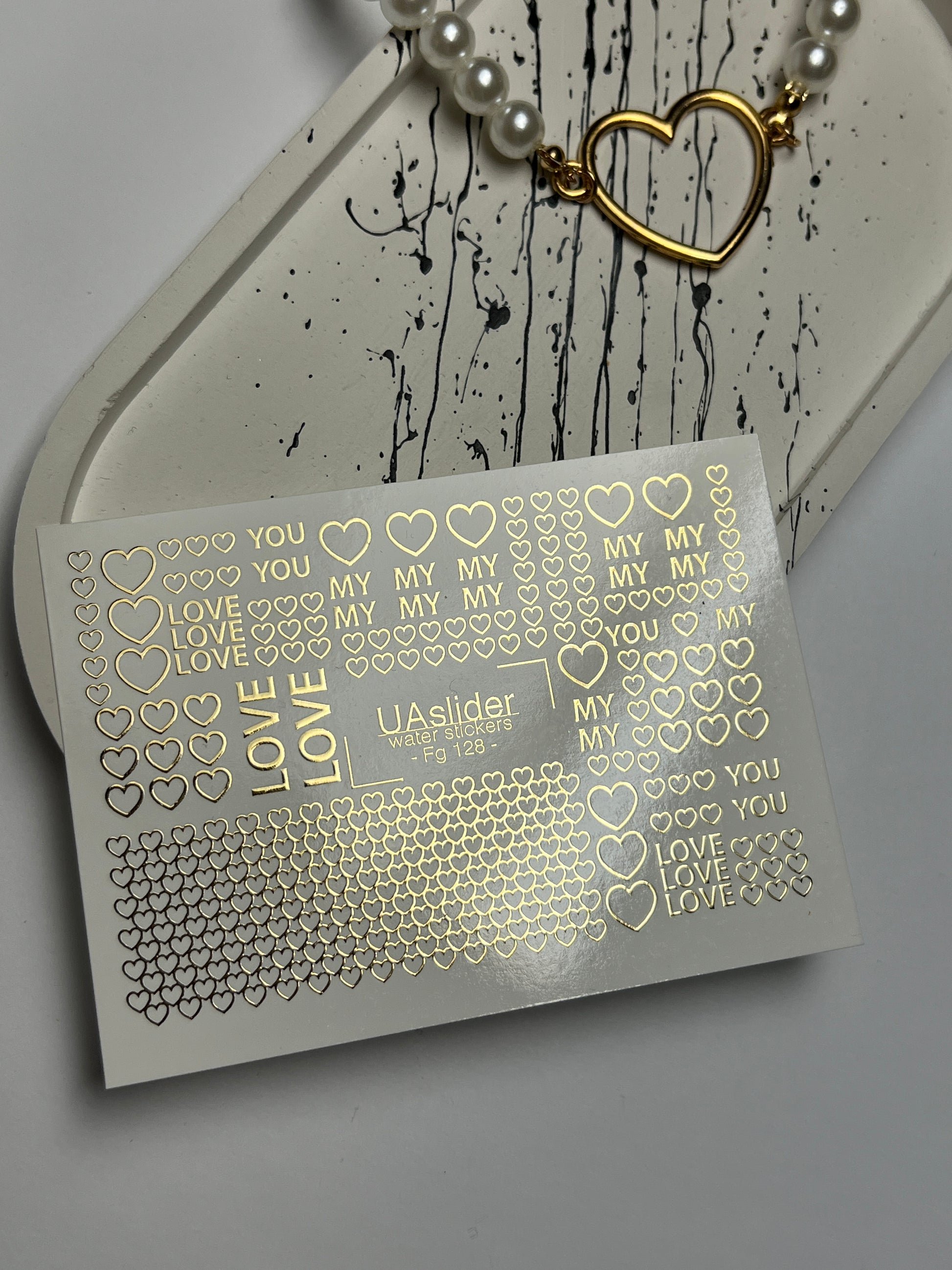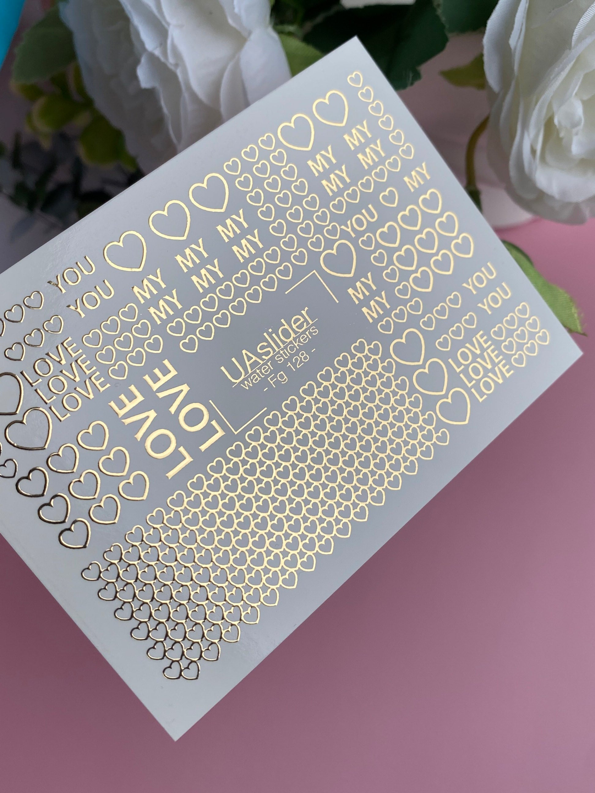 Adesivi per unghie ad acqua Fg-128 | Adesivi per unghie a scivolamento ad acqua con cuori dorati e parole d'amore | Romantico San ValentinoFg_128