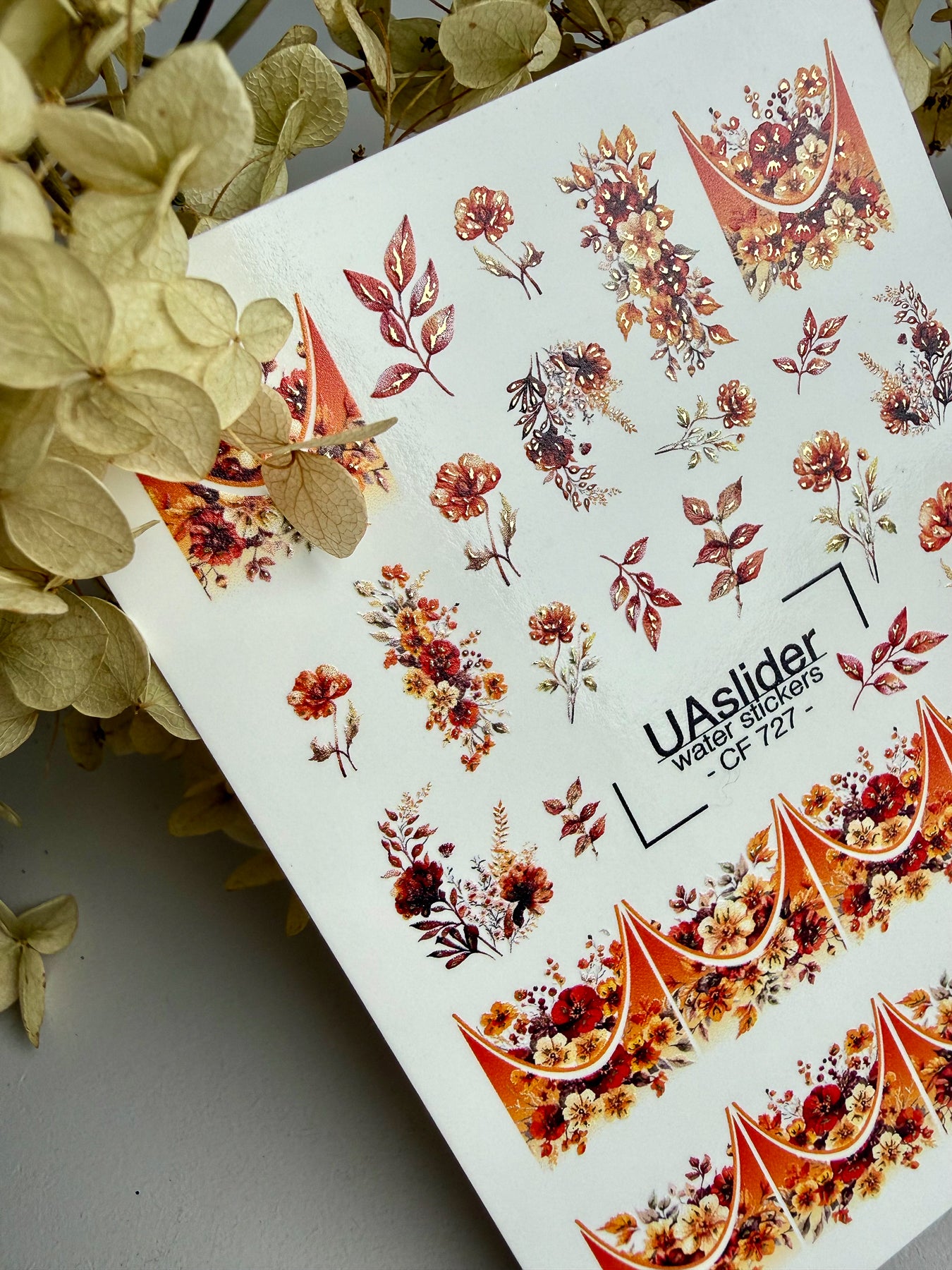 ネイルウォーターデカール CF-727 | ウォータースライドネイルデカール | ゴールデンアーチのある暖かい秋の花柄ネイルアート
