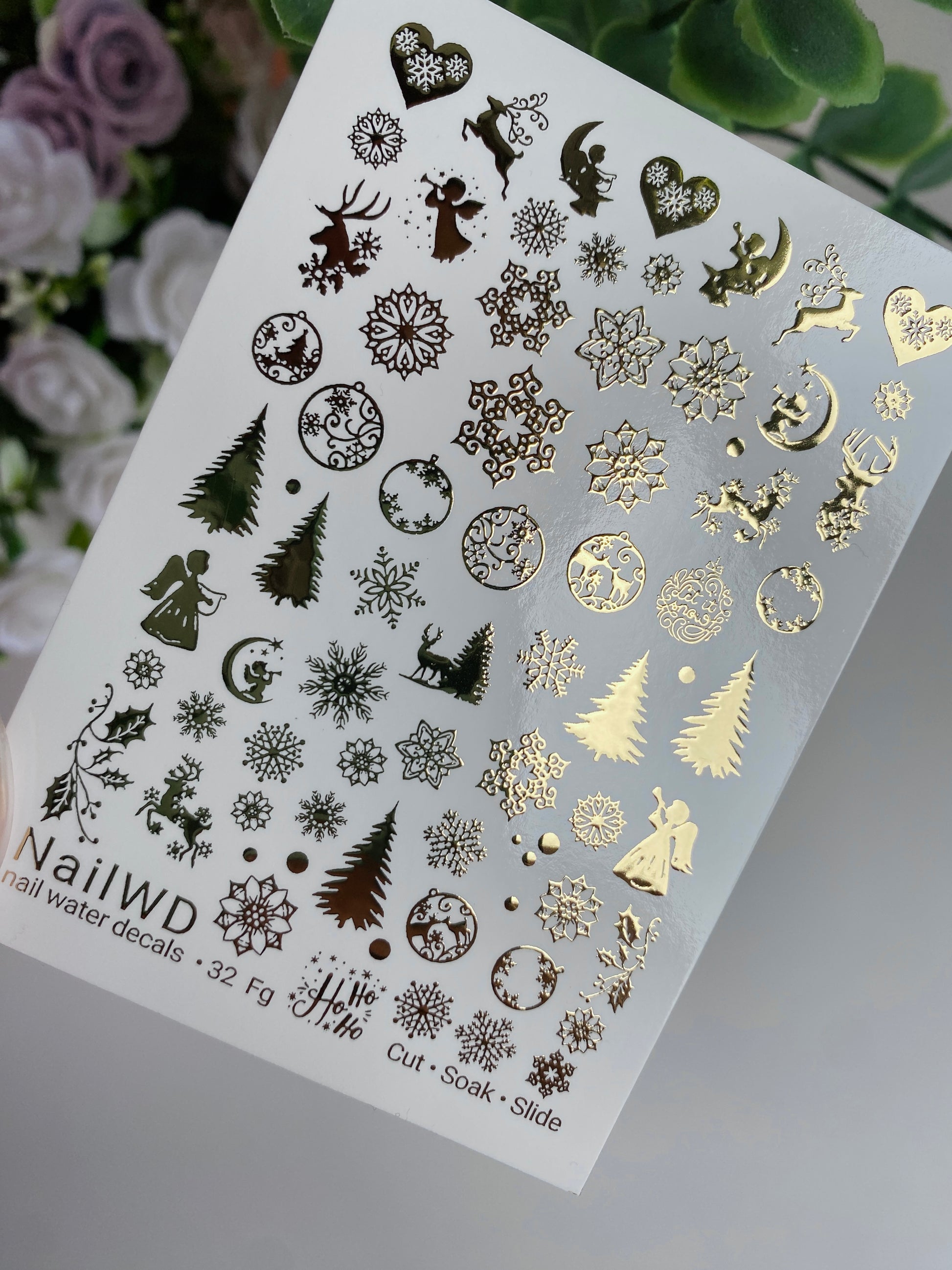 Kalėdiniai vandens lipdukai nagams su elegantiškais auksinio folijos dizainais – elniai, angelai, Kalėdų eglutės, snaigės, širdelės ir šventinės dekoracijos.