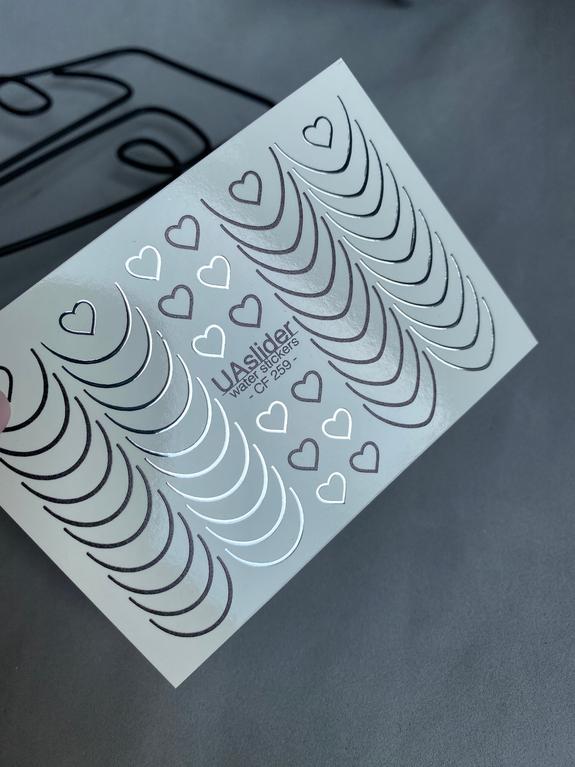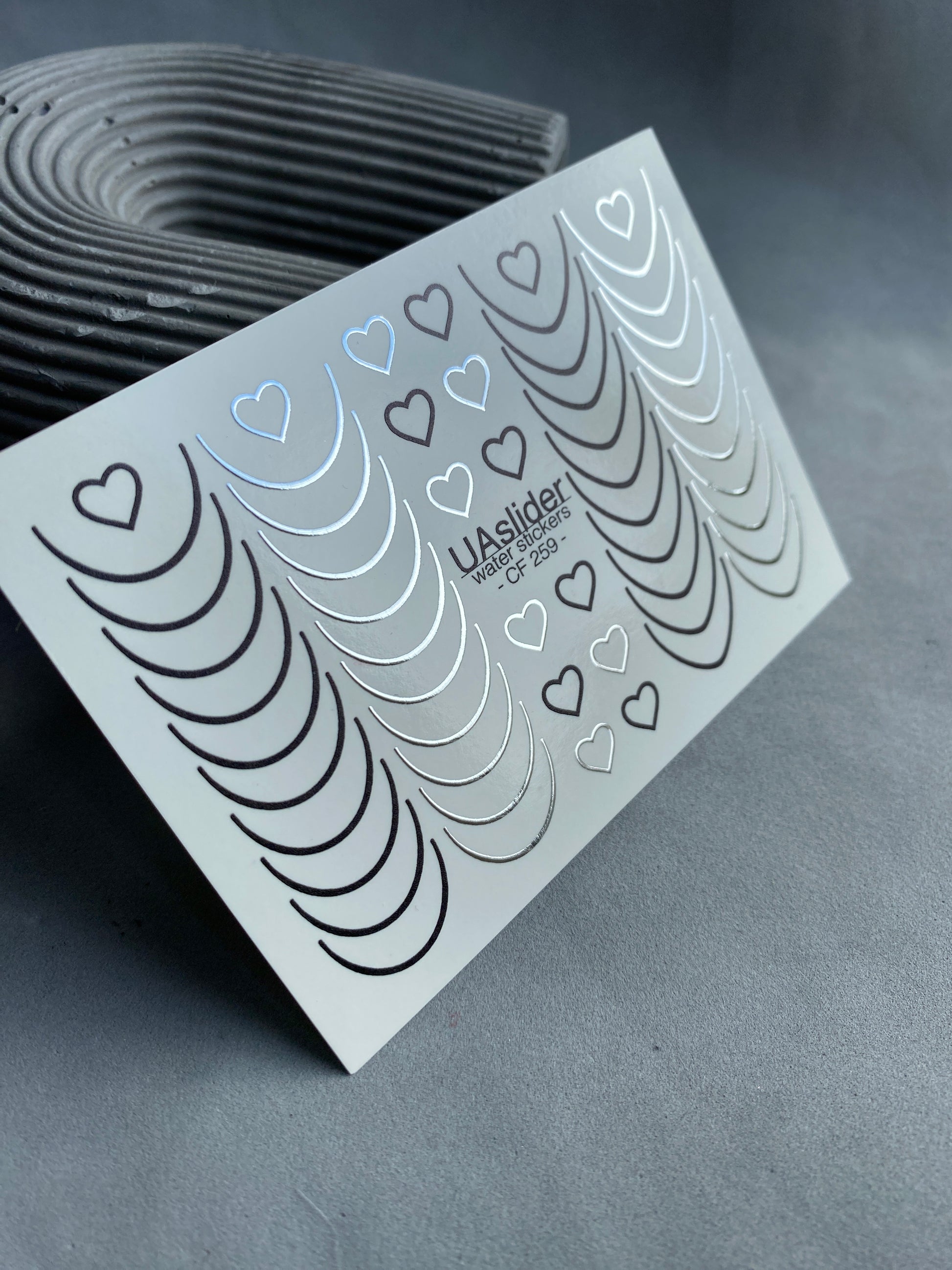 Nagų vandens lipdukas CF-259 | Prancūziški vandens slankiojantys nagų lipdukai | Juodos ir sidabrinės linijos su širdelėmis