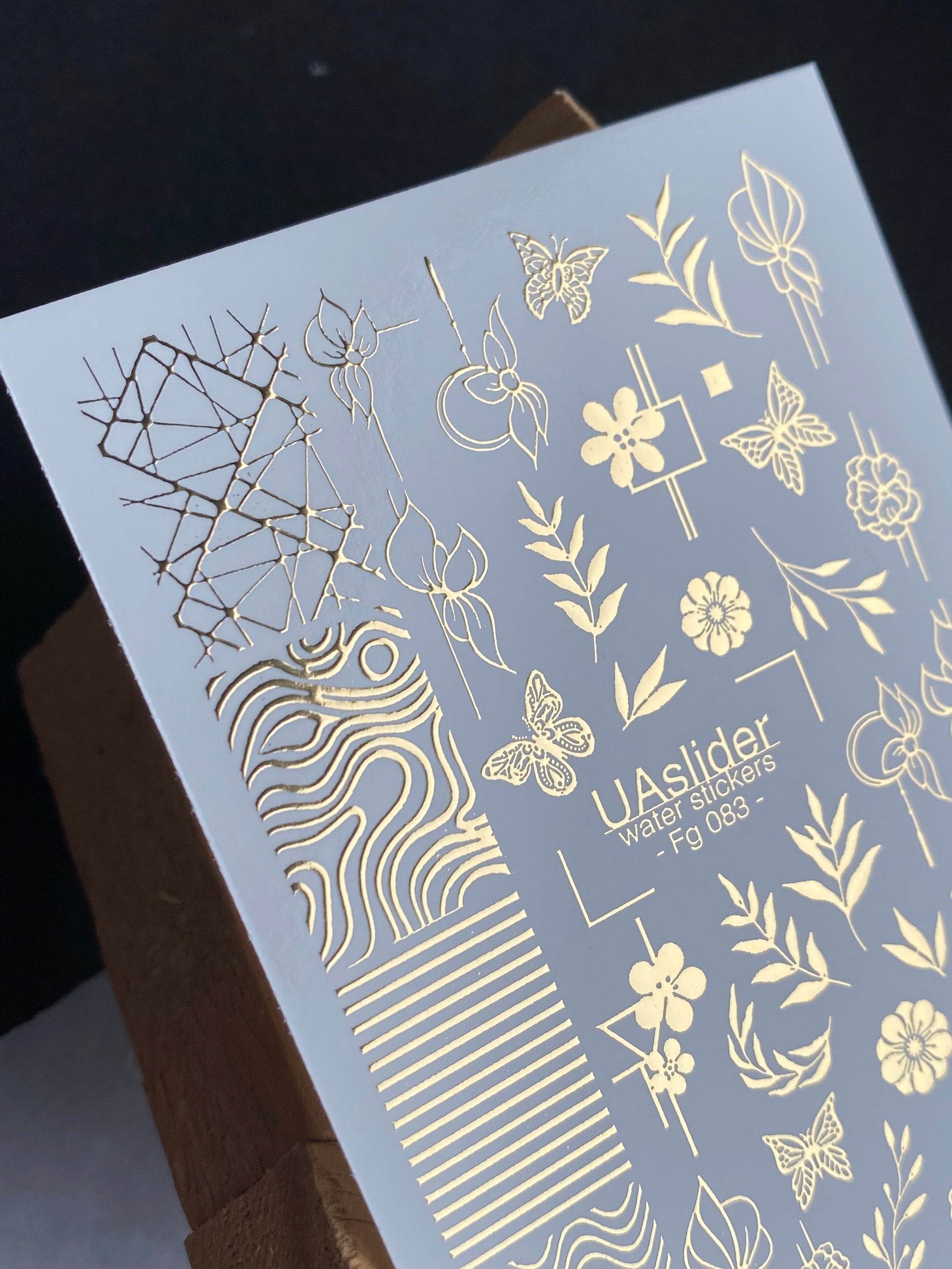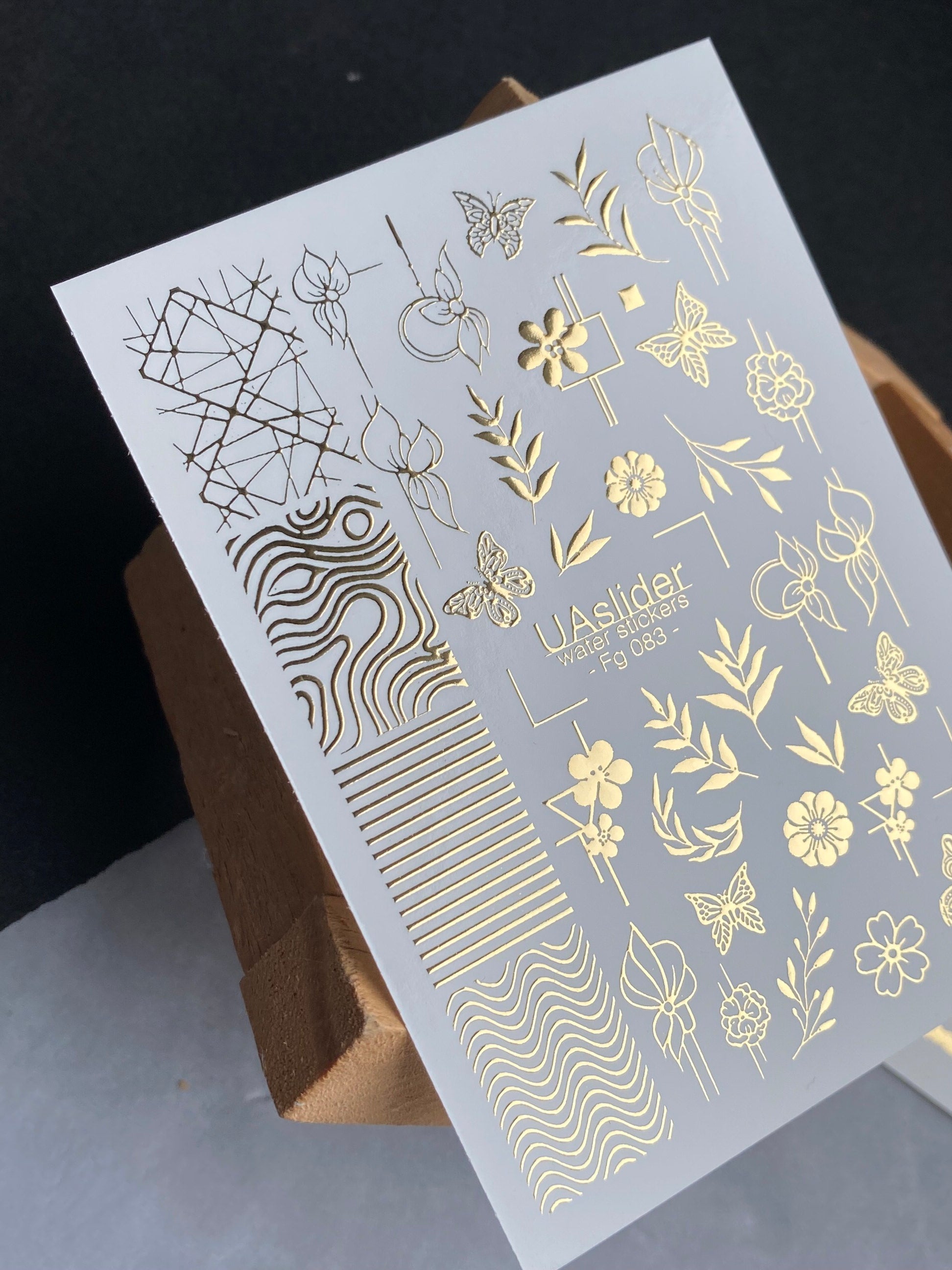 Auksinės folijos vandens lipdukai nagams, kuriuose dera kūrybiškas geometrinių raštų, subtilių gėlių, lapuotų šakelių ir drugelių mišinys. Švarios linijos ir natūralūs motyvai daro šiuos lipdukus puikiais šiuolaikiškoms ir stilingoms manikiūroms.
