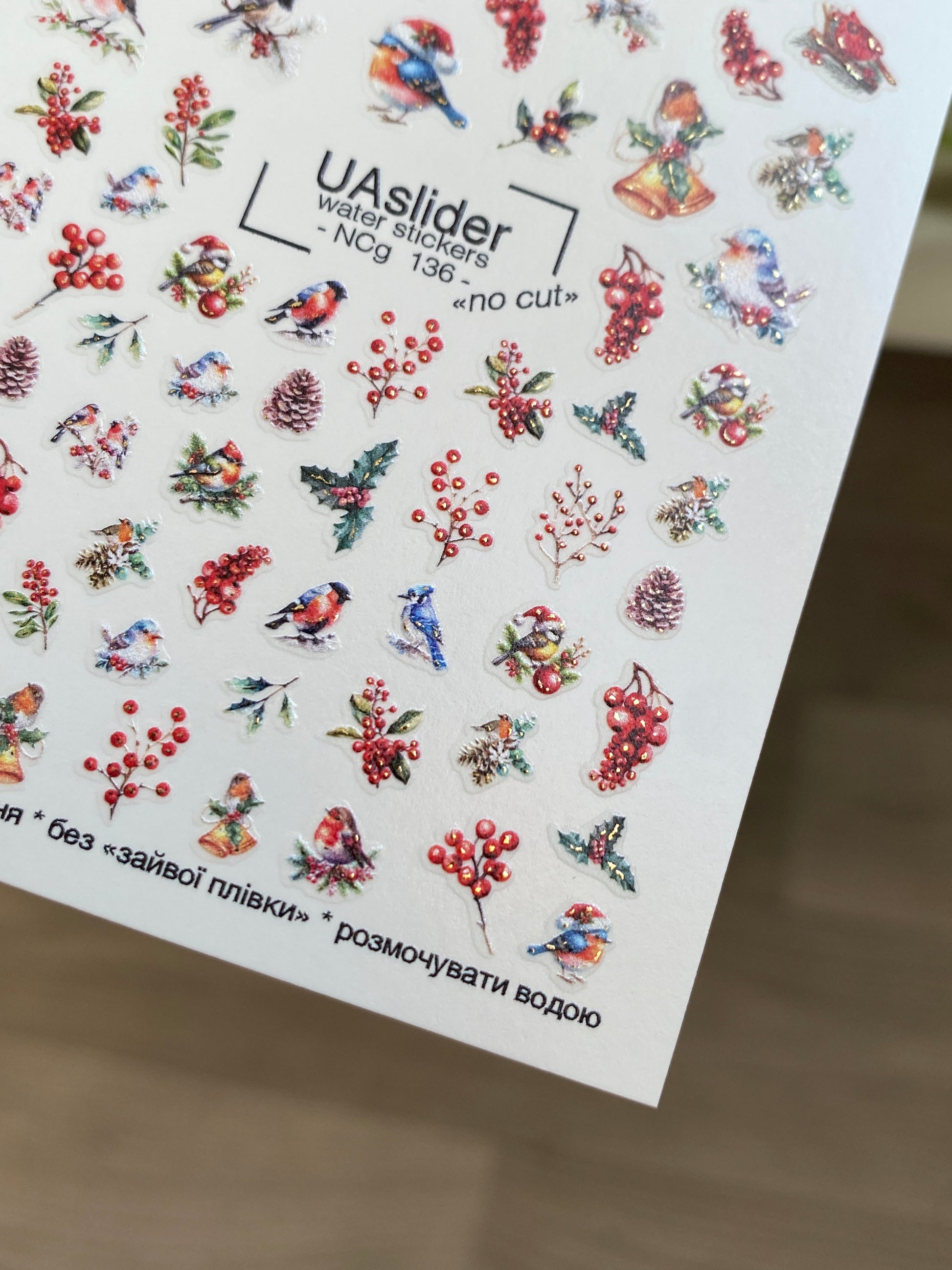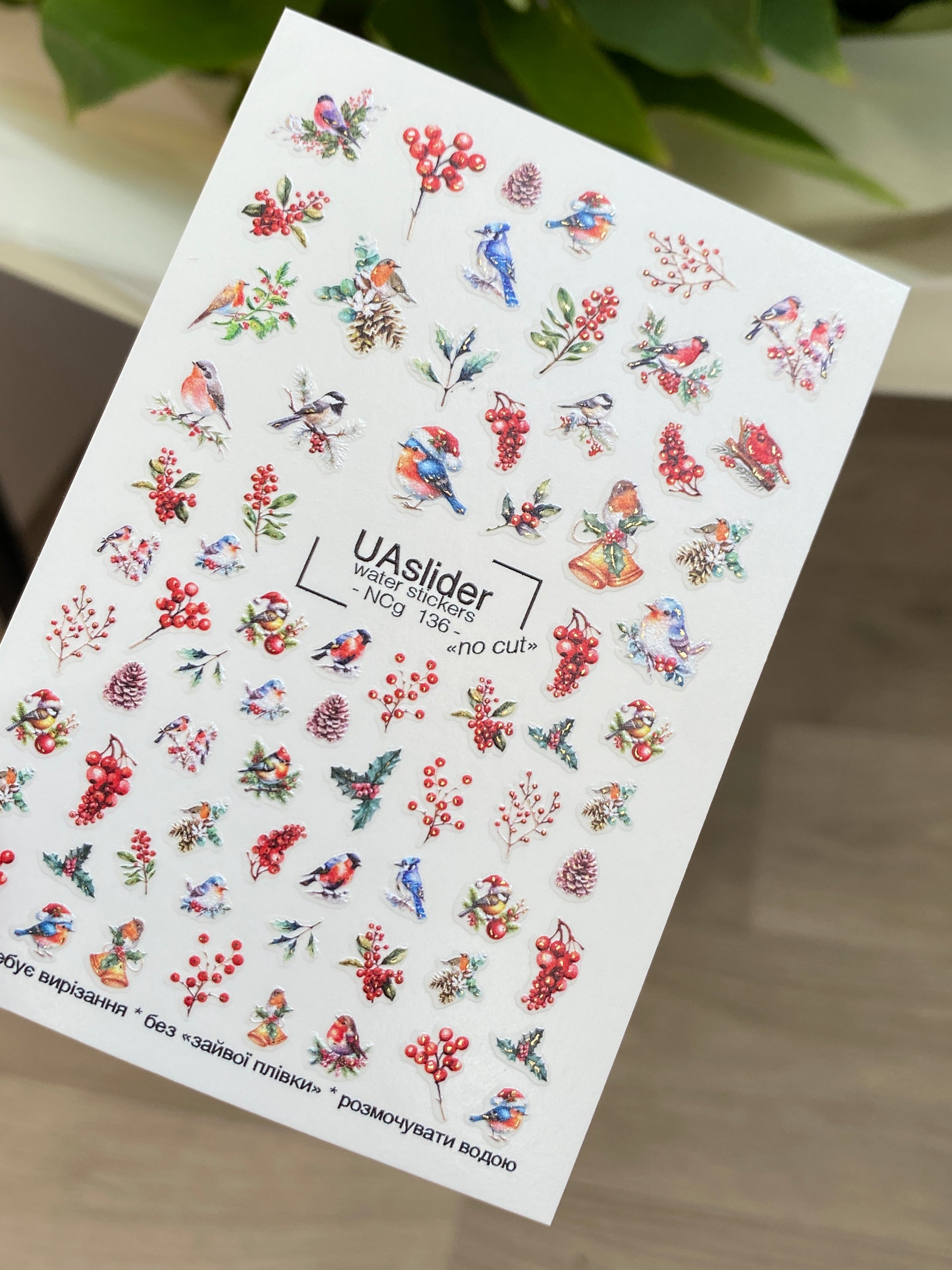Delikatesnės vandens lipdukų nagams su žiemos paukščiais, raudonomis uogomis, kalėdiniais lapais ir pušies kankorėžiais. Šie vandens lipdukai aktyvuojami vandeniu — pamirkykite, kad užteptumėte, o dizainai lengvai slysta ant nagų paviršiaus.
