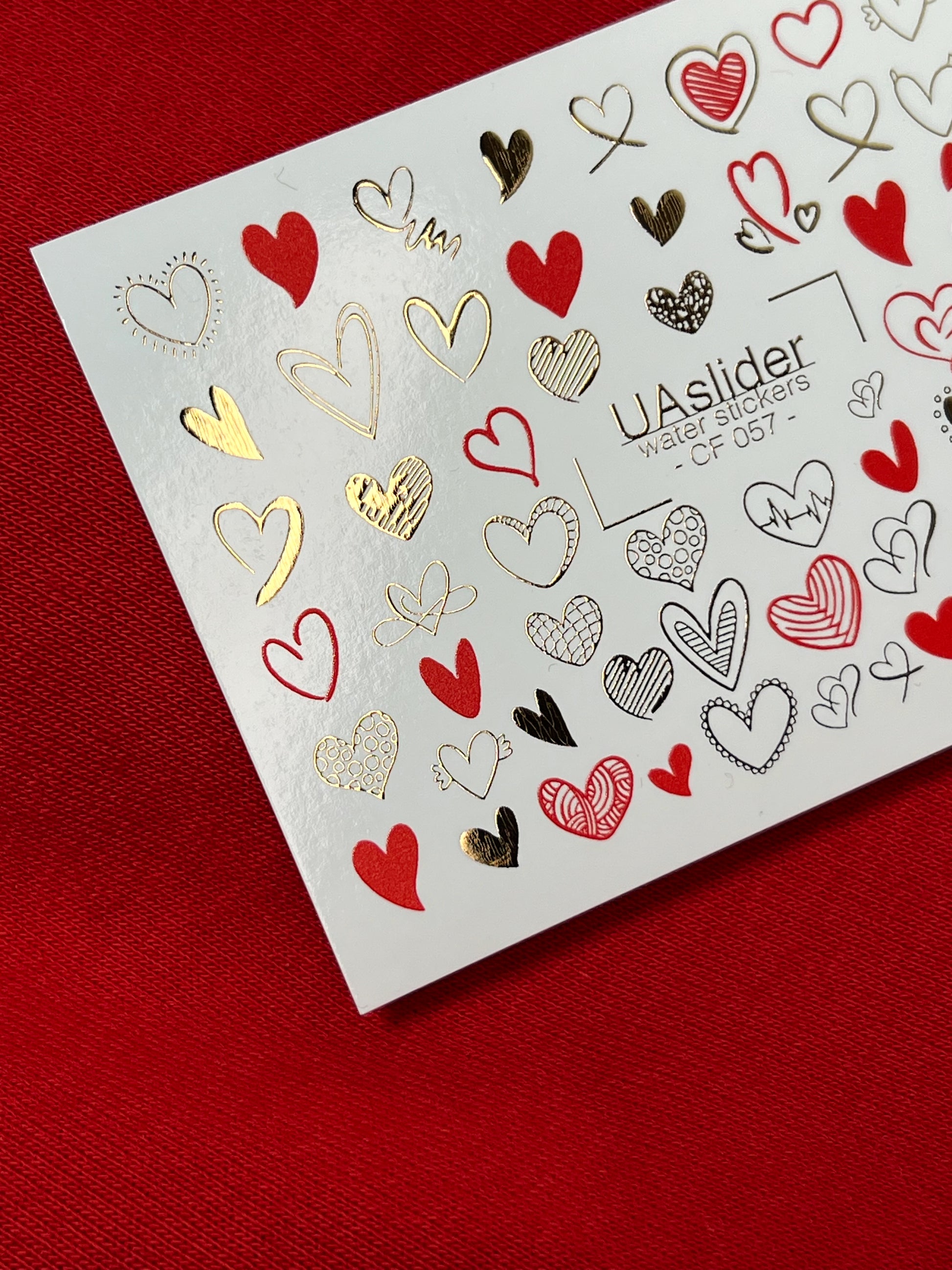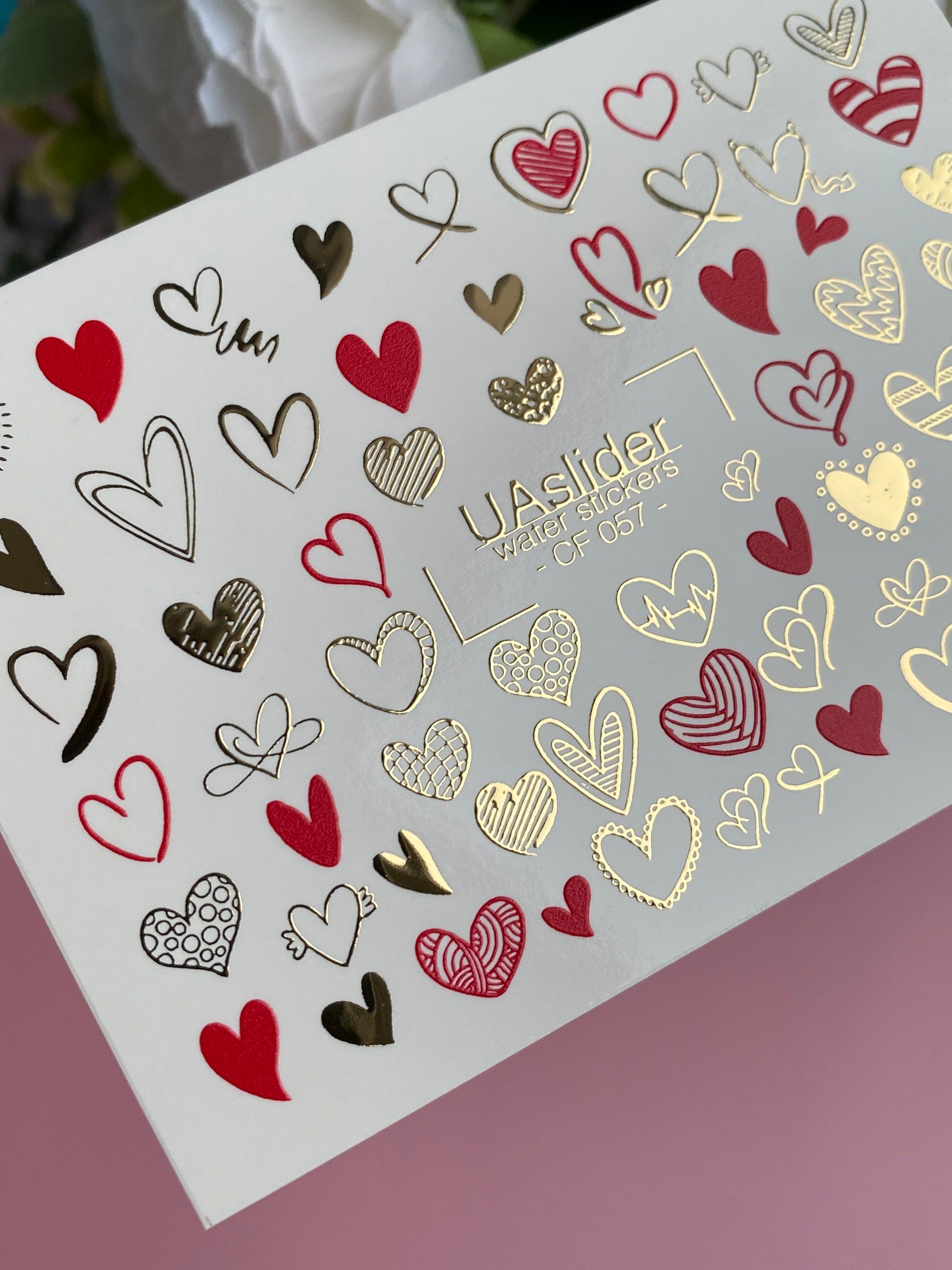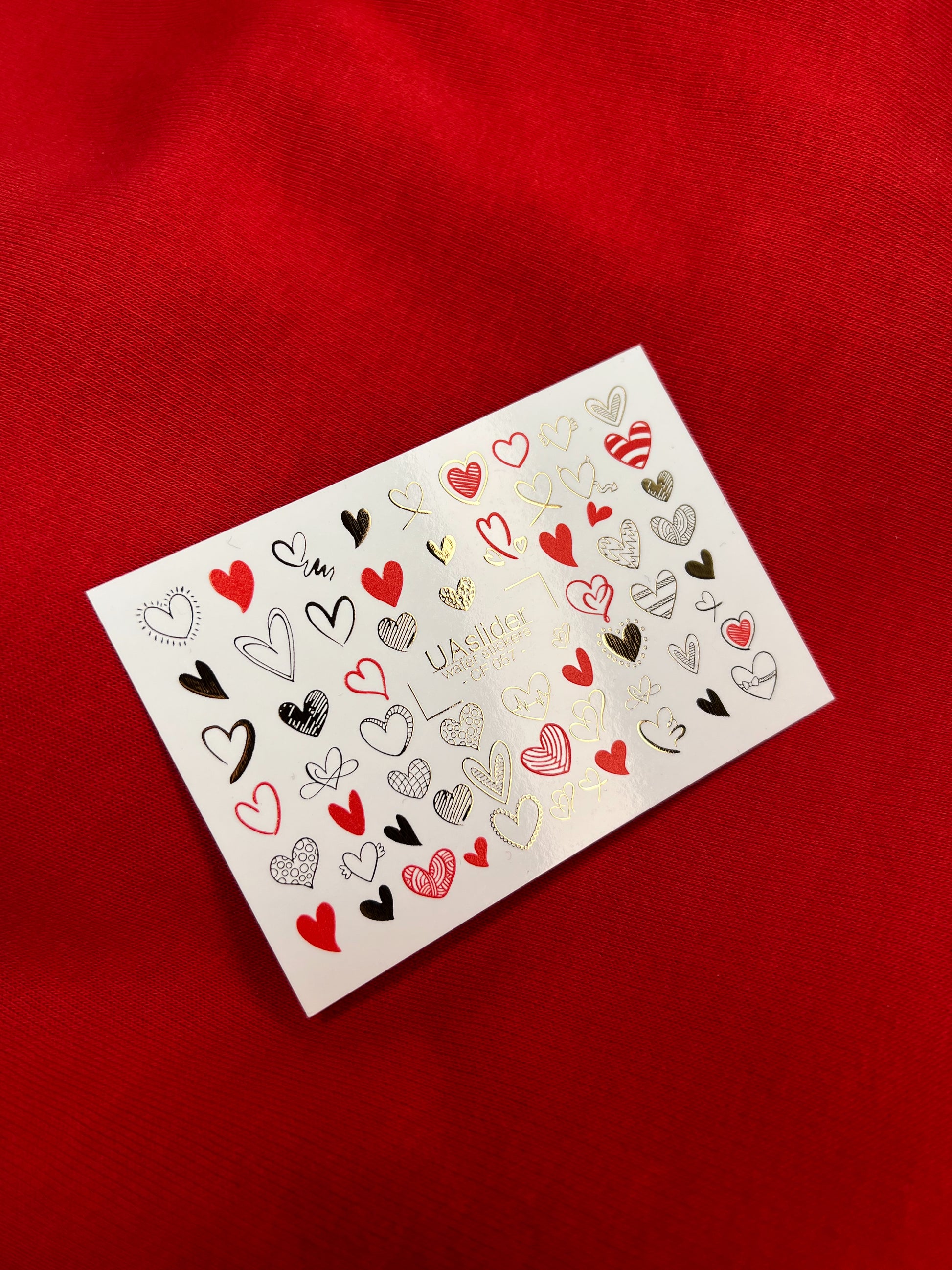 Naklejki wodne na paznokcie z motywem serc, zawierające mieszankę zabawnych i romantycznych wzorów w kolorach czerwonym, czarnym i metalicznym złocie. Zawiera proste szkice, wypełnione serca, paskowane wzory oraz eleganckie kontury do wszechstronnych zdobień paznokci.