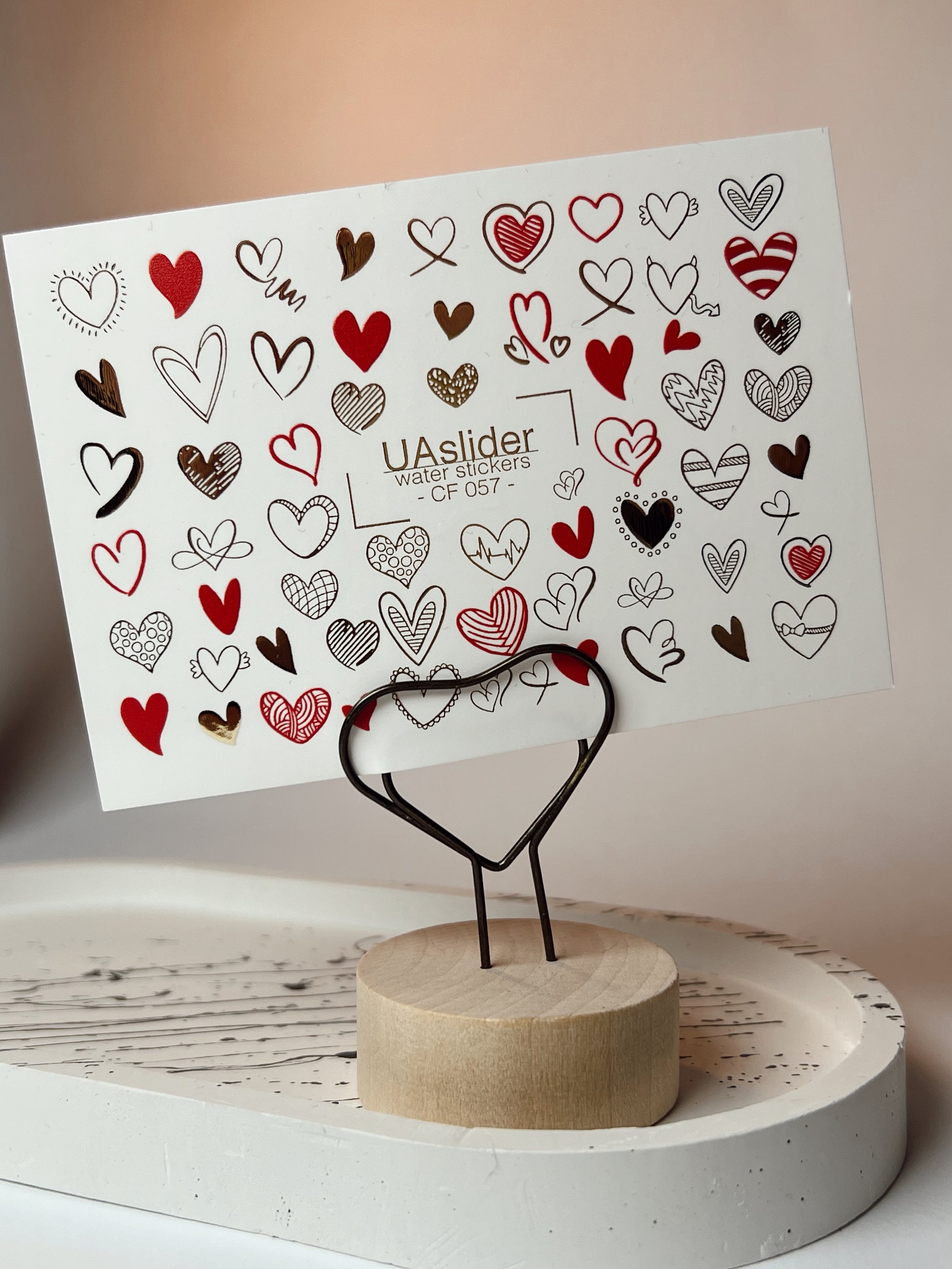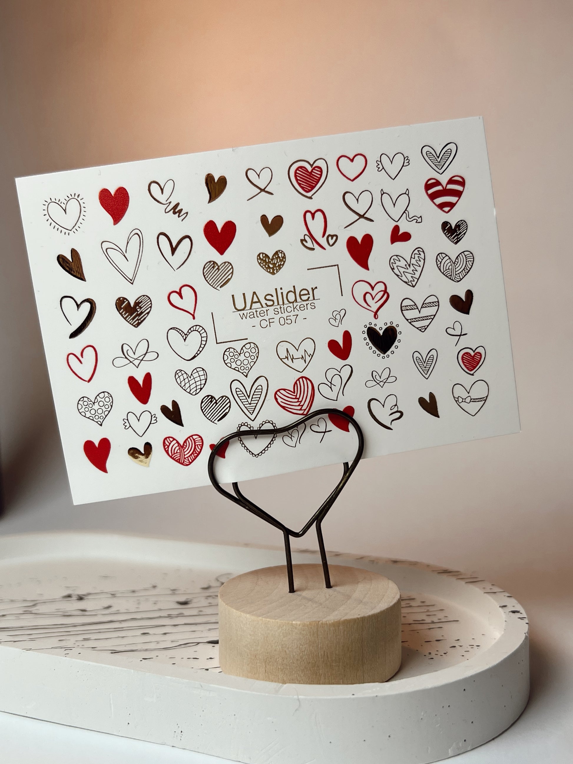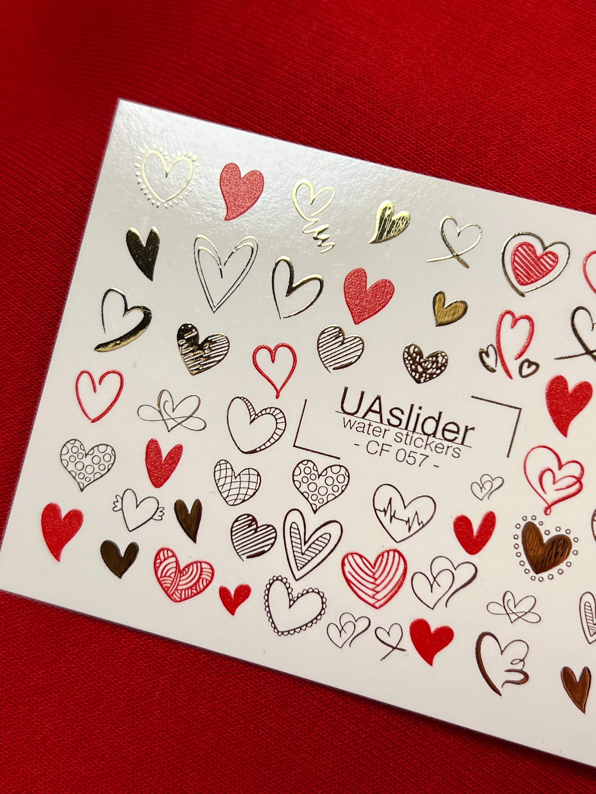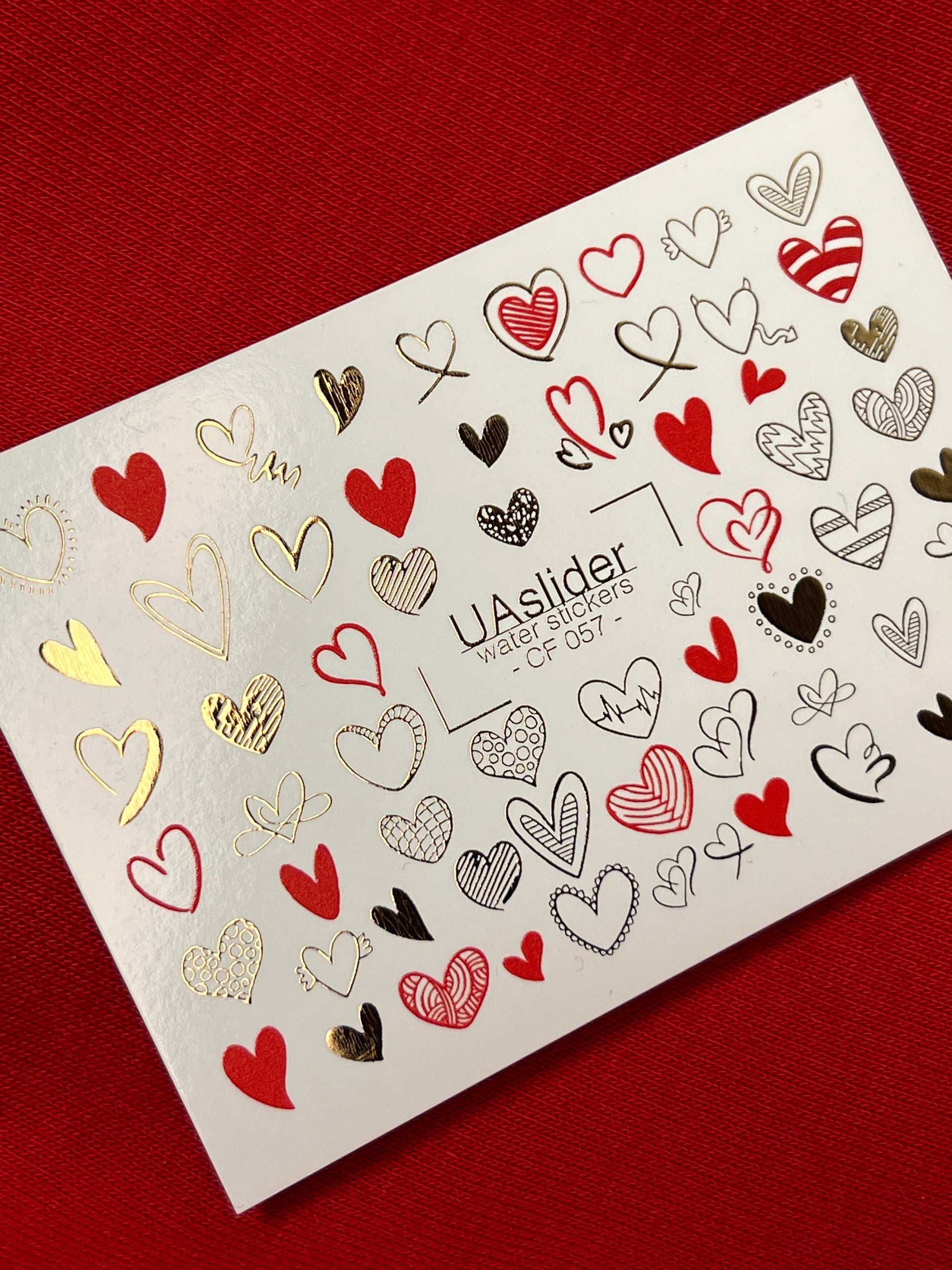 Naklejki wodne na paznokcie z motywem serc, zawierające mieszankę zabawnych i romantycznych wzorów w kolorach czerwonym, czarnym i metalicznym złocie. Zawiera proste szkice, wypełnione serca, paskowane wzory oraz eleganckie kontury do wszechstronnych zdobień paznokci.