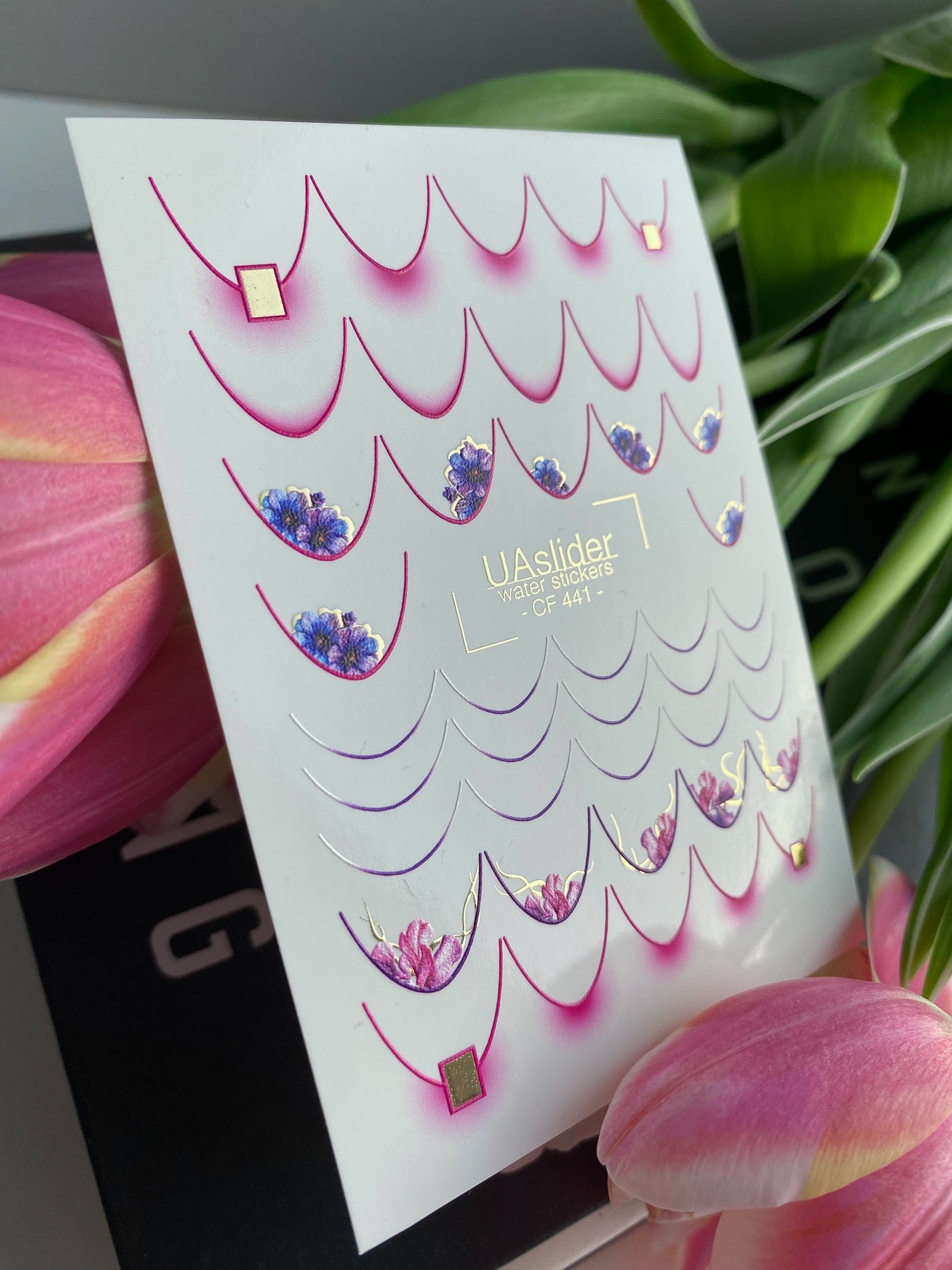 Naklejka na paznokcie CF-441 | Francuskie naklejki wodne na paznokcie | Gradientowe francuskie końcówki z fioletowymi kwiatamiCF_441