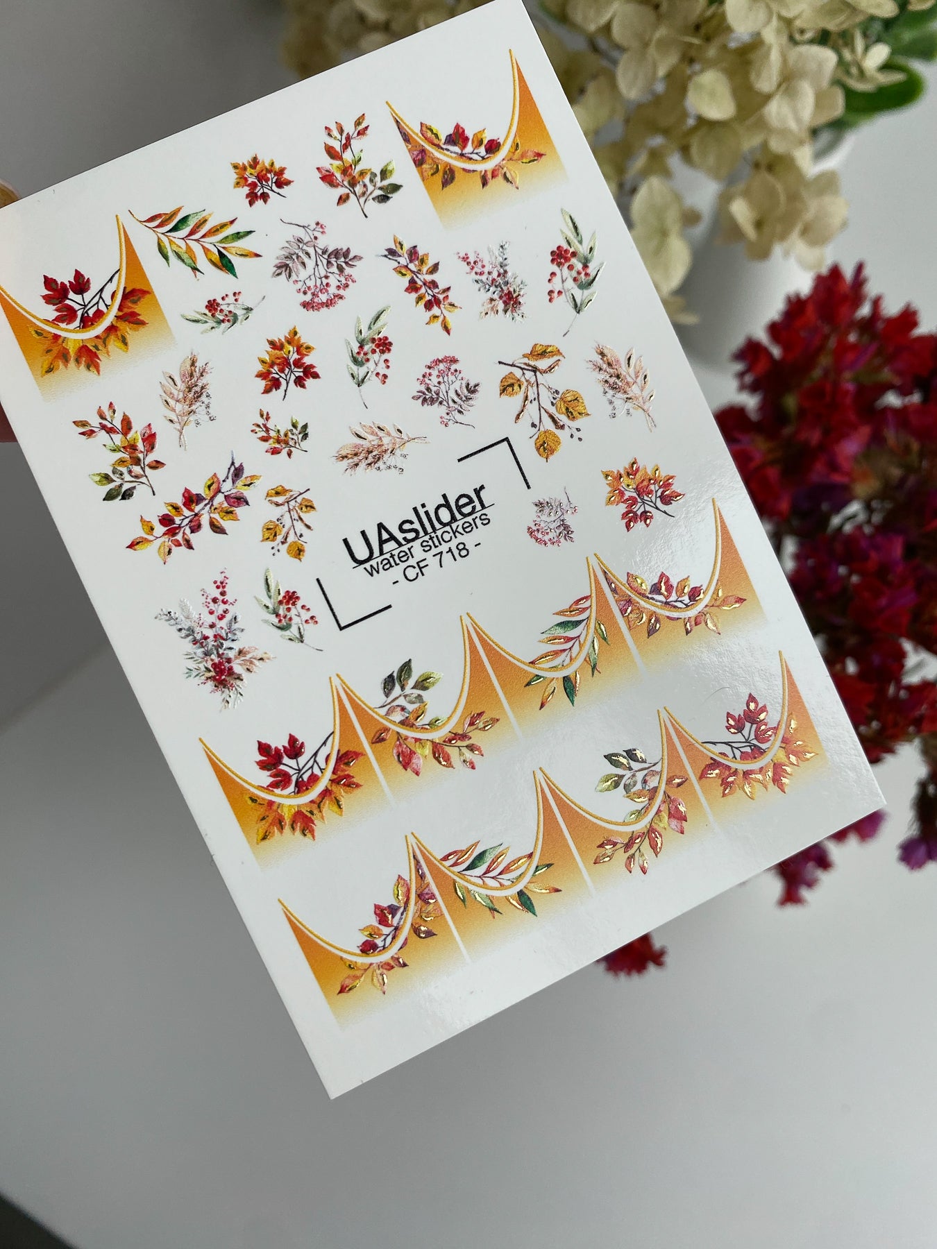 Świętuj piękno jesieni z wodnymi naklejkami na paznokcie przedstawiającymi delikatne kwiatowe liście w ciepłych, sezonowych odcieniach, połączone ze złotymi gradientowymi końcówkami French. Arkusz zawiera łuki w stylu French oraz botaniczne detale, oferując nieograniczone możliwości twórcze dla Twojego manicure.